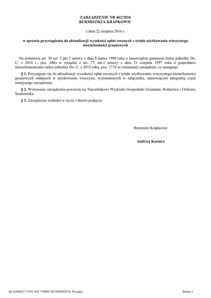 ZARZĄDZENIE NR 462/2016 BURMISTRZA KRAPKOWIC z dnia 22 sierpnia 2016 r. w sprawie przystąpienia do aktualizacji wysokości opłat rocznych z tytułu użytkowania wieczystego nieruchomości gruntowych Na podstawie art. 30 ust. 2 pkt 3 ustawy z dnia 8 marca 1990 roku o samorządzie gminnym (tekst jednolity Dz. U. z 2016 r., poz. 446) w związku z art. 77, ust.1 ustawy z dnia 21 sierpnia 1997 roku o gospodarce nieruchomościami (tekst jednolity Dz. U. z 2015 roku, poz. 1774 ze zmianami) zarządzam, co następuje: § 1. Przystępuje się do aktualizacji wysokości opłat rocznych z tytułu użytkowania wieczystego nieruchomości gruntowych oddanych w użytkowanie wieczyste, wymienionych w załączniku, stanowiącym integralną część niniejszego zarządzenia. § 2. Wykonanie zarządzenia powierza się Naczelnikowi Wydziału Gospodarki Gruntami, Rolnictwa i Ochrony Środowiska. § 3. Zarządzenie wchodzi w życie z dniem podjęcia. Burmistrz Krapkowic Andrzej Kasiura Id: 62860217-1931-43C7-9004-7EC03F85EF16. Przyjęty Strona 1 lp 1 2 3 4 5 6 7 8 9 10 11 mapa, nr działki m. 12, dz. 18/23 m. 12, dz. 18/24 m. 12, dz. 18/22 m. 12, dz. 18/1 m. 12, dz. 20/29 m. 13, dz. 820/14 m. 12, dz. 25/13 m. 10, dz. 81/3 m. 11, dz. 59/42 m. 11, dz. 59/51 m. 8, dz. 143 Obręb Krapkowice Krapkowice Krapkowice Krapkowice Krapkowice Krapkowice Krapkowice Krapkowice Krapkowice Krapkowice Krapkowice Załącznik do Zarządzenia Nr 462/2016 Burmistrza Krapkowic z dnia 22 sierpnia 2016 roku powierzchnia [ha] KW 0,0067 OP1S/00059587/4 0,0953 OP1S/00017980/3 0,0754 OP1S/00018654/6 0,0906 OP1S/00019769/2 1,3363 OP1S/00033144/9 0,0204 OP1S/00060484/2 2,3290 OP1S/00029266/9 2,2946 OP1S/00056734/9 1,3555 OP1S/00059359/7 0,4393 0,2263 OP1S/00052170/9 Id: 62860217-1931-43C7-9004-7EC03F85EF16. Przyjęty Strona 2