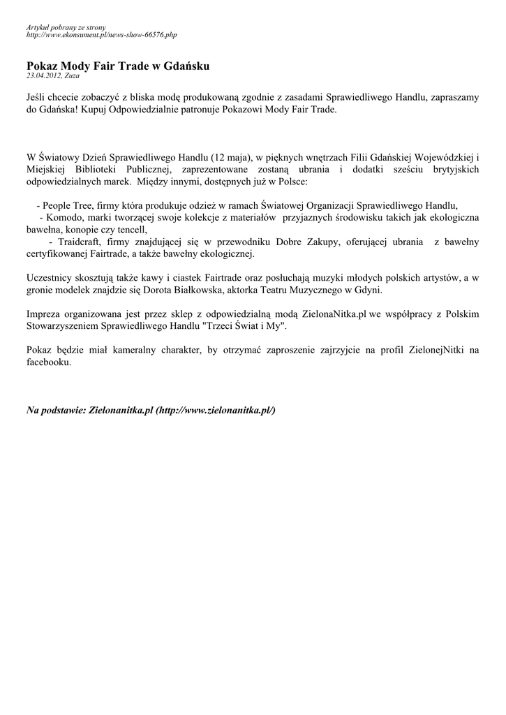 Artykuł pobrany ze strony http://www.ekonsument.pl/news-show-66576.php Pokaz Mody Fair Trade w Gdańsku 23.04.2012, Zuza Jeśli chcecie zobaczyć z bliska modę produkowaną zgodnie z zasadami Sprawiedliwego Handlu, zapraszamy do Gdańska! Kupuj Odpowiedzialnie patronuje Pokazowi Mody Fair Trade. W Światowy Dzień Sprawiedliwego Handlu (12 maja), w pięknych wnętrzach Filii Gdańskiej Wojewódzkiej i Miejskiej Biblioteki Publicznej, zaprezentowane zostaną ubrania i dodatki sześciu brytyjskich odpowiedzialnych marek. Między innymi, dostępnych już w Polsce: - People Tree, firmy która produkuje odzież w ramach Światowej Organizacji Sprawiedliwego Handlu, - Komodo, marki tworzącej swoje kolekcje z materiałów przyjaznych środowisku takich jak ekologiczna bawełna, konopie czy tencell, - Traidcraft, firmy znajdującej się w przewodniku Dobre Zakupy, oferującej ubrania z bawełny certyfikowanej Fairtrade, a także bawełny ekologicznej. Uczestnicy skosztują także kawy i ciastek Fairtrade oraz posłuchają muzyki młodych polskich artystów, a w gronie modelek znajdzie się Dorota Białkowska, aktorka Teatru Muzycznego w Gdyni. Impreza organizowana jest przez sklep z odpowiedzialną modą ZielonaNitka.pl we współpracy z Polskim Stowarzyszeniem Sprawiedliwego Handlu "Trzeci Świat i My". Pokaz będzie miał kameralny charakter, by otrzymać zaproszenie zajrzyjcie na profil ZielonejNitki na facebooku. Na podstawie: Zielonanitka.pl (http://www.zielonanitka.pl/)