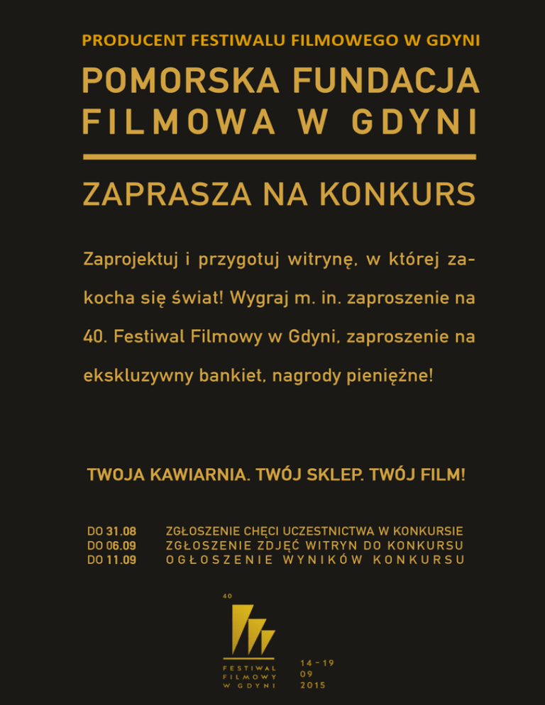Gdynia, 28.07.2015 Festiwal Filmowy w Gdyni Regulamin konkursu na witrynę 40. Festiwalu Filmowego w Gdyni §1 Organizatorem konkursu jest Producent Festiwalu Filmowego w Gdyni - Pomorska Fundacja Filmowa w Gdyni, z siedzibą Plac Grunwaldzki 2, 81-365 Gdynia, NIP 586-21-47-548, zwana dalej Organizatorem. Konkurs organizowany jest w ramach 40. Festiwalu Filmowego w Gdyni. §2 Celem konkursu jest zaktywizowanie społeczności miasta Gdynia, prywatnych przedsiębiorców i mieszkańców miasta do udziału w promocji największego wydarzenia kulturalnego Gdyni – Festiwalu Filmowego. §3 Temat konkursu: Festiwal Filmowy w Gdyni. 40 lat minęło! §4 Regulamin konkursu jest dostępny w siedzibie Organizatora oraz na stronie internetowej www.festiwalgdynia.pl Szczegółowe informacje o konkursie można uzyskać pod numerem telefonu: 531 100 655 lub za pośrednictwem poczty elektronicznej: [email protected] §5 W konkursie mogą uczestniczyć właściciele firm, sklepów, kawiarni i restauracji oraz prowadzący inną działalność na terenie miasta Gdynia, których siedziba posiada witrynę. Gdynia, 28.07.2015 §6 Warunki uczestnictwa 1. Uczestnik konkursu może zgłosić do konkursu jeden lub więcej obiektów. 2. Zgłoszenia udziału w konkursie można dokonać do 31.08.2015 droga mailową na adres [email protected] lub osobiście w siedzibie organizatora. 3. Witryna obiektu zgłoszonego do konkursu musi być przygotowana w nawiązaniu do tematyki współczesnego polskiego kina. 4. Komisja Konkursowa będzie oceniała pomysłowość i jakość wykonania, walory estetyczne oraz oryginalność. Istotne jest także, by witryna zwracała uwagę przechodniów i klientów. 5. Elementy obowiązkowe, które muszą się znaleźć w witrynie: a. Nazwa: Festiwal Filmowy w Gdyni b. Daty Festiwalu: 14 - 19 września c. Logo Festiwalu Filmowego w Gdyni 6. Uczestnicy mogą wykorzystać materiały przygotowane przez Organizatora lub posłużyć się materiałami pozyskanymi z innych źródeł. 7. Po wykonaniu witryny należy wykonać i przesłać do Organizatora minimum trzy zdjęcia witryny: a. Ujęcie z widokiem ulicy i okolicznych budynków b. Ujęcie witryny w całym kadrze c. Ujęcie detali 8. Do zdjęć należy dołączyć następujące dane zgłaszającego: imię i nazwisko, adres do korespondencji i telefon kontaktowy oraz pisemne oświadczenie o wyrażeniu zgody na przetwarzanie danych osobowych do celów niezbędnych do realizacji Konkursu, zgodnie z ustawą z dnia 29 sierpnia 1997 roku o ochronie danych osobowych (Dz. U. z 2012 nr 101, poz. 926 z późn. zm.). §7 Termin i warunki nadsyłania zdjęć 1. Zdjęcia witryny należy przesłać pocztą lub pocztą elektroniczną na adres: Pomorska Fundacja Filmowa w Gdyni, Plac Grunwaldzki 2, 81-365 Gdynia, [email protected] do dnia 6 września 2015 (decyduje data doręczenia). 2. Zdjęcia przesłane po terminie nie będą brane pod uwagę. 3. Organizator zastrzega sobie prawo wydłużenia terminu nadsyłania zdjęć. 4. Zdjęcia przechodzą na własność Organizatora i nie będą odsyłane. 5. Uczestnik przenosi na Organizatora pełne autorskie prawa majątkowe do zdjęć witryny. Gdynia, 28.07.2015 §8 Zasady przyznawania nagród 1. O wyłonieniu zwycięzców Konkursu decyduje powołana w tym celu Komisja Konkursowa zwana dalej Komisją. Komisję powołuje Organizator. 2. Komisja przyzna jedną nagrodę główną oraz dwa wyróżnienia. 3. Zdjęcia niespełniające wymogów regulaminowych nie będą klasyfikowane przez Komisję. 4. Komisja dokona wyboru trzech najlepszych witryn i przyzna nagrodę główną oraz dwa wyróżnienia. 5. Rozstrzygnięcie konkursu nastąpi do dnia 11 września 2015. 6. Informacja o wynikach, terminie i miejscu wręczenia nagród zostanie podana po rozstrzygnięciu konkursu na stronie internetowej www.festiwalgdynia.pl 7. Laureaci konkursu zostaną powiadomieni o przyznaniu nagród oraz terminie i miejscu wręczenia nagród telefonicznie i pisemnie. 8. Laureaci konkursu, którzy nie będą mogli uczestniczyć w uroczystości wręczenia nagród osobiście, będą mogli odebrać nagrody w terminie późniejszym w siedzibie Organizatora. §9 Nagrody 1. Za zwycięstwo w konkursie uczestnik otrzyma: a. nagrodę pieniężną w wysokości 1000 zł b. dwuosobowe zaproszenie na 40. Festiwal Filmowy w Gdyni c. dwuosobowe zaproszenie na Uroczystość zakończenia 40. Festiwalu Filmowego w Gdyni d. dwuosobowe zaproszenie na bankiet po Uroczystości zakończenia 40. Festiwalu Filmowego w Gdyni e. dyplom sygnowany logo Festiwalu Filmowego w Gdyni 2. Za wyróżnienie w konkursie uczestnik otrzyma: a. nagrodę pieniężną w wysokości 500 zł b. jednoosobowe zaproszenie na 40. Festiwal Filmowy w Gdyni c. dyplom sygnowany logo Festiwalu Filmowego w Gdyni § 10 Udział w konkursie oznacza zgodę jego uczestnika na warunki określone w niniejszym Regulaminie. Gdynia, 28.07.2015