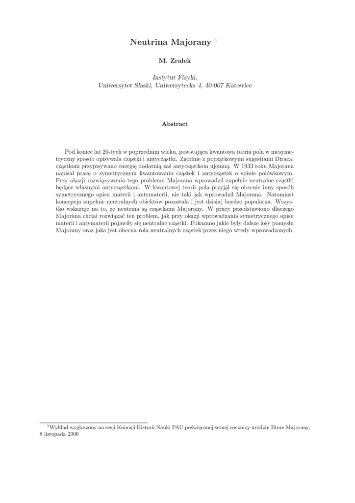 Koncepcja zupelnie neutralnych cza̧stek powstala w pracy [1] dość przypadkowo. Cel Majorany byl inny, chcial on pozbyć siȩ cza̧stek z ujemna̧ energia̧, które w nieunikniony sposób pojawialy siȩ w rozwia̧zaniach równania Diraca. Byly one wprawdzie traktowane jako antycza̧stki