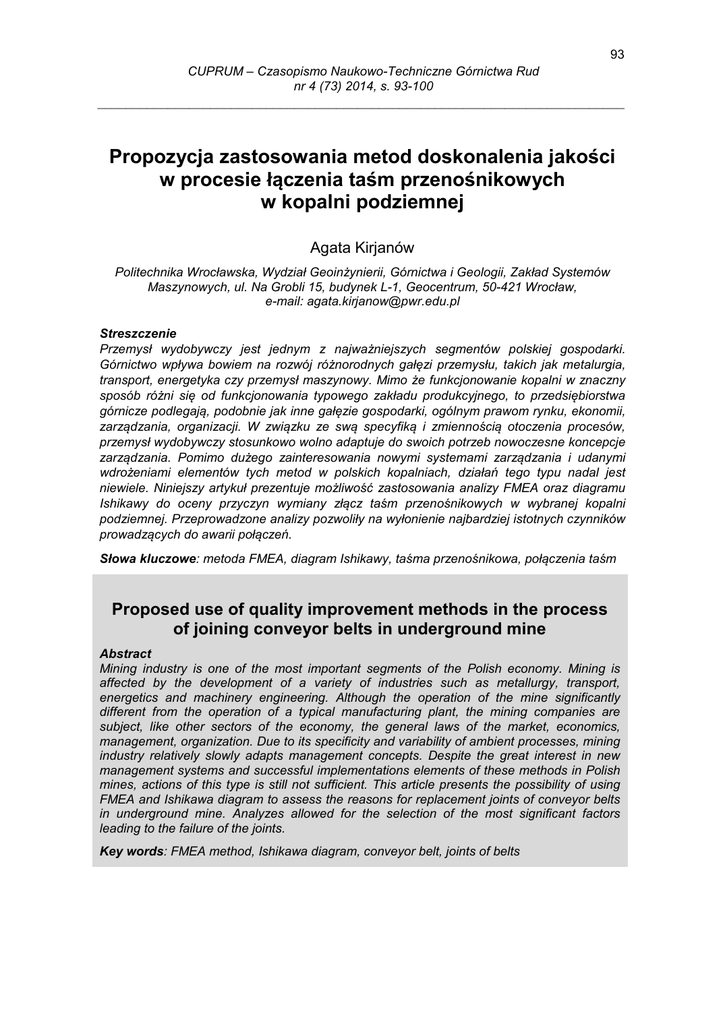 93 CUPRUM – Czasopismo Naukowo-Techniczne Górnictwa Rud nr 4 (73) 2014, s. 93-100 ___________________________________________________________________________ Propozycja zastosowania metod doskonalenia jakości w procesie łączenia taśm przenośnikowych w kopalni podziemnej Agata Kirjanów Politechnika Wrocławska, Wydział Geoinżynierii, Górnictwa i Geologii, Zakład Systemów Maszynowych, ul. Na Grobli 15, budynek L-1, Geocentrum, 50-421 Wrocław, e-mail: [email protected] Streszczenie Przemysł wydobywczy jest jednym z najważniejszych segmentów polskiej gospodarki. Górnictwo wpływa bowiem na rozwój różnorodnych gałęzi przemysłu, takich jak metalurgia, transport, energetyka czy przemysł maszynowy. Mimo że funkcjonowanie kopalni w znaczny sposób różni się od funkcjonowania typowego zakładu produkcyjnego, to przedsiębiorstwa górnicze podlegają, podobnie jak inne gałęzie gospodarki, ogólnym prawom rynku, ekonomii, zarządzania, organizacji. W związku ze swą specyfiką i zmiennością otoczenia procesów, przemysł wydobywczy stosunkowo wolno adaptuje do swoich potrzeb nowoczesne koncepcje zarządzania. Pomimo dużego zainteresowania nowymi systemami zarządzania i udanymi wdrożeniami elementów tych metod w polskich kopalniach, działań tego typu nadal jest niewiele. Niniejszy artykuł prezentuje możliwość zastosowania analizy FMEA oraz diagramu Ishikawy do oceny przyczyn wymiany złącz taśm przenośnikowych w wybranej kopalni podziemnej. Przeprowadzone analizy pozwoliły na wyłonienie najbardziej istotnych czynników prowadzących do awarii połączeń. Słowa kluczowe: metoda FMEA, diagram Ishikawy, taśma przenośnikowa, połączenia taśm Proposed use of quality improvement methods in the process of joining conveyor belts in underground mine Abstract Mining industry is one of the most important segments of the Polish economy. Mining is affected by the development of a variety of industries such as metallurgy, transport, energetics and machinery engineering. Although the operation of the mine significantly different from the operation of a typical manufacturing plant, the mining companies are subject, like other sectors of the economy, the general laws of the market, economics, management, organization. Due to its specificity and variability of ambient processes, mining industry relatively slowly adapts management concepts. Despite the great interest in new management systems and successful implementations elements of these methods in Polish mines, actions of this type is still not sufficient. This article presents the possibility of using FMEA and Ishikawa diagram to assess the reasons for replacement joints of conveyor belts in underground mine. Analyzes allowed for the selection of the most significant factors leading to the failure of the joints. Key words: FMEA method, Ishikawa diagram, conveyor belt, joints of belts 94 A. Kirjanów, Propozycja zastosowania metod doskonalenia jakości… ___________________________________________________________________________ Wstęp Narzędzia zarządzania jakością służą do zbierania i przetwarzania danych, związanych z różnymi aspektami jakości. Pozwalają na monitorowanie, analizowanie i oddziaływanie na procesy w całym cyklu istnienia wyrobu. Z uwagi na swoją prostotę znajdują powszechne zastosowanie zarówno w projektowaniu, jak i w monitorowaniu oraz kontroli procesów wytwarzania produktów czy usług. Metoda FMEA (ang. Failure Mode and Effect Analysis), określana w literaturze polskiej jako analiza rodzajów błędów oraz ich skutków lub analiza przyczyn i skutków wad, wykorzystywana jest w celu ustalenia przyczyn obniżania jakości produktu a także procesu [6]. Innymi słowy metoda ta jest stosowana do zapobiegania skutkom wad, które mogą wystąpić w fazie projektowania oraz w fazie wytwarzania [9]. Dzięki wykorzystaniu wiedzy i doświadczenia osób posługujących się metodą FMEA można oszacować ryzyko wystąpienia w procesie (lub wyrobie) błędów i wad oraz ich przyczyn i znaczenia. W efekcie można znaleźć rozwiązanie korygujące. Celem analizy FMEA procesu (pFMEA) jest systematyczne rozpoznanie potencjalnych problemów występujących w procesie, określenie przyczyn i podjęcie działań, mających na celu minimalizację lub eliminację przyczyn powstawania tych problemów w procesie. Innym bardzo prostym i przydatnym narzędziem w analizie i poprawie jakości procesów jest diagram Ishikawy, zwany również diagramem przyczyn i skutków (ang. cause and effect diagram) lub diagramem rybiej ości (ang. fishbone diagram) [10]. Diagram Ishikawy jest graficzną analizą wpływu różnych czynników oraz ich wzajemnych powiązań, wywołujących określony problem jakościowy, oraz analizą rezultatów (skutków), spowodowanych działaniem tych powiązań. Diagram porządkuje logicznie i chronologicznie przyczyny lub czynności ze względu na zdefiniowany problem. Przygotowywanie, tworzenie i analiza diagramu powinny odbywać się w grupie, składającej się z osób z różnych działów lub zespołów, wówczas diagram będzie reprezentował szerokie spektrum analizy badanego zagadnienia. Warto zauważyć, że cele metody FMEA oraz diagramu Ishikawy są zgodne z zasadą „ciągłego doskonalenia” w metodologii Lean Manufacturing. Analizy przeprowadzone za pomocą tych metod dostarczają pomysłów, pozwalających ulepszyć procesy i wyroby. W ten sposób ich stosowanie wplata się w cykl działań, które zawarte są w „kole Deminga”. 1. Charakterystyka systemu transportowego w jednej z kopalń podziemnych Transport przenośnikowy w przypadku analizowanej kopalni podziemnej odbywa się na 5 oddziałach. Całkowita długość ciągu transportowego wynosi 68 250 m, w którym pracuje 76 przenośników o długościach od 21 m do 2260 m [11]. System transportu taśmowego w kopalni ma za zadanie przenoszenie urobku od punktu wysypowego, gdzie urobek z maszyn odst