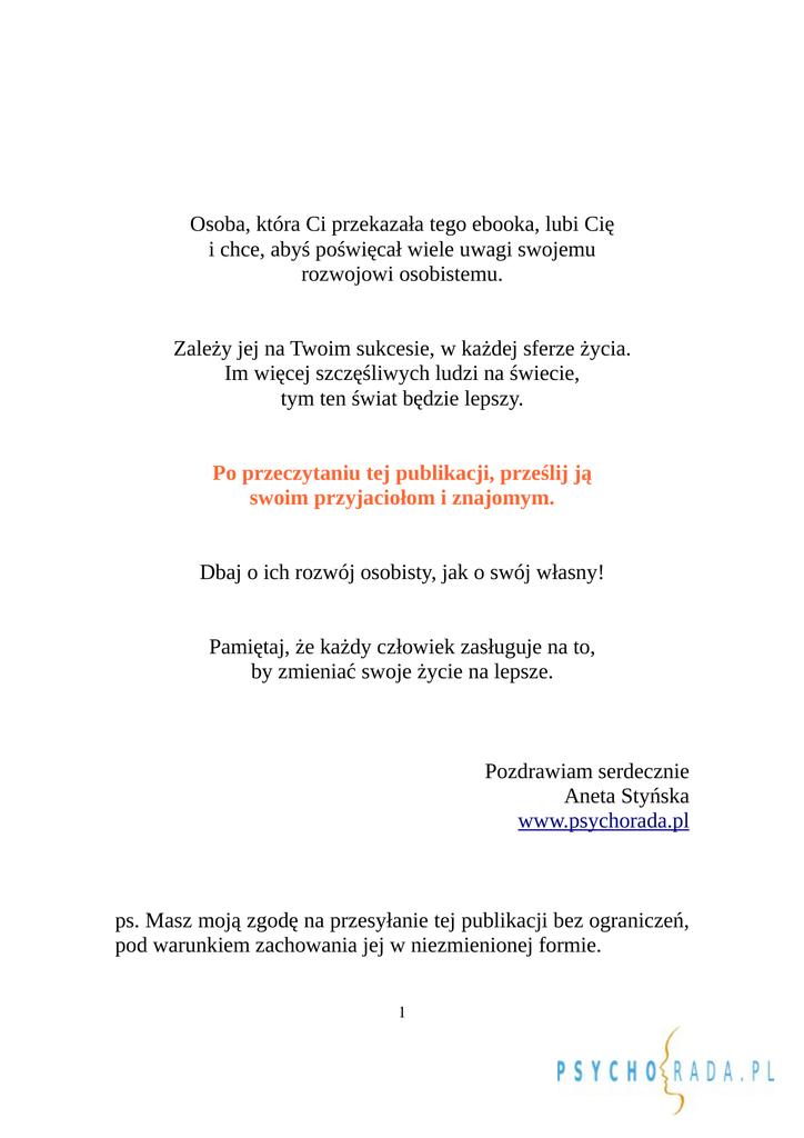 Osoba, która Ci przekazała tego ebooka, lubi Cię i chce, abyś poświęcał wiele uwagi swojemu rozwojowi osobistemu. Zależy jej na Twoim sukcesie, w każdej sferze życia. Im więcej szczęśliwych ludzi na świecie, tym ten świat będzie lepszy. Po przeczytaniu tej publikacji, prześlij ją swoim przyjaciołom i znajomym. Dbaj o ich rozwój osobisty, jak o swój własny! Pamiętaj, że każdy człowiek zasługuje na to, by zmieniać swoje życie na lepsze. Pozdrawiam serdecznie Aneta Styńska www.psychorada.pl ps. Masz moją zgodę na przesyłanie tej publikacji bez ograniczeń, pod warunkiem zachowania jej w niezmienionej formie. 1 Czy jesteś asertywny? Niemal każdy z nas doświadczał takiej sytuacji, w której z trudem wyrażał swoje myśli, poglądy, emocje. Ale prawdopodobnie każdy zna choćby jedną osobę, która z łatwością nawiązuje kontakty, swobodnie podejmuje rozmowę, polemikę, broni własnego stanowiska. Można by przyjąć, że jest to wynik różnic indywidualnych. Niewątpliwie tak. Nie oznacza to jednak, że osoby, które mają trudności z wyrażaniem uczuć, próśb, poglądów czy konstruktywnym reagowaniem na odmienne poglądy innych muszą bezradnie trwać w tym stanie. Pojęcie asertywności Zachowanie asertywne to umiejętność, dzięki której ludzie otwarcie wyrażają swoje myśli, preferencje, uczucia, przekonania, poglądy, wartości, bez odczuwania wewnętrznego dyskomfortu i nie lekceważąc rozmówców. W sytuacjach konfliktowych, umiejętności asertywne pozwalają osiągnąć kompromis, bez poświęcania własnej godności i rezygnacji z uznanych wartości. Ludzie asertywni potrafią powiedzieć „nie”, bez wyrzutów sumienia, złości czy lęku.... Być asertywnym znaczy domagać się swoich lub czyichś praw lub występować w ich obronie, w granicach nie naruszających praw i psychicznego terytorium innych osób oraz własnych. Osoba asertywna ma jasno określony cel i potrafi kontrolować własne emocje, nie poddaje się zbyt łatwo manipulacjom i naciskom emocjonalnym innych osób. 2 W rzeczywistości na postawę asertywną składają się bardzo różne zachowania, za pomocą których człowiek może wyrażać uczucia, życzenia, opinie oraz dbać o swoje interesy bezpośrednio, stanowczo i uczciwie, a jednocześnie szanować inne osoby. Bycie asertywnym przynosi dużo korzyści. Dzięki takiej postawie kontakty z innymi ludźmi stają się łatwiejsze i bardziej satysfakcjonujące. Rozpowszechnienie się szacunku i jasnych relacji między ludźmi prowadzi do zmniejszenia się ich stresu i polepszenia atmosfery. Wzrasta też skuteczność działania, bo osoby asertywne sprawniej komunikują się w zespole. Jak zatem stać się asertywnym? Czy można się stać asertywną osobą po przeczytaniu jednej a nawet kilku mądrych książek, albo po odbyciu treningu szkoleniowego, a nawet kilku szkoleń? A może asertywnym trzeba się urodzić i mieć odpowiednie geny? Uczenie się stosowania metod asertywności jest procesem,który trwa przez całe życie i jest ściśle związany z rozwojem osobistym człowieka. Oczywistym staje się więc fakt, że treningu asertywności nie da się tylko "zaliczyć", ani też spowodować, by ktoś stosował tę metodę rozwiązywania problemów bez bardzo osobistego przekonania o jej słuszności. Niemniej jednak bez żadnej wiedzy na ten temat nie jesteśmy w stanie "nagle" stać się asertywni. Pomocne w nauce asertywności mogą być różne książki szeroko opisujące ten temat. 3 Polecam darmowy fragment ebooka... „Asertywność. Sięgaj po to czego chcesz, nie raniąc innych” I jeszcze kilka porad... Jeśli chcesz zachowywać się asertywnie spróbuj już dziś: Używać otwarcie słów TAK i NIE. Nie przepraszaj jeśli nie zawiniłeś. Nie usprawiedliwiaj się, ani nie tłumacz nadmiernie, natomiast wyjaśniaj powody swojego postępowania jeżeli chcesz być dobrze zrozumiany. Nie napadaj na rozmówcę, nie strasz go, nie poddawaj w wątpliwość jego charakteru lub myślenia. Używaj komunikatów typu JA, a nie komunikatów typu TY, dla przykładu - jeżeli ktoś się spóźnia na spotkanie z Tobą, nie napadaj go słowami "jesteś nieodpowiedzialny, lekceważysz mój czas" tylko powiedz "czuję złość/jest mi przykro kiedy się spóźniasz". Gdy jesteś atakowany - broń się. Nie pozwalaj na naruszanie Twojej godności osobistej. Nie zgadzaj się na to, aby ktoś Cię traktował w sposób raniący Twoje uczucia. Pomocą mogą być takie zdania: "Nie podoba mi się sposób, w jaki do mnie mówisz", "Nie życzę 4 sobie być tak traktowana", "Nie chcę, żebyś zwracał się do mnie w ten sposób", itp. Staraj się nie kłamać - masz prawo być sobą, nie wstydź się siebie, nawet jeśli popełniasz błędy. Mów jasno i wprost, o co Ci chodzi. Pytaj otwarcie, gdy czegoś nie rozumiesz. Mów, że nie wiesz, gdy czegoś nie wiesz; mów, że nie chcesz o czymś mówić, jeśli nie chcesz o tym mówić. Zwróć uwagę by realizować swoje zamiary nie krzywdząc innych. Przyznaj innym dokładnie takie same prawa do asertywnego zachowania, jakie przyznajesz sobie. Wyrażaj otwarcie swoje oczekiwania, jeżeli ktoś narusza Twoje terytorium powiedz mu o tym oraz wskaż jak chcesz być na przyszłość traktowany np. Czuję złość kiedy zwracasz się do mnie w ten sposób wolę/oczekuję abyś konstruktywnie mnie oceniał. Życzę powodzenia! 5 _____________________________________________________ Nowości do ściągania i czytania Sprawdź sekret, w którym jedna myśl może zdecydowanie podnieść jakość Twojego życia. Zapisy na warsztat "Jak zaplanować swoją przyszłość" 6