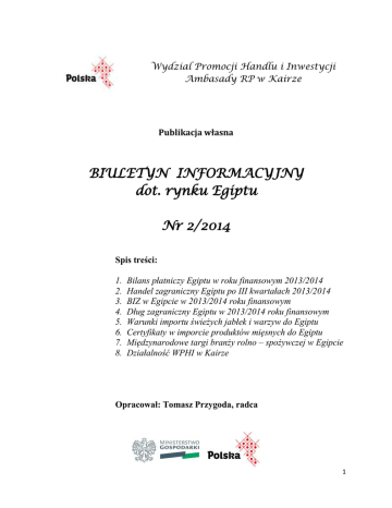 Wydzial Promocji Handlu i Inwestycji Ambasady RP w Kairze Publikacja własna BIULETYN INFORMACYJNY dot. rynku Egiptu Nr 2/2014 Spis treści: 1. 2. 3. 4. 5. 6. 7. 8. Bilans płatniczy Egiptu w roku finansowym 2013/2014 Handel zagraniczny Egiptu po III kwartałach 2013/2014 BIZ w Egipcie w 2013/2014 roku finansowym Dług zagraniczny Egiptu w 2013/2014 roku finansowym Warunki importu świeżych jabłek i warzyw do Egiptu Certyfikaty w imporcie produktów mięsnych do Egiptu Międzynarodowe targi branży rolno – spożywczej w Egipcie Działalność WPHI w Kairze Opracował: Tomasz Przygoda, radca 1 Bilans płatniczy Egiptu w roku finansowym 2013/2014 W bilansie płatniczym Egiptu w roku finansowym 2013/2014 odnotowano saldo 1 dodatnie wartości 2,2 mld dol. USA w przeciwieństwie do deficytu wartości 2,1 mld dol. USA w tym samym okresie referencyjnym poprzedniego okresu rozliczeniowego. Poprawa stanu bilansu płatniczego jest wynikiem zmniejszenia deficytu rachunku bieżącego do wartości 232,7 mln dol. USA /z poziomu ok. 5,7 mld dol. USA w okresie referencyjnym/ oraz dodatniego salda rachunku kapitałowego wartości 3,5 mld dol. USA. Zmniejszenie deficytu na rachunku bieżącym w roku finansowym 2013/2014 jest wynikiem zwiększenia wartości zagranicznych transferów pieniężnych do 23,6 mld dol. USA /z ok. 14,4 mld dol. USA w okresie referencyjnym/ oraz zmniejszenia o 1,5% deficytu bilansu handlowego do 25,2 mld dol. USA /z 25,6 mld dol. USA w okresie referencyjnym/. Poprawa salda rachunku bieżącego byłaby większa, gdyby nie nastąpiło zmniejszenie wartości dodatniego salda bilansu usług o 75,5% - z 5,4 mld dol. USA w okresie referencyjnym do 1,3 mld dol. USA w roku finansowym 2013/2014. Na rachunku kapitałowo – bankowym odnotowane zostało zmniejszenie wartości zagranicznych zobowiązań netto Centralnego Banku Egiptu /CBE/ w wyniku spadku zagranicznych transferów do wartości netto 2 mld dol. USA /w porównaniu do 4 mld dol. USA w okresie porównawczym/ oraz zwrotu części depozytów wniesionych do CBE przez niektóre państwa arabskie. Rezerwy zagraniczne netto /NIR/ CBE zwiększyły się w omawianym okresie o 2,5 mld dol. USA do wartości 17,4 mld dol. USA, umożliwiającej pokrycie strategicznego importu surowcowego Egiptu przez okres 3,6 miesięcy. 2 Bankowe depozyty walut zagranicznych zwiększyły się o 1,2% do wartosci 32,4 mld dol. USA. Całkowity dług zagraniczny Egiptu zwiększył się o 4,8% do wartości 45,3 mld dol. USA.3 Zachowana została korzystna struktura egipskiego długu zagranicznego, w którym 93,9% stanowią kredyty długo i średnioterminowe, sprzyjając utrzymaniu ich wykonalności. W prezentowanym okresie średni międzybankowy kurs wymiany funta egipskiego /EGP/ wyniósł 6,958 za 1 dol. USA, wskazując na aprecjację waluty egipskiej o 0,7% w porównaniu z okresem referencyjnym poprzedniego roku finansowego.4 1 na podstawie danych Centralnego Banku Egiptu za okres pierwszych III kwartałów roku finansowego 2013/2014 na koniec czerwca 2014 r. NIR CBE miały wartość 16,7 mld $ USA, a na koniec listopada 2014 r. 15,8 mld $ USA 3 na koniec czerwca 2014 r. wartość długu zagranicznego Egiptu wyniosła 46,1 mld dol. USA /wzrost o 6,6%/ 4 kurs czarnorynkowej wymiany w grudniu 2014 r. dochodził w Kairze do 7,75 EGP/1 $ US 2 2 Więcej informacji o gospodarce Egiptu na stronie internetowej Wydziału – link www.cairo.trade.gov.pl w zakładce Egipt – polityka gospodarcza - link https://cairo.trade.gov.pl/pl/egypt/article/detail,1867,Polityka_gospodarcza.html . Handel zagraniczny Egiptu po III kwartałach 2013/2014 Wymiana handlowa Egiptu z zagranicą w 2013/2014 roku finansowym utrzymała tendencję rozwojową – obroty handlowe wzrosły o 1,8% osiągając wartość 62,8 mld dol. USA i stanowiąc 21,2% GDP.5 Deficyt bilansu handlowego w omawianym okresie zmniejszył się w porównaniu z okresem referencyjnym poprzedniego roku finansowego o 0,4 mld dol. USA do wartości 25,2 mld dol. USA, stanowiąc 9,2% egipskiego GDP. Przyczyny odnotowanych zmian to wzrost wartości eksportu towarowego Egiptu o 4,2% do wartości 18,8 mld dol. USA, spowodowanego zwiększeniem o 13,8% eksportu ropy naftowej i produktów ropopochodnych, stanowiących 46,5% całkowitego egipskiego eksportu towarowego, oraz zmniejszeniem o 2,9% wartości eksportu pozostałych branż towarowych, jak również wzrostem egipskiego importu towarowego o 0,8% do wartości 44 mld dol. USA w rezultacie zwiększenia importu produktów ropopochodnych o 0,8% /udział 22% w całkowitym imporcie/ oraz importu pozostałych branż towarowych o 0,9% /78% udział w całkowitym imporcie/. Największy, 46,9% udział w eksporcie towarowym Egiptu mają paliwa, oleje i produkty ropopochodne, a następnie wyroby gotowe – 39%, półfabrykaty – 8,9% i surowce – 5,2%. W imporcie towarowym do Egiptu największy udział mają półprodukty – 30,5%, a następnie produkty konsumpcyjne – 22,4%, paliwa, oleje i produkty ropopochodne – 19,3%, produkty inwestycyjne – 15,3% i surowce – 12,5%. Główne rynki eksportu towarowego Egiptu to kraje Unii Europejskiej, odbierające 39,5% całkowitego eksportu egipskiego, a nastepnie kraje arabskie posiadające 22,6% udział, kraje Azji z 14,7% udziałem, USA – 10,9% udział, Australia i rynki sąsiadujące – 6,2%, pozostałe rynki europejskie – 5,6%, Rosja i WNP – 0,5%. Główne rynki egipskiego eksportu towarowego to Włochy, USA, Indie, Zjednoczone Emiraty Arabskie, Francja oraz Wlk. Brytania – kraje te przyjmują łącznie 51% całkowitego eksportu Egiptu. Główni partnerzy handlowi w imporcie towarowym do Egiptu to państwa arabskie, dostarczające towary o wartości 27,9% całkowitego importu egipskiego, a następnie rynki państw Unii Europejskiej posiadające udział 27,4% w imporcie Egiptu, 5 na podstawie danych CBE obejmujących okres III kwartałów roku finansowego 2013/2014 3 rynki azjatyckie z 20,3% udziałem, pozostałe rynki pań
