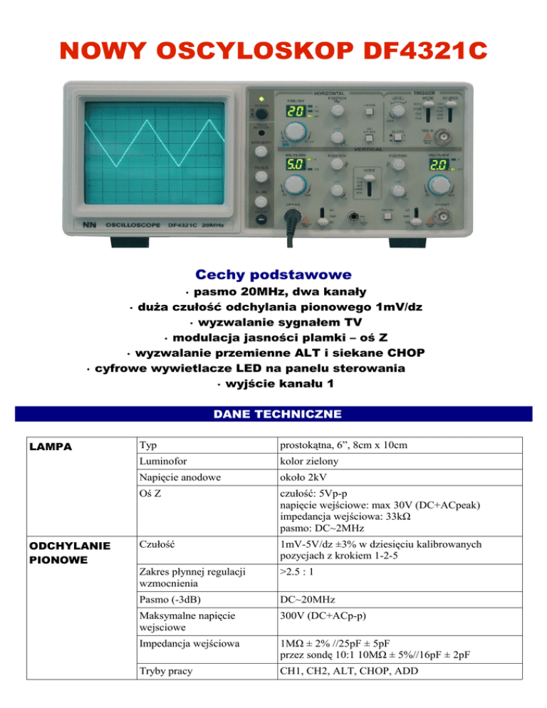 NOWY OSCYLOSKOP DF4321C Cechy podstawowe pasmo 20MHz, dwa kanały • duża czułość odchylania pionowego 1mV/dz • wyzwalanie sygnałem TV • modulacja jasności plamki – oś Z • wyzwalanie przemienne ALT i siekane CHOP cyfrowe wywietlacze LED na panelu sterowania • wyjście kanału 1 • • DANE TECHNICZNE LAMPA ODCHYLANIE PIONOWE Typ prostokątna, 6”, 8cm x 10cm Luminofor kolor zielony Napięcie anodowe około 2kV Oś Z czułość: 5Vp-p napięcie wejściowe: max 30V (DC+ACpeak) impedancja wejściowa: 33kΩ pasmo: DC~2MHz Czułość 1mV-5V/dz ±3% w dziesięciu kalibrowanych pozycjach z krokiem 1-2-5 Zakres płynnej regulacji wzmocnienia >2.5 : 1 Pasmo (-3dB) DC~20MHz Maksymalne napięcie wejsciowe 300V (DC+ACp-p) Impedancja wejściowa 1MΩ ± 2% //25pF ± 5pF przez sondę 10:1 10MΩ ± 5%//16pF ± 2pF Tryby pracy CH1, CH2, ALT, CHOP, ADD ODCHYLANIE POZIOME WYZWALANIE TRYB X-Y SYGNAŁY WYJŚCIOWE Podstawa czasu 0,1μs/dz ~ 0,5s/dz ±3% w 21 kalibrowanych pozycjach z krokiem 1-2-5 podczas pracy z rozciągiem x10 maksymalne odchylanie poziome 10ns/dz Błąd liniowości W trybie x1: ±5%, w trybie x10: ±10% Tyby wyzwalania AUTO, NORM, TV(H), TV(V) Źródło CH1, CH2, LINE (sieć zasilająca), EXT (sygnał zewnętrzny), VERT Czułość 1mV-5V/dz ±3% Pasmo osi X DC: 0 ~ 1MHz Przesunięcie fazy < 3˚ (DC ~ 50kHz) Sygnał kalibratora Przebieg prostokątny, częstotliwość 1kHz ± 2%, amplituda 0,5V ± 2% AC: 10Hz ~ 1MHz Wyjście kanału 1 ZASILANIE AC 110V: zakres napięcia 99 ~ 121V 230V: zakres napięcia 198 ~ 242V częstotliwość: 48Hz ~ 62Hz pobór mocy: 30W WYPOSAŻENIE Kabel zasilający, instrukcja obsługi, dwie sondy (10:1, 1:1) WYMIARY I WAGA 370mm x 310mm x 130mm waga 6,5kg WARUNKI PRACY Temperatura pracy 0˚C ~ +40˚C Wilgotność 35% ~ 85% 02-784 Warszawa, ul. Janowskiego 15 tel. /fax 022 641-15-47, 644-42-50 http://www.ndn.com.pl e-mail: [email protected]
