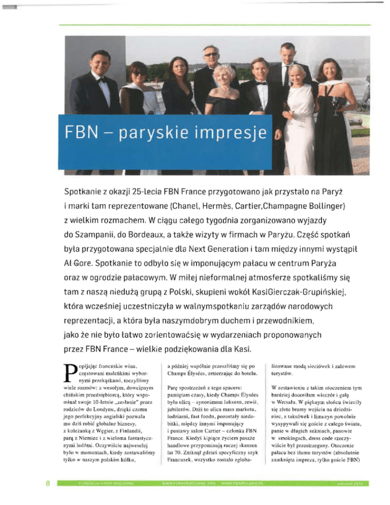 Spotkanie z okazji 25-Lecia FBN France przygotowano jak przystało na Paryż i marki tam reprezentowane (Chanel, Hermes, Cartier,Champagne Bollinger) z wielkim rozmachem. W ciągu całego tygodnia zorganizowano wyjazdy do Szampanii, do Bordeaux, a także wizyty w firmach w Paryżu. była przygotowana specjalnie dla Next Generation i tam Al Gore. Spotkanie to odbyło się w imponującym oraz w ogrodzie tam z naszą pałacowym. niedużą grupą która wcześniej jako że nie było Łatwo zorientowaćsię P francu skie wina, wybor- nymi prze kąskami , t oczy li ś m y wiele rozmów: z wesołym , dowcipnym c hińskim przedsiębiorcą, który wspominał swoje lO-letnie "zesła n ie " przez rodziców do Londynu, d zięki czemu jego perfekcyjny angielski pozwala m u d ziś robić globalne biznesy, z koleżanką z Węgier, z Finlandii , parą z Niemiec i z wieloma fantastycznymi lud7.mi . Oczyw i ście najweselej by ło w momentach , kiedy zostawali śmy tylko w naszym polskim kó łku , innymi wystąpił w centrum Paryża wokół KasiG i erczak-Grupińskiej, w walnymspotkaniu była częs towani maleńkimi 8 z Polski, skupieni reprezentacji, a która opijając między W miłej nieformalnej atmosferze spotkaliśmy się uczestniczyła przez FBN France - wielkie pałacu Część spotkań zarządów narodowych naszymdobrym duchem i przewodnikiem , w wydarzeniach proponowanych podziękowania dla Kasi. a później wspólnie przeszliśmy się po Champs Elysees, zmierzając do hotelu. lizowane modą sieciówek i zalewem turystów. Parę spos trzeżeń z tego spaceru: pamięta m czasy, kiedy Ch amps Elysees było ulicą- synonimem luksusu, rewii , jubilerów. Dz i ś to ulica mass marketu, lodziarni. fas t foodu, pozostały niedobitki , mi ę d zy innymi imp o nujący i pustawy salon Cartier - członka FBN France . Kiedy ś kipiące życiem pas aże handlowe przyp o minaj ą raczej skansen lat 70. Zn ikn ąt g dzieś specyficzny szyk Francuzek, wszystko zosta ło zg loba- W zestawieniu z takim otoczeniem tym bardziej do ce niłam wieczór i g al ę w Wersalu. W pi ękn ym sło ń cu świec iły się złote bramy wejśc i a na dziedziniec, z taksówek i limuzy n powolnie wysypywali si ę goś c ie z całe go świata , panie w długich sukniach , panowie w smokingach, dress code rzeczywi śc i e b ył przestr zegany. Otoczenie pałacu bez th1mu turystów (absolutnie zamknięta impreza, tylko go ś cie FBN) --na wszystkich robiło wrażenie i wszyscy nam i ęt ni e fotografowali s ię sami lub nawzajem, to też był taki specy-ficzny rodzaj na w ią zywania pierw-szych kontaktów, wymiany, gestów. Po szybkiej i sprawnej rejestracji wszyscy przeszliśmy na tarasy ogrodowe , kelnerzy roznos ili szampana i ponownie maleńkie wyrafinowane zakąski, przed nami rozciągały si~_: po horyzont wspaniałe widoki ogrodów i fontann wersalu. Przechadzając się w tym zachwycającym otoczeniu pięknych pań w długich niezwykłych kreacjach , ostrożn i e chodzących na niebotycznych obcasach po żwirowyc h ścieżkach (czerwonych dywanów nic było), przystojnych panów i pojawiających się nienagannych kelnerów, spoty kali śmy się ponownie w gronie całej naszej polskiej reprezentacji. S łońce św ieciło, pogoda była równie tylko chwilami powiewy wiatru strącały dźwięcznie puste kieliszki z tac. Po takim koktajlu powitalnym przeszliśmy zw iedzać Wersal, korowód rozc iągnął się tak, że momentami moż n a było być w apartamentach król.ewskich nieomal w pojedynkę i podziwiać- l~ nieprzebrane i w pełni zachowane bogactwo francuskiego dworu . Tam właśnie spotkali śmy francuską parę, która po u słyszen iu, że jes te~ my z Polski, powiedziała , że właś nie dziś w pałacu dowiedziała się o polskiej królowej, żonie Ludwika XV, Marii Leszczyńskiej. Oboje byli wspaniała, bardzo zdumieni , kiedy powiedziałam im, że Henryk Walezy był , krótko wprawdzie , ale królem Polski (tak wygląda poziom francuskiej matury .. .). Muszę przyzn ać , że ta chwila historycznej konwersacji b yła jedynym moim kontaktem z francuskimi gospodarzami, nie byłam wprawdzie na zwiedzaniu firm, ale z informacji uczestników też nie wynikało, aby ktoś z Francuzów integrował się z gośćmi, raczej cieszyli się swoim niewątpliwym sukcesem 25-lecia francuskiego oddziału w swoi m gronie - to oczywiście moje subiektywne spos trzeżen i e. Było tam natomiast pełno fantastycznych osób z wielu krajów, przy 12-osobowych stolach rozsadzono nas, mi eszając n arodowości, wiek i rodzaje biznesów. S i cdzieliśmy w czwórkę z Polski z przedstawicielami Ukrainy, Finlandii i Bułgarii, sąsiedni stót z naszymi 3 osobam i zdom inowali Chińczycy, inny Niemcy. Podano obiad, przystawki Uajko trutlowe z warzywami) ... danie główne, deser pod n azwą Sarah Bernard. Sala z żyrando la mi , św iecami, lustrami, rozstawione stoły w jednej z największych pałacowych sal c i ągnęły się ok 100 m, pomiędzy nimi co jaki ś czas umieszczono ekra ny, tak że ka żdy m ógł w idzieć i usłyszeć mówców, gospodarzy i gościa . Al Gore jeszcze raz przemów ił, tym razem do wszystkich, pow tarzając swoje tradycyjne p rzesłanie. W trakcie kolacji hostessy sprzedawały losy teletomboli , w której nagrodami były szampany, apaszka i krawat Hermesa, wina Bordoaux , a także samochód hybrydowy marki Peugeot ... Niestety, z tego, co mi wiadomo , nikt z naszej polskiej grupy nic nie wygrał. Po kolacji wszyscy udali się ponownie na tarasy ogrodowe, skąd podziwialiśmy pokaz sztucznych ogni i fontann w akompaniamencie francuskiej muzyki barokowej. Często wano szampanem, podawano tradycyjne francuskie pastelowe macarons i ok l w nocy zakończy ło się nasze spotkanie FBN w Paryżu. v~FBN -~ _/ Polat>d f" ł f A MIU . V , Iłi !U llł f'N OI.It Katarzyna l.akińska 9