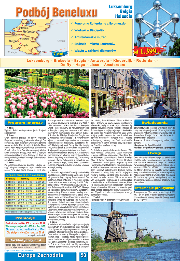 Podbój Beneluxu Panorama Rotterdamu z Euromasztu Amsterdam Rotterdam Wiatraki w Kinderdijk Holandia Belgia Amsterdamskie muzea Antwerpia Niemcy Bruksela Luxemburg Francja 7 dni Bruksela – miasto kontrastów Wizyta w szlifierni diamentów od 1.399 zł Luksemburg - Bruksela - Brugia - Antwerpia - Kinderdijk - Rotterdam Delfty - Haga - Lisse – Amsterdam Program imprezy 1 dzień Wyjazd z Polski według rozkładu jazdy. Przejazd przez Niemcy. 2 dzień Około południa przyjazd do stolicy Wielkiego Księstwa Luksemburg, gdzie warto zobaczyć Cosemates du Bock - barokowe umocnienia obronne wykute w skale, Plac Konstytucji, katedrę Notre Dame, Pałac Książęcy, malownicze przedmieścia Grund z ulicą de la Corniche zwaną najpiękniejszym „balkonem” Europy, Plac Armii z licznymi restauracjami i kawiarniami. Przejazd do Belgii na nocleg w okolicy Brukseli/Antwerpii. Zakwaterowanie w hotelu, nocleg. 3 dzień Po śniadaniu przejazd do Brukseli - „Stolicy Europy”. Wizyta u znanego na całym świecie Manneken Pis’a, czyli figurki chłopca z 1619 roku. Terminy i ceny za os. w pok. 2/3 os. Nr grupy Terminy Cena KBTH 01 28.04 - 04.05 1.699 zł KBTH 02 05.05 - 11.05 1.699 zł KBTH 03 19.05 - 25.05 1.599 zł KBTH 04 09.06 - 15.06 1.599 zł KBTH 05 07.07 - 13.07 1.599 zł KBTH 06 04.08 - 10.08 1.599 zł KBTH 07 25.08 - 31.08 1.599 zł KBTH 08 08.09 - 14.09 1.599 zł Dopłata do pokoju 1 os. - 500 zł Pakiet bezpieczeństwa 50 zł - szczegóły na str. 6 Ubezpieczenie kosztów rezygnacji - 2,4% ceny Promocje First minute - zniżka 150 zł do dnia 21.02 Wiosenna promocja - zniżka 100 zł do dnia 20.03 Słoneczna promocja - zniżka 50 zł do 17.04 Dla stałych klientów - zniżka 50 zł szczegóły na stronie 7 Rozkład jazdy nr 4 Rozkład jazdy, lista przystanków oraz wykaz dopłat za miejsce wsiadania na str. 154-155 Spacer po mieście i zwiedzanie: Atomium - symbol Brukseli zbudowany z okazji EXPO w 1958 r. 103 - metrowy model kryształu żelaza. Następnie Grand Place uznawany za najwspanialszy plac w Europie, z gotyckim ratuszem z XV wieku, zabytkowymi kamienicami oraz Domem Króla i Kościołem św. Mikołaja. Przejazd do Brugii - perły renesansu flamandzkiego - z romantycznym rejsem po kanałach tego świetnie zachowanego, średniowiecznego miasteczka. Zwiedzanie: Kościół Najświętszej Marii Panny, Bazylika świętej Krwi, Wieża Belfort z XIII-wiecznymi sukiennicami. Kolejny punkt programu to Antwerpia – drugie, co do wielkości miasto nad Skaldą: m.in. Grote Markt z renesansowym ratuszem oraz fontanna Brabo, Steen – fragmenty XI w. Fortyfikacji, XVI w. domy cechowe, Rynek Rękawiczek z największą gotycką katedrą w Belgii, Zielony Plac z pomnikiem Rubensa. Przejazd do hotelu w okolicy Brukseli/ Antwerpii, nocleg. 4 dzień Po śniadaniu wyjazd do Kinderdijk – niewielkiej miejscowości położonej nieco na uboczu, z dala od głównych dróg, między Rotterdamem i Dordrechtem. Około 1740 roku w Kinderdijk powstał zespół wiatraków, które przetrwały do dziś. Dzięki temu od roku 1997 miejsce to znajduje się na Liście Światowego Dziedzictwa UNESCO. Następnie przejazd do centrum Rotterdamu. Zwiedzanie: Monumentalny Ratusz - cudem ocalały mimo doszczętnie zbombardowanego w czasie wojny miasta, wieża widokowa Euromaszt - wjazd superszybką windą na wysokość 185 m, skąd będzie można obejrzeć panoramę miasta i największego portu na świecie. Spacer po centrum, które pretenduje do miana holenderskiego Manhattanu. Czas wolny. Możliwość zrobienia zakupów na Coolsingel - głównej ulicy handlowej z dużymi domami towarowymi (wśród nich najbardziej szykowny - Bijenkorf). Przejazd do hotelu w okolicy Hagi/ Amsterdamu, nocleg. 5 dzień Po śniadaniu wizyta w Delftach - jednym z najlepiej zachowanych średniowiecznych miast holenderskich. Spacer po zabytkowym centrum z licznymi sklepikami oferującymi słynną delfską porcelanę. Czas wolny na zakupy. Następnie przejazd do centrum Hagi – siedziby rzędu holenderskiego, spacer i zwiedzanie: oficjalna rezydencja królewska, Zamek Binnenhof - siedziba parlamentu, Pałac Pokoju, w którym mieści się Międzynarodowy Trybunał Sprawiedliwości, starówka z kościołem Organizator: Almatur - Katowice Europa Zachodnia 53 św. Jakuba, Pałac Królewski. Wizyta w Madurodam - znanym na całym świecie miniaturowym miasteczku, będącym znakomitym miejscem, by poznać wszystkie atrakcje Holandii. Przejazd do Scheveningen – najsłynniejszego holenderskiego kurortu nad Morzem Północnym. Czas wolny. Kolejny punkt programu to Lisse i zwiedzanie ogrodów Keukenhof** (kwiecień-maj) – miejsca rozkwitającego wiosną ponad 7 milionami kwiatów cebulowych, w którym przyroda łączy się ze sztuką. Powrót do hotelu na nocleg. 6 dzień Po śniadaniu przejazd do Amsterdamu - „Wenecji Północy”. Zwiedzanie: Coster Diamonds – słynna szlifiernia diamentów, Plac Dam: Pałac Królewski- dawny Ratusz, Pomnik Pamięci Ofiar II Wojny światowej. Spacer Dzielnicą Czerwonych Latarni, gdzie znajduje się dom Rembrandta oraz Qude Kerk - najstarszy kościół w mieście. Następnie malownicza dzielnica Jordaan - niegdyś najbiedniejsza dzielnica miasta: Westerkerk - piękny, duży kościół z najwyższą wieżą w mieście, na którą warto się wspiąć by spojrzeć na całe centrum. Wizyta w muzeum Van Gogha oraz Rijksmuseum z kolekcją sztuki holenderskiej (m. in. Rembrandt, Veermer, Hals). Po południu rejs statkiem po kanałach - dawnych drogach komunikacji i transportu towarów, podczas którego zobaczymy urokliwe zakątki miasta. W godzinach wieczornych wyjazd w drogę powrotną do Polski. 7 dzień Powrót do Polski w godzinach popołudniowych. Świadczenia Zakwaterowanie: 4 noclegi w hotelach klasy turystycznej lub pensjonatach: 2 noclegi w okolicy Brukseli lub Antwerpii, 2 noclegi w okolicy Hagi lub Amsterdamu. Pokoje 2, 3 osobowe z łazienkami. Wyżywienie: 4 śniadania. Transport: Autokar z klimatyzacj