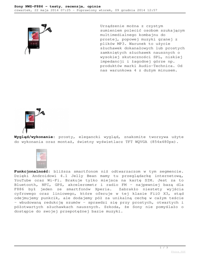 Sony NWZ-F886 - testy, recenzja, opinie czwartek, 22 maja 2014 07:25 - Poprawiony wtorek, 09 grudnia 2014 12:57 Urządzenie można z czystym sumieniem polecić osobom szukającym multimedialnego kombajnu do prostej, popowej muzyki granej z plików MP3. Warunek to użycie słuchawek dokanałowych lub prostych zamkniętych słuchawek nausznych o wysokiej skuteczności SPL, niskiej impedancji i łagodnej górze np. produktów marki Audio-Technica. Od nas warunkowa 4 z dużym minusem. Wygląd/wykonanie: prosty, elegancki wygląd, znakomite tworzywa użyte do wykonania oraz montaż, świetny wyświetlacz TFT WQVGA (854x480px). Funkcjonalność: bliższa smartfonom niż odtwarzaczom w tym segmencie. Dzięki Androidowi 4.1 Jelly Bean mamy tu przeglądarkę internetową, YouTube oraz Wi-Fi. Brakuje tylko miejsca na kartę SIM. Jest za to Bluetooth, NFC, GPS, akcelerometr i radio FM – najpewniej bazą dla F886 był jeden ze smartfonów Xperia. Zabrakło niestety wyjścia cyfrowego oraz liniowego, które oferuje w tej klasie FiiO X3, stąd odejmujemy punkcik, ale dodajemy pół za unikalną cechę w całym teście – wbudowaną redukcję szumów – sprawdzi się przy prostych, otwartych i półotwartych słuchawkach nausznych. Szkoda, że Sony nie pomyślało o dostępie do swojej przepotężnej bazie muzyki. 1 / 3 Phoca PDF Sony NWZ-F886 - testy, recenzja, opinie czwartek, 22 maja 2014 07:25 - Poprawiony wtorek, 09 grudnia 2014 12:57 Wygoda użytkowania: na wstępie odejmujemy pół punktu za wyświetlacz dotykowy i drugie pół za brak ładowarki sieciowej w komplecie. Sytuację ratują przyciski do zmiany głośności i utworów umieszczone na boku obudowy. Odsłuch dokanałowy (RE-400): słuchawki zostały w pełni wysterowane, jednak czasami niezbędne było użycie pełnego zakresu potencjometru, co sugeruje użycie mało wydajnego wzmacniacza operacyjnego, który może okazać się zbyt skromny jak na mocniejsze słuchawki nauszne. Sony jest bardzo dobrym wyborem do muzyki, która nie podkreśla wysokich i średnich tonów – charakter odtwarzacza określa rozjaśniona, okazyjnie szczypiąca w uszy góra pasma oraz oszczędna w detale, ciosana nieco grubymi razami średnica połączona z znakomitym wbijający w podłogę basem – świetnie oddanym w utworze Children Roberta Milesa czy też muzyce Daft Punk. Bardzo pozytywnie wypadły MP3 z muzyką Adele – uśrednione ale łagodne i muzykalne. W przypadku bardziej zaawansowanych, wielowarstwowych utworów, takich jak Jubilee Street Nicka Cave niestety, Sony ewidentnie gubił szczegóły i rytm, zabrakło też dynamiki dźwięku. Podsumowanie: Urządzenie można z czystym sumieniem polecić osobom szukającym multimedialnego kombajnu do prostej, popowej muzyki granej z plików MP3. Warunek to użycie słuchawek dokanałowych lub prostych 2 / 3 Phoca PDF Sony NWZ-F886 - testy, recenzja, opinie czwartek, 22 maja 2014 07:25 - Poprawiony wtorek, 09 grudnia 2014 12:57 zamkniętych słuchawek nausznych o wysokiej skuteczności SPL, niskiej impedancji i łagodnej górze np. produktów marki Audio-Technica. Od nas warunkowa 4 z dużym minusem. Plusy: bardzo dobry bas super długi czas pracy na baterii/szybkie ładowanie funkcjonalność na poziomie smartfona świetne wykonanie redukcja szumów Minusy: wysokie tony: ostre, mało przestrzenne średnie tony: szorstkie, mało detaliczne mała moc, stąd skromna dynamika i kontrola nad dźwiękiem dotykowy wyświetlacz brak ładowarki sieciowej w komplecie 3 / 3 Phoca PDF
