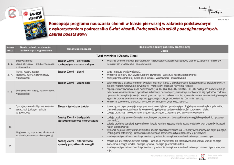 Koncepcja programu nauczania chemii w klasie pierwszej w zakresie podstawowym z wykorzystaniem podręcznika Świat chemii. Podręcznik dla szkół ponadgimnazjalnych. Zakres podstawowy Numer lekcji Nawiązanie do wiadomości realizowanych w gimnazjum strona 1/3 Realizowane punkty podstawy programowej Uczeń: Temat lekcji bieżącej Tytuł rozdziału I: Zasoby Ziemi Budowa atomu 1., 2. Układ okresowy – źródło informacji o pierwiastku Zasoby Ziemi – pierwiastki występujące w stanie wolnym • wyjaśnia pojęcie alotropii pierwiastków; na podstawie znajomości budowy diamentu, grafitu i fullerenów tłumaczy ich właściwości i zastosowania; Tlenki, kwasy, zasady 3., 4. (budowa, wzory, nazewnictwo, właściwości) Zasoby Ziemi – tlenki • bada i opisuje właściwości SiO2; • wymienia odmiany SiO2 występujące w przyrodzie i wskazuje na ich zastosowania; • opisuje proces produkcji szkła, jego rodzaje, właściwości i zastosowania; Zasoby Ziemi – ważne sole • opisuje rodzaje skał wapiennych (wapień, marmur, kreda), ich właściwości i zastosowania; projektuje wykrycie skał wapiennych wśród innych skał i minerałów; zapisuje równania reakcji; • zapisuje wzory hydratów i soli bezwodnych (CaSO4, (CaSO4)2 · H2O i CaSO4 · 2H2O); podaje ich nazwy; opisuje różnice we właściwościach hydratów i substancji bezwodnych; przewiduje zachowanie się hydratów podczas ogrzewania i weryfikuje swoje przewidywania poprzez doświadczenie; wymienia zastosowania skał gipsowych; wyjaśnia proces twardnienia zaprawy gipsowej (zapisuje odpowiednie równanie reakcji); • wymienia surowce do produkcji wyrobów ceramicznych, cementu, betonu; Gleba – życiodajne źródło • tłumaczy, na czym polegają sorpcyjne właściwości gleby; opisuje wpływ pH gleby na wzrost wybranych roślin; planuje i przeprowadza badanie kwasowości gleby oraz badanie właściwości sorpcyjnych gleby; • podaje przykłady nawozów naturalnych i sztucznych, uzasadnia potrzebę ich stosowania; Zasoby Ziemi – tradycyjnie stosowane surowce energetyczne • podaje przykłady surowców naturalnych wykorzystywanych do uzyskiwania energii (bezpośrednio i po przetworzeniu); • opisuje przebieg destylacji ropy naftowej i węgla kamiennego; wymienia nazwy produktów tych procesów i uzasadnia ich zastosowania; • wyjaśnia pojęcie liczby oktanowej (LO) i podaje sposoby zwiększania LO benzyny; tłumaczy, na czym polegają kraking oraz reforming, i uzasadnia konieczność prowadzenia tych procesów w przemyśle; • analizuje wpływ różnorodnych sposobów uzyskiwania energii na stan środowiska przyrodniczego; Zasoby Ziemi – alternatywne sposoby pozyskiwania energii • proponuje alternatywne źródła energii – analizuje możliwości ich zastosowań (biopaliwa, wodór, energia słoneczna, energia wodna, energia jądrowa, energia geotermalna itd.); • analizuje wpływ różnorodnych sposobów uzyskiwania energii na stan środowiska przyrodniczego – kontynuacja; 5., 6. Sole (budowa, wzory, nazewnictwo, właściwości) 7. Dysocjacja elektrolityczna kwasów, zasad, soli (odczyn, reakcje strąceniowe) 8. Węglowodory – podział, właściwości (spalanie, charakter nienasycony) 9. Dokument zosta³ pobrany z serwisu www.zamkor.pl Wszelkie prawa zastrze¿one. Data utworzenia: 2012-02-06 strona 2/3 10. Lekcja powtórzeniowa 11. Sprawdzian wiadomości Tytuł rozdziału II: Chemia a żywność 12. ⃰ 13. Żywność to substancje chemiczne ⃰ – Związki o znaczeniu biologicznym: białka, cukry, tłuszcze (występowanie, Sposób odżywiania – decyzja, podział, sposób wykrywania, funkcje) którą można oprzeć na wiedzy chemicznej Używki, dopalacze i narkotyki – substancje chemiczne, których należy unikać 14. 15. • wyszukuje informacje na temat składników napojów dnia codziennego (mleko, woda mineralna) w aspekcie ich działania na organizm ludzki; Pochodne węglowodorów: alkohole, kwasy, estry (budowa, właściwości, Produkcja żywności to procesy zastosowanie) fizyczne i reakcje chemiczne Konserwacja żywności to również procesy fizyczne i reakcje chemiczne 16. 17. Lekcja powtórzeniowa 18. Sprawdzian wiadomości • tłumaczy, na czym mogą polegać i od czego zależeć lecznicze oraz toksyczne właściwości substancji chemicznych (dawka, rozpuszczalność w wodzie, rozdrobnienie, sposób przenikania do organizmu): aspiryny, nikotyny, alkoholu etylowego; • wyszukuje informacje na temat składników napojów dnia codziennego (kawa, herbata, napoje typu cola) w aspekcie ich działania na organizm ludzki – kontynuacja; • opisuje procesy fermentacyjne zachodzące podczas wyrabiania ciasta i pieczenia chleba, produkcji wina, otrzymywania kwaśnego mleka, jogurtów, serów; zapisuje równania reakcji fermentacji alkoholowej i octowej; • wyjaśnia przyczyny psucia się żywności i proponuje sposoby zapobiegania temu procesowi; przedstawia znaczenie i konsekwencje stosowania dodatków do żywności, w tym konserwantów; Tytuł rozdziału III: Chemia wokół nas 19. 20. Obliczenia chemiczne: rozpuszczalność, stężenie procentowe Wiązania chemiczne (sposób powstawania i wynikające z tego właściwości) Sole nieorganiczne i organiczne Chemia zapobiega chorobom i leczy • tłumaczy, na czym mogą polegać i od czego zależeć lecznicze oraz toksyczne właściwości substancji chemicznych (dawka, rozpuszczalność w wodzie, rozdrobnienie, sposób przenikania do organizmu): aspiryny, nikotyny, alkoholu etylowego – kontynuacja; • wyszukuje informacje na temat działania składników popularnych leków (np. węgla aktywowanego, aspiryny, środków neutralizujących nadmiar kwasów w żołądku); Chemia pomaga umyć, uprać, wyczyścić • opisuje proces zmydlania tłuszczów; zapisuje (słownie) przebieg tej reakcji; • wyjaśnia, na czym polega proces usuwania brudu, i bada wpływ twardości wody na powstawanie związków trudno rozpuszczalnych; zaznacza frag