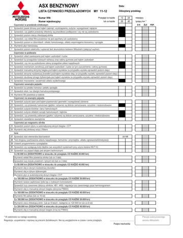 ASX BENZYNOWY Data: LISTA CZYNNOŚCI PRZEGLĄDOWYCH MY 11-12 Odczytany przebieg: Numer VIN: Numer rejestracyjny: Przegląd co każde 12 24 miesięcy lub co każde 20 40 tysięcy km * Czynności w przedziale silnikowym OK ŹLE POP. 1 Sprawdzić pasek klinowy pod kątem pęknięć, wystrzępienia, zużycia i wyregulować napięcie 2 Sprawdzić, czy giętkie przewody chłodnicy są prawidłowo podłączone i czy nie są uszkodzone. 3 Sprawdzić poziom cieczy chłodzącej silnika 4 Sprawdzić, czy wkład filtra powietrza nie jest zapchany lub uszkodzony 5 Sprawdzić poziom w zbiornikach: układu hamulcowego, układu wspomagania kierownicy i sprzęgła 6 Wymienić płyn hamulcowy 7 Sprawdzić poziom elektrolitu i wykonać test akumulatora testerem Mitsubishi (załączyć wydruk). Czynności w podwoziu 8 Sprawdzić układ zawieszenia pod kątem uszkodzeń i luzów 9 Sprawdzić luz przegubów kulowych wahaczy oraz osłony gumowe pod kątem uszkodzeń 10 Sprawdzić, czy nie są uszkodzone osłony przegubów półosi napędowych 11 Sprawdzić mechanizm zwrotniczy pod kątem uszkodzeń i luzów (w tym uszczelnienia i osłony gumowe) 12 Sprawdzić manualną skrzynię biegów pod kątem wycieków (w przypadku wycieku sprawdzić poziom oleju) 13 Sprawdzić skrzynię rozdzielczą (transfer) pod kątem wycieków oleju (w przypadku wycieku sprawdzić poziom oleju) 14 Sprawdzić obudowę tylnego dyferencjału pod kątem wycieków (w przypadku wycieku sprawdzić poziom oleju) 15 Sprawdzić mocowanie i szczelność układu wydechowego Czynności wewnątrz pojazdu 16 Sprawdzić luz pedału hamulca i pedału sprzęgła 17 Sprawdzić skok i luz dźwigni hamulca postojowego 18 Wymienić filtr powietrza w kabinie Czynności na zewnątrz pojazdu 19 Sprawdzić zużycie opon pod kątem poprawności geometrii i wyregulować ciśnienie 20 Sprawdzić, czy przewody hamulcowe (giętkie i sztywne) są dobrze zamocowane, szczelne i nieskorodowane 21 Sprawdzić zużycie klocków i tarcz hamulcowych 22 Sprawdzić zużycie okładzin szczęk hamulcowych i bębnów 23 Sprawdzić, czy przewody paliwowe (giętkie i sztywne) są dobrze zamocowane, szczelne i nieskorodowane 24 Sprawdzić oświetlenie zewnętrzne Czynności po rozgrzaniu silnika 25 Sprawdzić poziom płynu w automatycznej skrzyni biegów i CVT 26 Wymienić olej silnikowy wraz z filtrem Inne co rok 27 Sprawdzić stan elementów blacharskich 28 Test drogowy (zachowanie układu napędowego, hamulców i przyrządów, układu ogrzewania/klimatyzacji) 29 Ustawić przypomnienie o przeglądzie 30 Sprawdzić czy występują kody błędów (we wszystkich systemach przy użyciu testera MUT III) 31 Sprawdzić czy pojazd objęty jest akcjami technicznymi Co 60.000 km (DODATKOWO w stosunku do przeglądu CO KAŻDE 20.000 km) Wymienić wkład filtra powietrza silnika (lub co 3 lata) Sprawdzić luzy łożysk przednich i tylnych kół (lub co 3 lata) Co 80.000 km (DODATKOWO w stosunku do przeglądu CO KAŻDE 40.000 km) Wymienić olej w skrzyni rozdzielczej (transfer) Wymienić olej w tylnym dyferencjale Wymienić płyn w automatycznej skrzyni biegów i CVT Co 100.000 km (DODATKOWO w stosunku do przeglądu CO KAŻDE 20.000 km) Wymienić świece zapłonowe (tylko typ z irydowymi końcówkami) Sprawdzić luzy zaworowe (dotyczy silników: 4B1, 4A9) / regulacja luzu zaworowego poza harmonogramem Wymienić olej w manualnej skrzyni biegów (skrzynia F5M43) Co 160.000 km (DODATKOWO w stosunku do przeglądu CO KAŻDE 40.000 km) Wymienić filtr paliwa (lub co 10 lat) Co 180.000 km (DODATKOWO w stosunku do przeglądu CO KAŻDE 20.000 km) Wymienić ciecz chłodzącą silnik (lub po 9 latach, następnie co 120 000 km lub co 6 lat) Co 200.000 km (DODATKOWO w stosunku do przeglądu CO KAŻDE 40.000 km) Wymienić olej w manualnej skrzyni biegów (inna niż F5M43) * W zależności co nastąpi wcześniej. Regulacje, uzupełnienia i naprawy są pracami dodatkowymi. Nie są uwzględnione w czasie i cenie przeglądu. Pieczęć autoryzowanego ………………………...…… Podpis mechanika serwisu Mitsubishi: