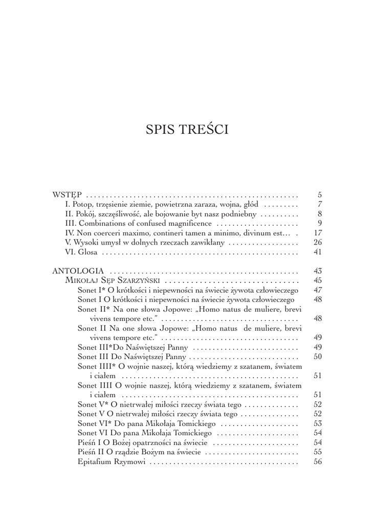 SPIS TREŚCI WSTĘP . . . . . . . . . . . . . . . . . . . . . . . . . . . . . . . . . . . . . . . . . . . . . . . . . . . . . . I. Potop, trzęsienie ziemie, powietrzna zaraza, wojna, głód . . . . . . . . . II. Pokój, szczęśliwość, ale bojowanie byt nasz podniebny . . . . . . . . . . III. Combinations of confused magnificence . . . . . . . . . . . . . . . . . . . . . IV. Non coerceri maximo, contineri tamen a minimo, divinum est… . V. Wysoki umysł w dolnych rzeczach zawikłany . . . . . . . . . . . . . . . . . . VI. Glosa . . . . . . . . . . . . . . . . . . . . . . . . . . . . . . . . . . . . . . . . . . . . . . . . . . 5 7 8 9 17 26 41 ANTOLOGIA . . . . . . . . . . . . . . . . . . . . . . . . . . . . . . . . . . . . . . . . . . . . . . . . 43 45 47 48 MIKOŁAJ SĘP SZARZYŃSKI . . . . . . . . . . . . . . . . . . . . . . . . . . . . . . . Sonet I* O krótkości i niepewności na świecie żywota człowieczego Sonet I O krótkości i niepewności na świecie żywota człowieczego Sonet II* Na one słowa Jopowe: „Homo natus de muliere, brevi vivens tempore etc.” . . . . . . . . . . . . . . . . . . . . . . . . . . . . . . . . . . . Sonet II Na one słowa Jopowe: „Homo natus de muliere, brevi vivens tempore etc.” . . . . . . . . . . . . . . . . . . . . . . . . . . . . . . . . . . . Sonet III*Do Naświętszej Panny . . . . . . . . . . . . . . . . . . . . . . . . . . . Sonet III Do Naświętszej Panny . . . . . . . . . . . . . . . . . . . . . . . . . . . . Sonet IIII* O wojnie naszej, którą wiedziemy z szatanem, światem i ciałem . . . . . . . . . . . . . . . . . . . . . . . . . . . . . . . . . . . . . . . . . . . . . Sonet IIII O wojnie naszej, którą wiedziemy z szatanem, światem i ciałem . . . . . . . . . . . . . . . . . . . . . . . . . . . . . . . . . . . . . . . . . . . . . Sonet V* O nietrwałej miłości rzeczy świata tego . . . . . . . . . . . . . . Sonet V O nietrwałej miłości rzeczy świata tego . . . . . . . . . . . . . . . Sonet VI* Do pana Mikołaja Tomickiego . . . . . . . . . . . . . . . . . . . . Sonet VI Do pana Mikołaja Tomickiego . . . . . . . . . . . . . . . . . . . . . Pieśń I O Bożej opatrzności na świecie . . . . . . . . . . . . . . . . . . . . . . Pieśń II O rządzie Bożym na świecie . . . . . . . . . . . . . . . . . . . . . . . . Epitafium Rzymowi . . . . . . . . . . . . . . . . . . . . . . . . . . . . . . . . . . . . . . 48 49 49 50 51 51 52 52 53 54 54 55 56 [288] WYSOKI UMYSŁ W DOLNYCH RZECZACH ZAWIKŁANY Na śmierć […] Zofijej ze Sprowa Odrowążówny Kostczynej […] inszy tejże . . . . . . . . . . . . . . . . . . . . . . . . . . . . . . . . . . . . . . . . . . . Nagrobek Marcinowi Starzechowskiemu […] drugi temuż . . . . . SEBASTIAN GRABOWIECKI . . . . . . . . . . . . . . . . . . . . . . . . . . . . . . . . [Sonety] . . . . . . . . . . . . . . . . . . . . . . . . . . . . . . . . . . . . . . . . . . . . . . . Z „Setnika pierwszego” . . . . . . . . . . . . . . . . . . . . . . . . . . . . . . . . Sonet 1 . . . . . . . . . . . . . . . . . . . . . . . . . . . . . . . . . . . . . . . . . . Sonet 2 . . . . . . . . . . . . . . . . . . . . . . . . . . . . . . . . . . . . . . . . . . Sonet 10 . . . . . . . . . . . . . . . . . . . . . . . . . . . . . . . . . . . . . . . . . Sonet 11 . . . . . . . . . . . . . . . . . . . . . . . . . . . . . . . . . . . . . . . . . Sonet 12 . . . . . . . . . . . . . . . . . . . . . . . . . . . . . . . . . . . . . . . . . Z „Setnika wtórego” . . . . . . . . . . . . . . . . . . . . . . . . . . . . . . . . . . Sonet 1 . . . . . . . . . . . . . . . . . . . . . . . . . . . . . . . . . . . . . . . . . . Sonet 2 . . . . . . . . . . . . . . . . . . . . . . . . . . . . . . . . . . . . . . . . . . Sonet 3 . . . . . . . . . . . . . . . . . . . . . . . . . . . . . . . . . . . . . . . . . . Sonet 4 . . . . . . . . . . . . . . . . . . . . . . . . . . . . . . . . . . . . . . . . . . [Sonety na siedem grzechów głównych] . . . . . . . . . . . . . . . . . . . . . Z „Setnika pierwszego” . . . . . . . . . . . . . . . . . . . . . . . . . . . . . . . . Sonet 3 Pycha . . . . . . . . . . . . . . . . . . . . . . . . . . . . . . . . . . . . Sonet 4 Zazdrość . . . . . . . . . . . . . . . . . . . . . . . . . . . . . . . . . . Sonet 5 Gniew . . . . . . . . . . . . . . . . . . . . . . . . . . . . . . . . . . . . Sonet 6 Lenistwo . . . . . . . . . . . . . . . . . . . . . . . . . . . . . . . . . . Sonet 7 Łakomstwo . . . . . . . . . . . . . . . . . . . . . . . . . . . . . . . . Sonet 8 Obżarstwo . . . . . . . . . . . . . . . . . . . . . . . . . . . . . . . . Sonet 9 Nieczystość . . . . . . . . . . . . . . . . . . . . . . . . . . . . . . . . [Pieśni] . . . . . . . . . . . . . . . . . . . . . . . . . . . . . . . . . . . . . . . . . . . . . . . . Z „Setnika pierwszego” . . . . . . . . . . . . . . . . . . . . . . . . . . . . . . . . II . . . . . . . . . . . . . . . . . . . . . . . . . . . . . . . . . . . . . . . . . . . . . . . VII . . . . . . . . . . . . . . . . . . . . . . . . . . . . . . . . . . . . . . . . . . . . . . IX . . . . . . . . . . . . . . . . . . . . . . . . . . . . . . . . . . . . . . . . . . . . . . XXIII . . . . . . . . . . . . . . . . . . . . . . . . . . . . . . . . . . . . . . . . . . . XXXI . . . . . . . . . . . . . . . . . . . . . . . . . . . . . . . . . . . . . . . . . . . . XXXV . . . . . . . . . . . . . . . . . . . . . . . . . . . . . . . . . . . . . . . . . . . LXXVI . . . . . . . . . . . . . . . . . . . . . . . . . . . . . . . . . . . . . . . . . . Z „Setnika wtórego” . . . . . . . . . . . . . . . . . . . . . . . . . . . . . . . . . . XXI . . . . . . . . . . . . . . . . . . . . . . . . . . . . . . . . . . . . . . . . . . . . . XXIII . . . . . . . . . . . . . . . . . . . . . . . . . . . . . . . . . . . . . . . . . . . XLVII . . . . . . . . . . . . . . . . . . . . . . . . . . . . . . . . . . . . . . . . . . . LXXIII . . . . . . . . . . . . . . . . . . . . . . . . . . . . . . . 
