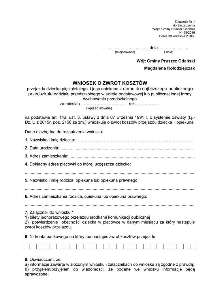Załącznik Nr 1 do Zarządzenia Wójta Gminy Pruszcz Gdański Nr 98/2016 z dnia 30 września 2016r. ......................................, dnia.......................... (miejscowość) ( data) Wójt Gminy Pruszcz Gdański Magdalena Kołodziejczak WNIOSEK O ZWROT KOSZTÓW przejazdu dziecka pięcioletniego i jego opiekuna z domu do najbliższego publicznego przedszkola oddziału przedszkolnego w szkole podstawowej lub publicznej innej formy wychowania przedszkolnego za miesiąc …………………..……….. rok……………… (wpisać słownie) na podstawie art. 14a, ust. 3, ustawy z dnia 07 września 1991 r. o systemie oświaty (t.j.Dz. U z 2015r. poz. 2156 ze zm.) wnioskuję o zwrot kosztów przejazdu dziecka i opiekuna Dane niezbędne do rozpatrzenia wniosku: 1. Nazwisko i imię dziecka: …………..…………………………………………………………… 2. Data urodzenia: .................................................................................................................. 3. Adres zamieszkania: ........................................................................................................... 4. Dokładny adres placówki do której uczęszcza dziecko: ................................................................................................................................................. 5. Nazwisko i imię rodzica, opiekuna lub opiekuna prawnego: ................................................................................................................................................. 6. Adres zamieszkania rodzica, opiekuna lub opiekuna prawnego: ................................................................................................................................................. 7. Załączniki do wniosku:* 1) bilety jednorazowego przejazdu środkami komunikacji publicznej 2) potwierdzenie obecności dziecka w placówce w danym miesiącu za który następuje zwrot kosztów przejazdu. 8. Nr konta bankowego na który ma nastąpić zwrot kosztów przejazdu. 9. Oświadczam, że: a) informacje zawarte w złożonym wniosku i załącznikach do wniosku są zgodne z prawdą; b) przyjąłem/przyjęłam do wiadomości, że podane we wniosku informacje będą sprawdzone; c) wyrażam zgodę na przetwarzanie danych osobowych zawartych we wniosku, dla celów związanych ze zwrotem kosztów przejazdu dziecka do placówki zgodnie z ustawą, z dnia 29 sierpnia 1997 r. o ochronie danych osobowych (t.j. Dz. U. z 2016r. , poz. 922). .................................................................... (czytelny podpis wnioskodawcy)