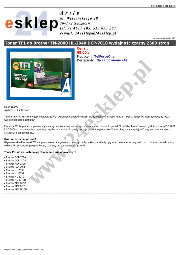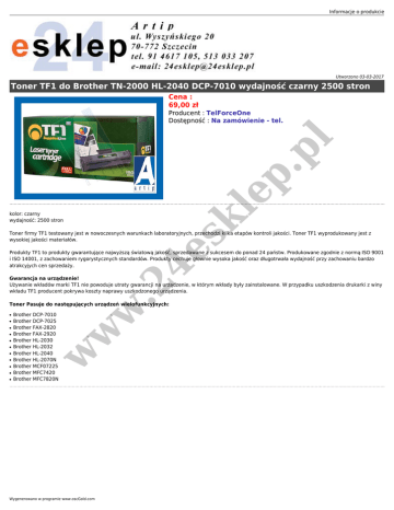 Informacje o produkcie Utworzono 03-03-2017 Toner TF1 do Brother TN-2000 HL-2040 DCP-7010 wydajność czarny 2500 stron Cena : 69,00 zł le p. p l Producent : TelForceOne Dostępność : Na zamówienie - tel. sk kolor: czarny wydajność: 2500 stron 4e Toner firmy TF1 testowany jest w nowoczesnych warunkach laboratoryjnych, przechodzi kilka etapów kontroli jakości. Toner TF1 wyprodukowany jest z wysokiej jakości materiałów. Produkty TF1 to produkty gwarantujące najwyższą światową jakość, sprzedawane z sukcesem do ponad 24 państw. Produkowane zgodnie z normą ISO 9001 i ISO 14001, z zachowaniem rygorystycznych standardów. Produkty cechuje głownie wysoka jakość oraz długotrwała wydajność przy zachowaniu bardzo atrakcyjych cen sprzedaży. .2 Gwarancja na urządzenie! Używanie wkładów marki TF1 nie powoduje utraty gwarancji na urządzenie, w którym wkłady były zainstalowane. W przypadku uszkodzenia drukarki z winy wkładu TF1 producent pokrywa koszty naprawy uszkodzonego urządzenia. ● ● ● ● ● ● ● ● ● ● Brother DCP-7010 Brother DCP-7025 Brother FAX-2820 Brother FAX-2920 Brother HL-2030 Brother HL-2032 Brother HL-2040 Brother HL-2070N Brother MCF07225 Brother MFC7420 Brother MFC7820N w ● w w Toner Pasuje do następujących urządzeń wielofunkcyjnych: Wygenerowano w programie www.oscGold.com