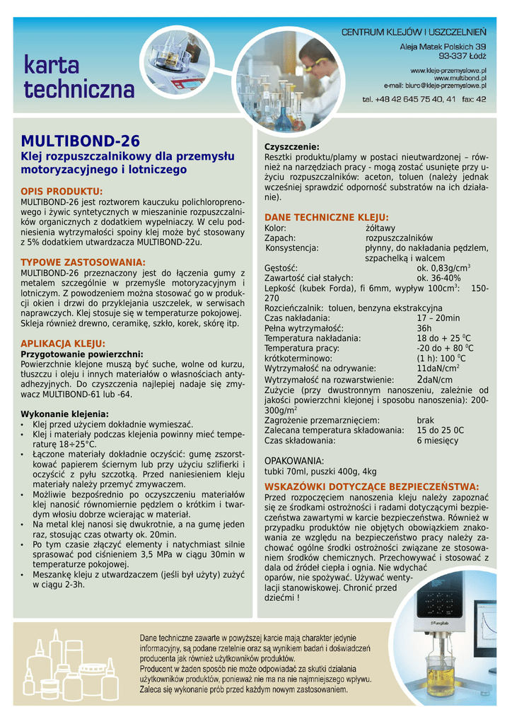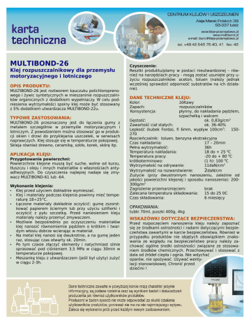 MULTIBOND-26 Klej rozpuszczalnikowy dla przemysłu motoryzacyjnego i lotniczego OPIS PRODUKTU: MULTIBOND-26 jest roztworem kauczuku polichloroprenowego i żywic syntetycznych w mieszaninie rozpuszczalników organicznych z dodatkiem wypełniaczy. W celu podniesienia wytrzymałości spoiny klej może być stosowany z 5% dodatkiem utwardzacza MULTIBOND-22u. TYPOWE ZASTOSOWANIA: MULTIBOND-26 przeznaczony jest do łączenia gumy z metalem szczególnie w przemyśle motoryzacyjnym i lotniczym. Z powodzeniem można stosować go w produkcji okien i drzwi do przyklejania uszczelek, w serwisach naprawczych. Klej stosuje się w temperaturze pokojowej. Skleja również drewno, ceramikę, szkło, korek, skórę itp. APLIKACJA KLEJU: Przygotowanie powierzchni: Powierzchnie klejone muszą być suche, wolne od kurzu, tłuszczu i oleju i innych materiałów o własnościach antyadhezyjnych. Do czyszczenia najlepiej nadaje się zmywacz MULTIBOND-61 lub -64. Wykonanie klejenia: • Klej przed użyciem dokładnie wymieszać. • Klej i materiały podczas klejenia powinny mieć temperaturę 18÷25°C. • Łączone materiały dokładnie oczyścić: gumę zszorstkować papierem ściernym lub przy użyciu szlifierki i oczyścić z pyłu szczotką. Przed naniesieniem kleju materiały należy przemyć zmywaczem. • Możliwie bezpośrednio po oczyszczeniu materiałów klej nanosić równomiernie pędzlem o krótkim i twardym włosiu dobrze wcierając w materiał. • Na metal klej nanosi się dwukrotnie, a na gumę jeden raz, stosując czas otwarty ok. 20min. • Po tym czasie złączyć elementy i natychmiast silnie sprasować pod ciśnieniem 3,5 MPa w ciągu 30min w temperaturze pokojowej. • Meszankę kleju z utwardzaczem (jeśli był użyty) zużyć w ciągu 2-3h. Czyszczenie: Resztki produktu/plamy w postaci nieutwardzonej – również na narzędziach pracy - mogą zostać usunięte przy użyciu rozpuszczalników: aceton, toluen (należy jednak wcześniej sprawdzić odporność substratów na ich działanie). DANE TECHNICZNE KLEJU: Kolor: Zapach: Konsystencja: żółtawy rozpuszczalników płynny, do nakładania pędzlem, szpachelką i walcem Gęstość: ok. 0,83g/cm3 Zawartość ciał stałych: ok. 36-40% Lepkość (kubek Forda), fi 6mm, wypływ 100cm3: 150270 Rozcieńczalnik: toluen, benzyna ekstrakcyjna Czas nakładania: 17 – 20min Pełna wytrzymałość: 36h Temperatura nakładania: 18 do + 25 0C Temperatura pracy: -20 do + 80 0C krótkoterminowo: (1 h): 100 0C Wytrzymałość na odrywanie: 11daN/cm2 Wytrzymałość na rozwarstwienie: 2daN/cm Zużycie (przy dwustronnym nanoszeniu, zależnie od jakości powierzchni klejonej i sposobu nanoszenia): 200300g/m2 Zagrożenie przemarznięciem: brak Zalecana temperatura składowania: 15 do 25 0C Czas składowania: 6 miesięcy OPAKOWANIA: tubki 70ml, puszki 400g, 4kg WSKAZÓWKI DOTYCZĄCE BEZPIECZEŃSTWA: Przed rozpoczęciem nanoszenia kleju należy zapoznać się ze środkami ostrożności i radami dotyczącymi bezpieczeństwa zawartymi w karcie bezpieczeństwa. Również w przypadku produktów nie objętych obowiązkiem znakowania ze względu na bezpieczeństwo pracy należy zachować ogólne środki ostrożności związane ze stosowaniem środków chemicznych. Przechowywać i stosować z dala od źródeł ciepła i ognia. Nie wdychać oparów, nie spożywać. Używać wentylacji stanowiskowej. Chronić przed dziećmi !