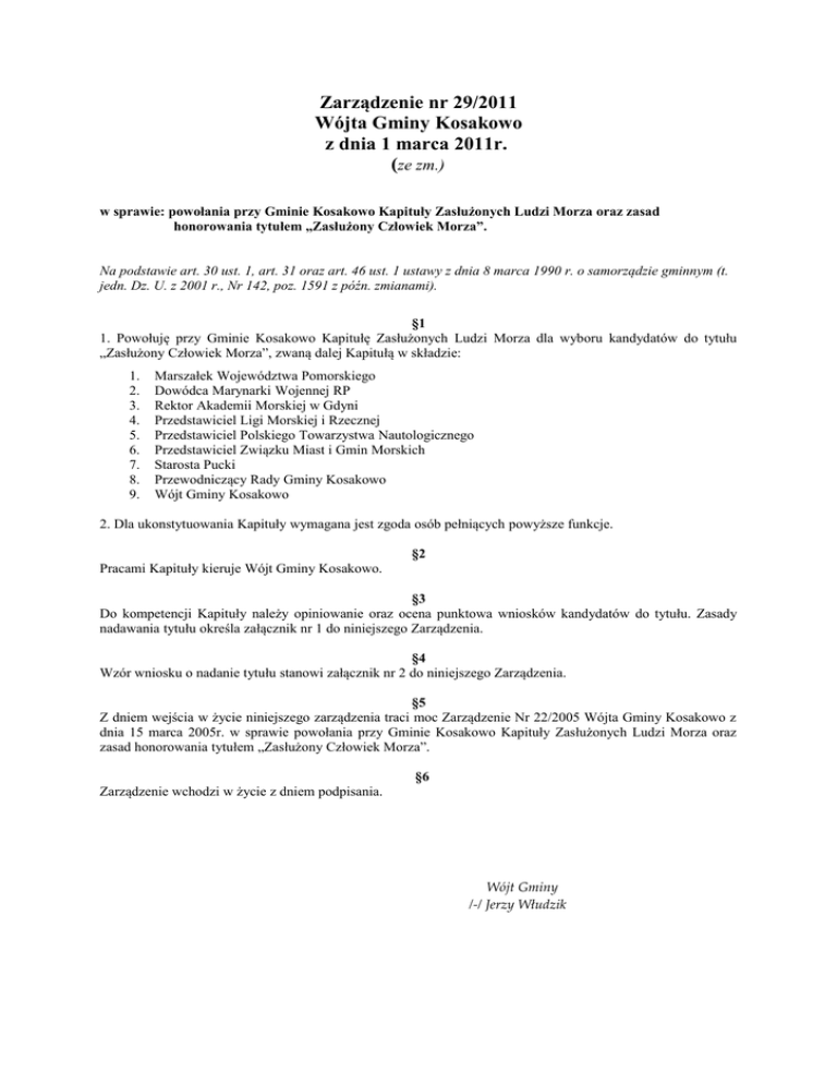 Zarządzenie nr 29/2011 Wójta Gminy Kosakowo z dnia 1 marca 2011r. (ze zm.) w sprawie: powołania przy Gminie Kosakowo Kapituły Zasłużonych Ludzi Morza oraz zasad honorowania tytułem „Zasłużony Człowiek Morza”. Na podstawie art. 30 ust. 1, art. 31 oraz art. 46 ust. 1 ustawy z dnia 8 marca 1990 r. o samorządzie gminnym (t. jedn. Dz. U. z 2001 r., Nr 142, poz. 1591 z późn. zmianami). §1 1. Powołuję przy Gminie Kosakowo Kapitułę Zasłużonych Ludzi Morza dla wyboru kandydatów do tytułu „Zasłużony Człowiek Morza”, zwaną dalej Kapitułą w składzie: 1. 2. 3. 4. 5. 6. 7. 8. 9. Marszałek Województwa Pomorskiego Dowódca Marynarki Wojennej RP Rektor Akademii Morskiej w Gdyni Przedstawiciel Ligi Morskiej i Rzecznej Przedstawiciel Polskiego Towarzystwa Nautologicznego Przedstawiciel Związku Miast i Gmin Morskich Starosta Pucki Przewodniczący Rady Gminy Kosakowo Wójt Gminy Kosakowo 2. Dla ukonstytuowania Kapituły wymagana jest zgoda osób pełniących powyższe funkcje. §2 Pracami Kapituły kieruje Wójt Gminy Kosakowo. §3 Do kompetencji Kapituły należy opiniowanie oraz ocena punktowa wniosków kandydatów do tytułu. Zasady nadawania tytułu określa załącznik nr 1 do niniejszego Zarządzenia. §4 Wzór wniosku o nadanie tytułu stanowi załącznik nr 2 do niniejszego Zarządzenia. §5 Z dniem wejścia w życie niniejszego zarządzenia traci moc Zarządzenie Nr 22/2005 Wójta Gminy Kosakowo z dnia 15 marca 2005r. w sprawie powołania przy Gminie Kosakowo Kapituły Zasłużonych Ludzi Morza oraz zasad honorowania tytułem „Zasłużony Człowiek Morza”. §6 Zarządzenie wchodzi w życie z dniem podpisania. Wójt Gminy /-/ Jerzy Włudzik załącznik do Zarządzenia Nr 14/2013 Wójta Gminy Kosakowo z dnia 28 stycznia 2013r. Zasady honorowania tytułem „Zasłużony Człowiek Morza” 1. 2. 3. §1 Tytuł „Zasłużony Człowiek Morza”, zwany dalej tytułem, nadaje się osobie, która swoim życiem, postawą, pracą przysporzyła sławy polskiemu morzu i przyniosła chwałę ojczyźnie. Nadanie tytułu nie skutkuje żadnymi zobowiązaniami wobec Gminy Kosakowo. Wraz z nadaniem tytułu następuje odsłonięcie tablicy pamiątkowej w Ogólnopolskiej Alei Zasłużonych Ludzi Morza w Rewie, gmina Kosakowo. §2 Kandydatów do tytułu mogą zgłaszać przedstawiciele organów władzy i administracji publicznej oraz osoby prawne, których działalność statutowa jest związana z morzem. 2. Kandydaturę zgłasza się Wójtowi Gminy Kosakowo w formie wniosku wraz z uzasadnieniem, nie później niż do 31 marca. §3 Kandydatów do tytułu wyłania Kapituła Zasłużonych Ludzi Morza, powołana przez Wójta Gminy Kosakowo. §4 1. Prace Kapituły polegają na opiniowaniu przez jej członków zgłoszonych wniosków, przesyłanych w każdym roku każdemu z członków przez Wójta Gminy Kosakowo niezwłocznie po upływie terminu do ich składania. 2. Wskazując do nominacji kandydaturę, członek Kapituły przyznaje maksymalnie trzem wnioskom punkty w liczbie od 1-3. 3. Członkowie Kapituły przekazują Wójtowi Gminy Kosakowo opinię, o jakiej mowa w pkt. 1, najpóźniej do 15 kwietnia. §5 1. W roku nadaje się maksymalnie 3 tytuły. 2. Tytuł nadaje się tym osobom wyłonionym przez Kapitułę, których zgłoszone kandydatury uzyskały największą liczbę punktów. 3. Do nadania tytułu wymagana jest zgoda ustalonych spadkobierców kandydata. O braku zgody ustalonych spadkobierców na nominację do tytułu powiadamia się członków Kapituły. 4. Z podsumowania punktów Wójt sporządza protokół, którego kopie przesyła członkom Kapituły do wiadomości. Protokół przechowywany jest wraz z wnioskami przez okres 1 roku. Dokumentacja z postępowania jest dostępna dla członków Kapituły. 5. Wynik z przeliczenia punktów jest wiążący. 6. Wnioski nie zakwalifikowane w danym roku, mogą być opiniowane ponownie w latach następnych. §6 Wójt Gminy Kosakowo prowadzi księgę nadawanych tytułów. 1. §7 1. Uroczystość nadawania tytułu oraz odsłonięcie tablic pamiątkowych w Ogólnopolskiej Alei Zasłużonych Ludzi Morza w Rewie odbywa się corocznie w miesiącu czerwcu. 2. Organizatorem uroczystości jest Wójt Gminy Kosakowo. Członkowie Kapituły uczestniczą w uroczystościach na prawach organizatora Data wniosku ........................ załącznik do Zarządzenia Nr 29/2011 Wójta Gminy Kosakowo z dnia 1 marca 2011r. Wójt Gminy Kosakowo ul. Żeromskiego 69 81-198 KOSAKOWO WNIOSEK O nadanie tytułu „Zasłużony Człowiek Morza” wraz z odsłonięciem tablicy pamiątkowej w Alei Zasłużonych Ludzi Morza w Rewie, gmina Kosakowo, woj. pomorskie. I Zgłaszający ............................................................................................................................ (organ władzy, administracji publicznej, osoba prawna) II Dane o osobie zgłaszanej do tytułu „Zasłużony Człowiek Morza” 1. Imię i nazwisko.............................................................................................................. 2. Data urodzenia............................................................................................................... 3. Miejsce zamieszkania (lub dla osoby nieżyjącej adres ustalonych spadkobierców) ........................................................................................................................................... III Uzasadnienie (maksymalnie 1,5 strony) ...................................................................................................................................................... ...................................................................................................................................................... ...................................................................................................................................................... .................................................................. podpis upe