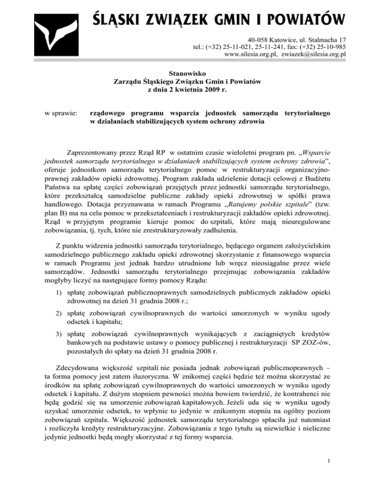40-058 Katowice, ul. Stalmacha 17 tel.: (+32) 25-11-021, 25-11-241, fax: (+32) 25-10-985 www.silesia.org.pl, [email protected] Stanowisko Zarządu Śląskiego Związku Gmin i Powiatów z dnia 2 kwietnia 2009 r. w sprawie: rządowego programu wsparcia jednostek samorządu terytorialnego w działaniach stabilizujących system ochrony zdrowia Zaprezentowany przez Rząd RP w ostatnim czasie wieloletni program pn. „Wsparcie jednostek samorządu terytorialnego w działaniach stabilizujących system ochrony zdrowia”, oferuje jednostkom samorządu terytorialnego pomoc w restrukturyzacji organizacyjnoprawnej zakładów opieki zdrowotnej. Program zakłada udzielenie dotacji celowej z BudŜetu Państwa na spłatę części zobowiązań przejętych przez jednostki samorządu terytorialnego, które przekształcą samodzielne publiczne zakłady opieki zdrowotnej w spółki prawa handlowego. Dotacja przyznawana w ramach Programu ,,Ratujemy polskie szpitale” (tzw. plan B) ma na celu pomoc w przekształceniach i restrukturyzacji zakładów opieki zdrowotnej. Rząd w przyjętym programie kieruje pomoc do szpitali, które mają nieuregulowane zobowiązania, tj. tych, które nie zrestrukturyzowały zadłuŜenia. Z punktu widzenia jednostki samorządu terytorialnego, będącego organem załoŜycielskim samodzielnego publicznego zakładu opieki zdrowotnej skorzystanie z finansowego wsparcia w ramach Programu jest jednak bardzo utrudnione lub wręcz nieosiągalne przez wiele samorządów. Jednostki samorządu terytorialnego przejmując zobowiązania zakładów mogłyby liczyć na następujące formy pomocy Rządu: 1) spłatę zobowiązań publicznoprawnych samodzielnych publicznych zakładów opieki zdrowotnej na dzień 31 grudnia 2008 r.; 2) spłatę zobowiązań cywilnoprawnych do wartości umorzonych w wyniku ugody odsetek i kapitału; 3) spłatę zobowiązań cywilnoprawnych wynikających z zaciągniętych kredytów bankowych na podstawie ustawy o pomocy publicznej i restrukturyzacji SP ZOZ-ów, pozostałych do spłaty na dzień 31 grudnia 2008 r. Zdecydowana większość szpitali nie posiada jednak zobowiązań publicznoprawnych – ta forma pomocy jest zatem iluzoryczna. W znikomej części będzie teŜ moŜna skorzystać ze środków na spłatę zobowiązań cywilnoprawnych do wartości umorzonych w wyniku ugody odsetek i kapitału. Z duŜym stopniem pewności moŜna bowiem twierdzić, Ŝe kontrahenci nie będą godzić się na umorzenie zobowiązań kapitałowych. JeŜeli uda się w wyniku ugody uzyskać umorzenie odsetek, to wpłynie to jedynie w znikomym stopniu na ogólny poziom zobowiązań szpitala. Większość jednostek samorządu terytorialnego spłaciła juŜ natomiast i rozliczyła kredyty restrukturyzacyjne. Zobowiązania z tego tytułu są niewielkie i nieliczne jedynie jednostki będą mogły skorzystać z tej formy wsparcia. 1 Średnie zadłuŜenie szpitali 300-600 łóŜkowych kształtuje się na poziomie od kilkunastu do kilkudziesięciu mln zł. Skorzystanie z „Planu B” na pewno daje moŜliwość restrukturyzacji organizacyjno-prawnych samodzielnych publicznych zakładów opieki zdrowotnej (tj. przekształcenia w spółki prawa handlowego). Niestety nie zwolni to samorządów lokalnych ze spłaty zobowiązań zakładów opieki zdrowotnej. Ponadto Program ,,Ratujemy polskie szpitale” nie uwzględnia jakichkolwiek form wsparcia dla jednostek samorządu terytorialnego, które w przeszłości przekształciły samodzielne publiczne zakłady opieki zdrowotnej. Samorządy, które były prekursorami zmian i dokonały przekształceń szpitali przed wprowadzeniem Programu, nie otrzymają rządowej pomocy. Jednostki samorządu terytorialnego dokonując przekształceń samodzielnych publicznych zakładów opieki zdrowotnej w spółki prawa handlowego przejęły - zgodnie z treścią art. 60 ust. 6 ustawy z dnia 30 sierpnia 1991 r. o zakładach opieki zdrowotnej zobowiązania tych zakładów. W związku z powyŜszym przeznaczając ogromne srodki finansowe na oddłuŜenie, nie mogły inwestować w dostosowanie i wyposaŜenie tychŜe szpitali. Wskazujemy zatem na konieczność uwzględnienia w rządowym programie tych finansowych form wsparcia, które będą bardziej pomocne dla jednostek samorządu terytorialnego oraz tych jednostek, które dokonały w przeszłości przekształceń samodzielnych publicznych zakładów opieki zdrowotnej w spółki prawa handlowego, w wyniku czego przejęły zobowiązania tych jednostek. Opracowanie projektu: na podstawie uwag Wydziału Zdrowia i Spraw Społecznych Urzędu Miejskiego w Gliwicach (e-mail: [email protected],) oraz UM w Bytomiu 2