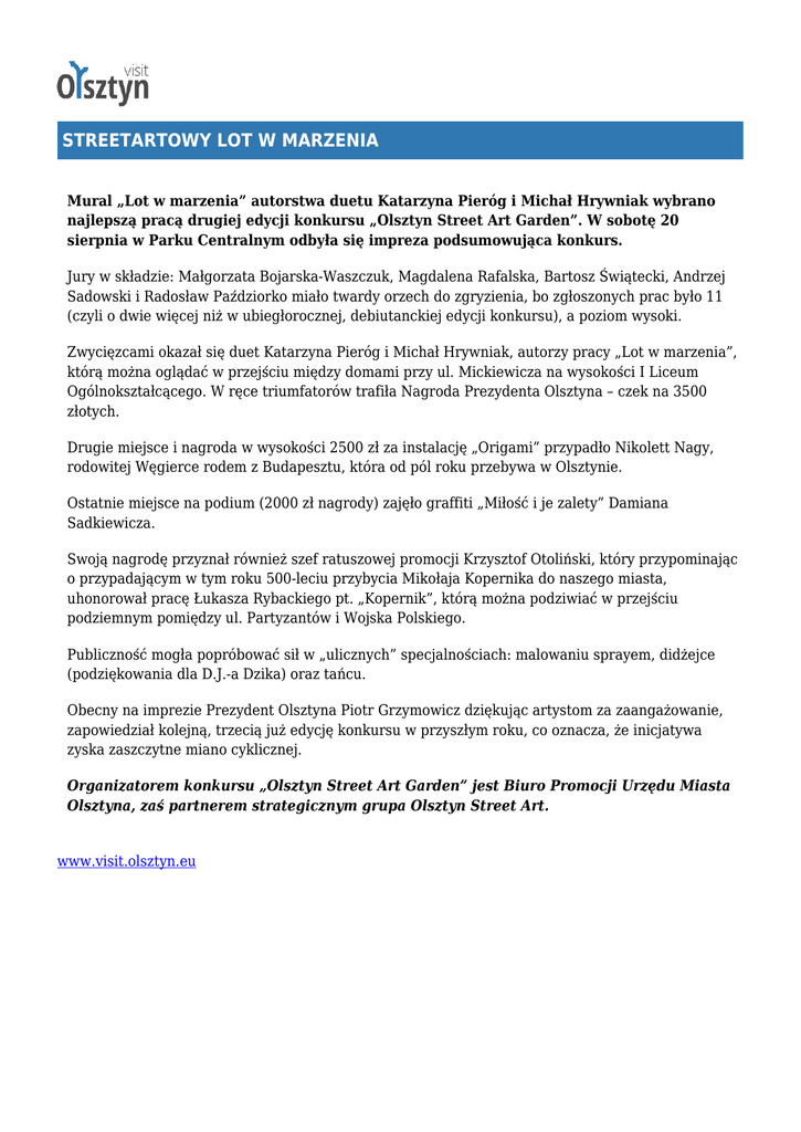 STREETARTOWY LOT W MARZENIA Mural „Lot w marzenia” autorstwa duetu Katarzyna Pieróg i Michał Hrywniak wybrano najlepszą pracą drugiej edycji konkursu „Olsztyn Street Art Garden”. W sobotę 20 sierpnia w Parku Centralnym odbyła się impreza podsumowująca konkurs. Jury w składzie: Małgorzata Bojarska-Waszczuk, Magdalena Rafalska, Bartosz Świątecki, Andrzej Sadowski i Radosław Paździorko miało twardy orzech do zgryzienia, bo zgłoszonych prac było 11 (czyli o dwie więcej niż w ubiegłorocznej, debiutanckiej edycji konkursu), a poziom wysoki. Zwycięzcami okazał się duet Katarzyna Pieróg i Michał Hrywniak, autorzy pracy „Lot w marzenia”, którą można oglądać w przejściu między domami przy ul. Mickiewicza na wysokości I Liceum Ogólnokształcącego. W ręce triumfatorów trafiła Nagroda Prezydenta Olsztyna – czek na 3500 złotych. Drugie miejsce i nagroda w wysokości 2500 zł za instalację „Origami” przypadło Nikolett Nagy, rodowitej Węgierce rodem z Budapesztu, która od pól roku przebywa w Olsztynie. Ostatnie miejsce na podium (2000 zł nagrody) zajęło graffiti „Miłość i je zalety” Damiana Sadkiewicza. Swoją nagrodę przyznał również szef ratuszowej promocji Krzysztof Otoliński, który przypominając o przypadającym w tym roku 500-leciu przybycia Mikołaja Kopernika do naszego miasta, uhonorował pracę Łukasza Rybackiego pt. „Kopernik”, którą można podziwiać w przejściu podziemnym pomiędzy ul. Partyzantów i Wojska Polskiego. Publiczność mogła popróbować sił w „ulicznych” specjalnościach: malowaniu sprayem, didżejce (podziękowania dla D.J.-a Dzika) oraz tańcu. Obecny na imprezie Prezydent Olsztyna Piotr Grzymowicz dziękując artystom za zaangażowanie, zapowiedział kolejną, trzecią już edycję konkursu w przyszłym roku, co oznacza, że inicjatywa zyska zaszczytne miano cyklicznej. Organizatorem konkursu „Olsztyn Street Art Garden” jest Biuro Promocji Urzędu Miasta Olsztyna, zaś partnerem strategicznym grupa Olsztyn Street Art. www.visit.olsztyn.eu