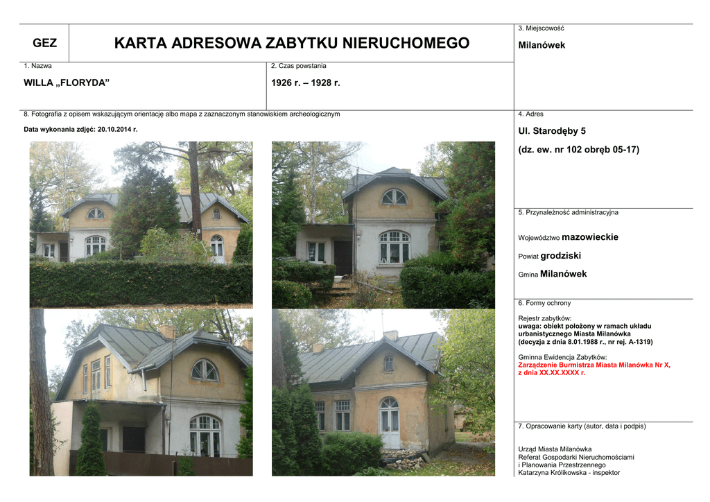 3. Miejscowość GEZ KARTA ADRESOWA ZABYTKU NIERUCHOMEGO 1. Nazwa 2. Czas powstania WILLA „FLORYDA” 1926 r. – 1928 r. Milanówek 8. Fotografia z opisem wskazującym orientację albo mapa z zaznaczonym stanowiskiem archeologicznym 4. Adres Data wykonania zdjęć: 20.10.2014 r. Ul. Starodęby 5 (dz. ew. nr 102 obręb 05-17) 5. Przynależność administracyjna Województwo mazowieckie Powiat grodziski Gmina Milanówek 6. Formy ochrony Rejestr zabytków: uwaga: obiekt położony w ramach układu urbanistycznego Miasta Milanówka (decyzja z dnia 8.01.1988 r., nr rej. A-1319) Gminna Ewidencja Zabytków: Zarządzenie Burmistrza Miasta Milanówka Nr X, z dnia XX.XX.XXXX r. 7. Opracowanie karty (autor, data i podpis) Urząd Miasta Milanówka Referat Gospodarki Nieruchomościami i Planowania Przestrzennego Katarzyna Królikowska - inspektor