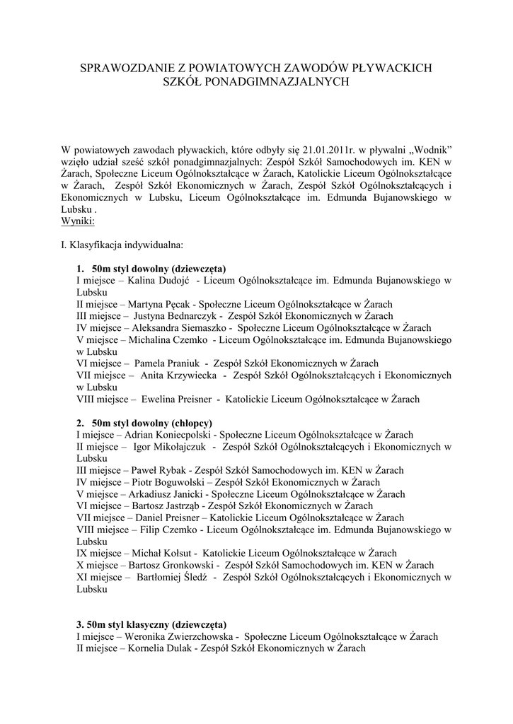 SPRAWOZDANIE Z POWIATOWYCH ZAWODÓW PŁYWACKICH SZKÓŁ PONADGIMNAZJALNYCH W powiatowych zawodach pływackich, które odbyły się 21.01.2011r. w pływalni „Wodnik” wzięło udział sześć szkół ponadgimnazjalnych: Zespół Szkół Samochodowych im. KEN w Żarach, Społeczne Liceum Ogólnokształcące w Żarach, Katolickie Liceum Ogólnokształcące w Żarach, Zespół Szkół Ekonomicznych w Żarach, Zespół Szkół Ogólnokształcących i Ekonomicznych w Lubsku, Liceum Ogólnokształcące im. Edmunda Bujanowskiego w Lubsku . Wyniki: I. Klasyfikacja indywidualna: 1. 50m styl dowolny (dziewczęta) I miejsce – Kalina Dudojć - Liceum Ogólnokształcące im. Edmunda Bujanowskiego w Lubsku II miejsce – Martyna Pęcak - Społeczne Liceum Ogólnokształcące w Żarach III miejsce – Justyna Bednarczyk - Zespół Szkół Ekonomicznych w Żarach IV miejsce – Aleksandra Siemaszko - Społeczne Liceum Ogólnokształcące w Żarach V miejsce – Michalina Czemko - Liceum Ogólnokształcące im. Edmunda Bujanowskiego w Lubsku VI miejsce – Pamela Praniuk - Zespół Szkół Ekonomicznych w Żarach VII miejsce – Anita Krzywiecka - Zespół Szkół Ogólnokształcących i Ekonomicznych w Lubsku VIII miejsce – Ewelina Preisner - Katolickie Liceum Ogólnokształcące w Żarach 2. 50m styl dowolny (chłopcy) I miejsce – Adrian Koniecpolski - Społeczne Liceum Ogólnokształcące w Żarach II miejsce – Igor Mikołajczuk - Zespół Szkół Ogólnokształcących i Ekonomicznych w Lubsku III miejsce – Paweł Rybak - Zespół Szkół Samochodowych im. KEN w Żarach IV miejsce – Piotr Boguwolski – Zespół Szkół Ekonomicznych w Żarach V miejsce – Arkadiusz Janicki - Społeczne Liceum Ogólnokształcące w Żarach VI miejsce – Bartosz Jastrząb - Zespół Szkół Ekonomicznych w Żarach VII miejsce – Daniel Preisner – Katolickie Liceum Ogólnokształcące w Żarach VIII miejsce – Filip Czemko - Liceum Ogólnokształcące im. Edmunda Bujanowskiego w Lubsku IX miejsce – Michał Kołsut - Katolickie Liceum Ogólnokształcące w Żarach X miejsce – Bartosz Gronkowski - Zespół Szkół Samochodowych im. KEN w Żarach XI miejsce – Bartłomiej Śledź - Zespół Szkół Ogólnokształcących i Ekonomicznych w Lubsku 3. 50m styl klasyczny (dziewczęta) I miejsce – Weronika Zwierzchowska - Społeczne Liceum Ogólnokształcące w Żarach II miejsce – Kornelia Dulak - Zespół Szkół Ekonomicznych w Żarach III miejsce – Katarzyna Blitek - Społeczne Liceum Ogólnokształcące w Żarach IV miejsce – Gabriela Boniec - Zespół Szkół Ekonomicznych w Żarach V miejsce – Karolina Wojnarowska Zespół Szkół Ogólnokształcących i Ekonomicznych w Lubsku 4. 50m styl klasyczny (chłopcy) I miejsce – Piotr Strojnowski - Zespół Szkół Ekonomicznych w Żarach II miejsce – Aleksander Jamont - Społeczne Liceum Ogólnokształcące w Żarach III miejsce – Daniel Preisner – Katolickie Liceum Ogólnokształcące w Żarach IV miejsce – Dariusz Kordek - Zespół Szkół Ekonomicznych w Żarach V miejsce – Jakub Barczyk - Społeczne Liceum Ogólnokształcące w Żarach VI miejsce – Jędrzej Krzyżański – Katolickie Liceum Ogólnokształcące w Żarach VII miejsce – Szymon Ebertowski - Zespół Szkół Samochodowych im. KEN w Żarach VIII miejsce – Damian Barszczuk - Zespół Szkół Samochodowych im. KEN w Żarach 5. 50m styl grzbietowy (dziewczęta) I miejsce – Martyna Pęcak - Społeczne Liceum Ogólnokształcące w Żarach II miejsce – Aleksandra Siemaszko - Społeczne Liceum Ogólnokształcące w Żarach III miejsce – Kalina Dudojć - Liceum Ogólnokształcące im. Edmunda Bujanowskiego w Lubsku IV miejsce – Ewelina Preisner – Katolickie Liceum Ogólnokształcące w Żarach V miejsce – Agnieszka Paczkowska - Zespół Szkół Ekonomicznych w Żarach VI miejsce – Milena Jarosz - Zespół Szkół Ogólnokształcących i Ekonomicznych w Lubsku VII miejsce – Olga Kokoszka - Zespół Szkół Ekonomicznych w Żarach VIII miejsce – Alicja Deroń - Zespół Szkół Ogólnokształcących i Ekonomicznych w Lubsku 6. 50m styl grzbietowy (chłopcy) I miejsce – Piotr Olczyk - Społeczne Liceum Ogólnokształcące w Żarach II miejsce – Mateusz Węgrzyn - Społeczne Liceum Ogólnokształcące w Żarach III miejsce – Krystian Kuczma - Zespół Szkół Ekonomicznych w Żarach IV miejsce – Kamil Balcewicz - Katolickie Liceum Ogólnokształcące w Żarach V miejsce – Jacek Kaźmierczak - Zespół Szkół Ekonomicznych w Żarach VI miejsce – Mateusz Niżnik - Katolickie Liceum Ogólnokształcące w Żarach VII miejsce – Mateusz Bartkiewicz - Zespół Szkół Samochodowych im. KEN w Żarach VIII miejsce – Szymon Ebertowski - Zespół Szkół Samochodowych im. KEN w Żarach II. Sztafety 1. 4x50m stylem dowolnym (dziewczęta) I miejsce - Zespół Szkół Ekonomicznych w Żarach II miejsce - Społeczne Liceum Ogólnokształcące w Żarach III miejce - Zespół Szkół Ogólnokształcących i Ekonomicznych w Lubsku 2. 4x50m stylem dowolnym (chłopcy) I miejsce - Społeczne Liceum Ogólnokształcące w Żarach II miejsce - Zespół Szkół Ekonomicznych w Żarach III miejsce - Katolickie Liceum Ogólnokształcące w Żarach IV miejsce - Zespół Szkół Samochodowych im. KEN w Żarach III. Klasyfikacja drużynowa DZIEWCZĘTA I miejsce - Społeczne Liceum Ogólnokształcące w Żarach II miejsce - Zespół Szkół Ekonomicznych w Żarach III miejsce - Liceum Ogólnokształcące im. Edmunda Bujanowskiego w Lubsku IV miejce - Zespół Szkół Ogólnokształcących i Ekonomicznych w Lubsku V miejsce - Katolickie Liceum Ogólnokształcące w Żarach CHŁOPCY I miejsce - Społeczne Liceum Ogólnokształcące w Żarach II miejsce - Zespół Szkół Ekonomicznych w Żarach III miejsce - Katolickie Liceum Ogólnokształcące w Żarach IV miejsce - Zespół Szkół Samochodowych im. KEN w Żarach V miejsce - Zespół Szkół Ogólnokształcących i Ek
