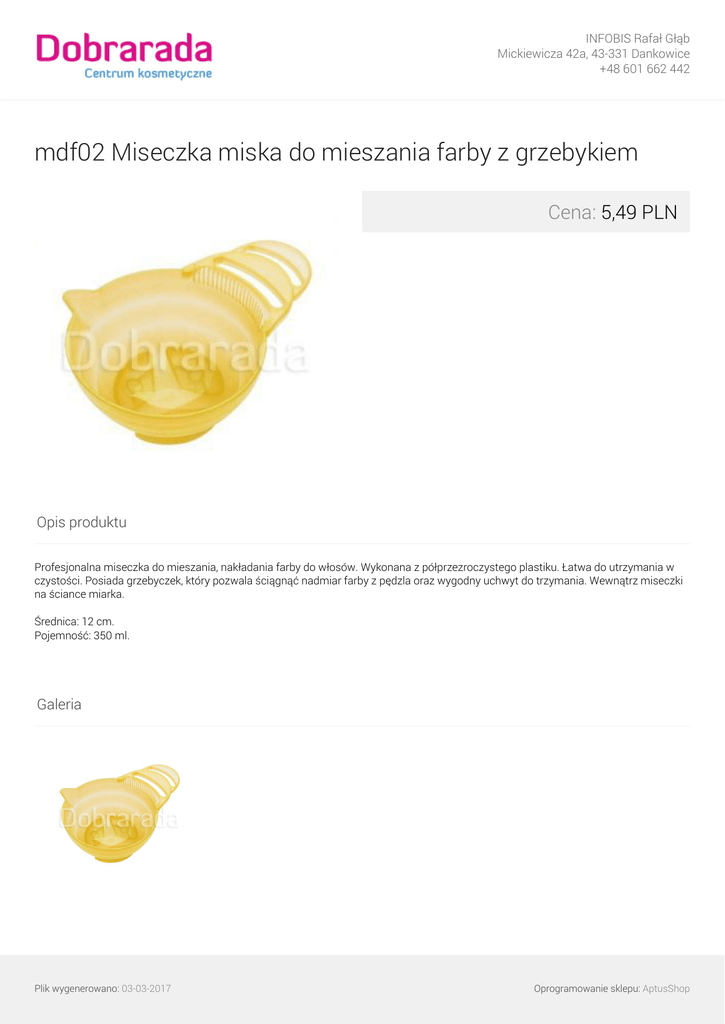 INFOBIS Rafał Głąb Mickiewicza 42a, 43-331 Dankowice +48 601 662 442 mdf02 Miseczka miska do mieszania farby z grzebykiem Cena: 5,49 PLN Opis produktu Profesjonalna miseczka do mieszania, nakładania farby do włosów. Wykonana z półprzezroczystego plastiku. Łatwa do utrzymania w czystości. Posiada grzebyczek, który pozwala ściągnąć nadmiar farby z pędzla oraz wygodny uchwyt do trzymania. Wewnątrz miseczki na ściance miarka. Średnica: 12 cm. Pojemność: 350 ml. Galeria Plik wygenerowano: 03-03-2017 Powered by TCPDF (www.tcpdf.org) Oprogramowanie sklepu: AptusShop