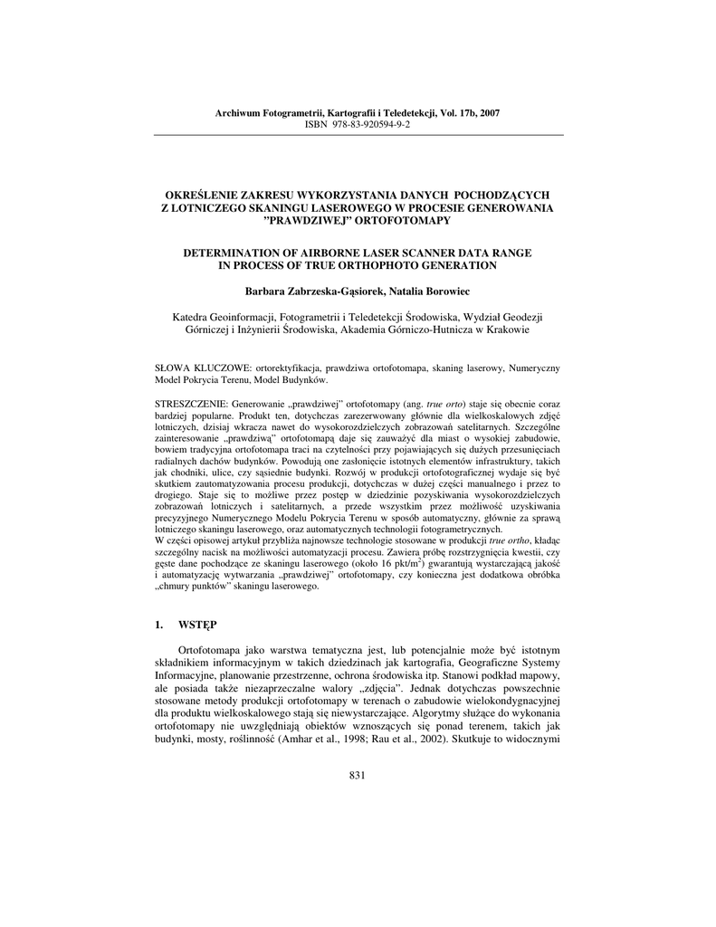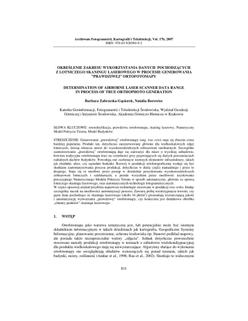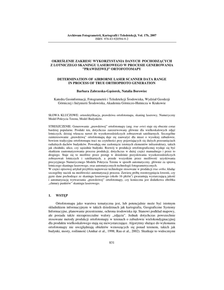 Archiwum Fotogrametrii, Kartografii i Teledetekcji, Vol. 17b, 2007 ISBN 978-83-920594-9-2 OKREŚLENIE ZAKRESU WYKORZYSTANIA DANYCH POCHODZĄCYCH Z LOTNICZEGO SKANINGU LASEROWEGO W PROCESIE GENEROWANIA ”PRAWDZIWEJ” ORTOFOTOMAPY DETERMINATION OF AIRBORNE LASER SCANNER DATA RANGE IN PROCESS OF TRUE ORTHOPHOTO GENERATION Barbara Zabrzeska-Gąsiorek, Natalia Borowiec Katedra Geoinformacji, Fotogrametrii i Teledetekcji Środowiska, Wydział Geodezji Górniczej i Inżynierii Środowiska, Akademia Górniczo-Hutnicza w Krakowie SŁOWA KLUCZOWE: ortorektyfikacja, prawdziwa ortofotomapa, skaning laserowy, Numeryczny Model Pokrycia Terenu, Model Budynków. STRESZCZENIE: Generowanie „prawdziwej” ortofotomapy (ang. true orto) staje się obecnie coraz bardziej popularne. Produkt ten, dotychczas zarezerwowany głównie dla wielkoskalowych zdjęć lotniczych, dzisiaj wkracza nawet do wysokorozdzielczych zobrazowań satelitarnych. Szczególne zainteresowanie „prawdziwą” ortofotomapą daje się zauważyć dla miast o wysokiej zabudowie, bowiem tradycyjna ortofotomapa traci na czytelności przy pojawiających się dużych przesunięciach radialnych dachów budynków. Powodują one zasłonięcie istotnych elementów infrastruktury, takich jak chodniki, ulice, czy sąsiednie budynki. Rozwój w produkcji ortofotograficznej wydaje się być skutkiem zautomatyzowania procesu produkcji, dotychczas w dużej części manualnego i przez to drogiego. Staje się to możliwe przez postęp w dziedzinie pozyskiwania wysokorozdzielczych zobrazowań lotniczych i satelitarnych, a przede wszystkim przez możliwość uzyskiwania precyzyjnego Numerycznego Modelu Pokrycia Terenu w sposób automatyczny, głównie za sprawą lotniczego skaningu laserowego, oraz automatycznych technologii fotogrametrycznych. W części opisowej artykuł przybliża najnowsze technologie stosowane w produkcji true ortho, kładąc szczególny nacisk na możliwości automatyzacji procesu. Zawiera próbę rozstrzygnięcia kwestii, czy gęste dane pochodzące ze skaningu laserowego (około 16 pkt/m2) gwarantują wystarczającą jakość i automatyzację wytwarzania „prawdziwej” ortofotomapy, czy konieczna jest dodatkowa obróbka „chmury punktów” skaningu laserowego. 1. WSTĘP Ortofotomapa jako warstwa tematyczna jest, lub potencjalnie może być istotnym składnikiem informacyjnym w takich dziedzinach jak kartografia, Geograficzne Systemy Informacyjne, planowanie przestrzenne, ochrona środowiska itp. Stanowi podkład mapowy, ale posiada także niezaprzeczalne walory „zdjęcia”. Jednak dotychczas powszechnie stosowane metody produkcji ortofotomapy w terenach o zabudowie wielokondygnacyjnej dla produktu wielkoskalowego stają się niewystarczające. Algorytmy służące do wykonania ortofotomapy nie uwzględniają obiektów wznoszących się ponad terenem, takich jak budynki, mosty, roślinność (Amhar et al., 1998; Rau et al., 2002). Skutkuje to widocznymi 831 Barbara Zabrzeska-Gąsiorek, Natalia Borowiec na ortofotomapie przesunięciami dachów w stosunku do przyziemia, co z kolei powoduje, że wektorowe warstwy GIS (zawierające obrysy budynków) i dachy budynków widoczne na ortofotomapie nie są w tych samych miejscach. Szczególnie w przypadku wysokiej zabudowy i dodatkowo wąskich ulic przesunięte radialnie budynki skutecznie zasłaniają ulice. Taka ortofotomapa staje się mało czytelna i zniechęca potencjalnego odbiorcę do wykorzystania jej jako podkład mapowy. Stąd rozwój produktu zwanego true ortho – „prawdziwa”, czy inaczej „wierna” ortofotomapa. „Prawdziwa” ortofotomapa nie jest produktem nowym (Amhar et al., 1998). Dotychczasowe metody jej produkcji były jednak w dużej części manualne. Obecnie możliwy staje się coraz większy stopień automatyzacji generowania true ortho, ze względu na rozwój technik pozyskiwania danych do modelu terenu o dużej gęstości, takich jak LIDAR, matching, SAR, INSAR. True ortho dotychczas zarezerwowane głównie dla wielkoskalowych zdjęć lotniczych zaczyna wkraczać także do wysokorozdzielczych zobrazowań satelitarnych QuickBird czy Ikonos, choć w tym przypadku, ze względu na małe pole widzenia (FoV) przesunięcia radialne są niewielkie (Chen et al., 2007). Dodatkowa trudność w tym przypadku polega na konieczności modyfikacji tradycyjnych algorytmów wykrywania martwych pól (Rau et al., 2002) ze względu na niedostępność elementów orientacji zewnętrznej (dostępne są współczynniki RFM/RPC). Z drugiej strony w przypadku zdjęć satelitarnych, z uwagi na dużą wysokość lotu oraz małe pole widzenia, zachodzą szczególne warunki do wykorzystania obrazów przetworzonych tradycyjnie na teren, ale spełniających również warunki true ortho. (Ewiak et al., 2006). Np. panchromatyczne sceny satelity QuickBird przy kącie wychylenia poniżej 5˚ stanowią materiał źródłowy do generowania true ortho w skali 1:10000 dla obszarów, na których występują budynki o wysokości poniżej 30m. (Podczas gdy dla zdjęć lotniczych wykonanych kamerą szerokokątną dla true ortho obiekty nie mogą być wyższe niż 2.5m!). Jednak dla większej skali ortofotomapy, lub wyższej zabudowy powyższe warunki są niewystarczające i do wykonania true ortho potrzebny jest szczegółowy Numeryczny Model Pokrycia Terenu. 2. SPOSOBY UWZGLĘDNIANIA W KOREKCJI TRUE ORTHO ELEMENTÓW POKRYCIA TERENU W opracowaniach komercyjnych można spotkać dwa generalne podejścia do problemu generowania true ortho, z uwagi na sposób uwzględniania obiektów „wystających” ponad powierzchnią terenu: - Korekcja ortofotograficzna obejmująca wszystkie elementy należące do pokrycia terenu, tj. budynki, mosty, a także roślinność, itp. (Lohr, 2003; Bignone, 2003) - Korekcja tylko najistotniejszych elementów infrastruktury, takich jak budynki, mosty. Roślinność pozostaje nieskorygowane, tzn. odpowiada tradycyjnej ortofotokorekcji na teren. (Braun, 2003; Zhou et al