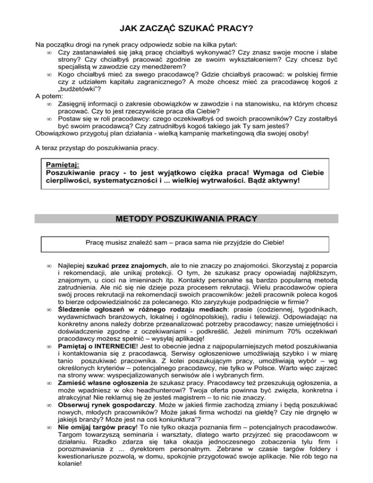 JAK ZACZĄĆ SZUKAĆ PRACY? Na początku drogi na rynek pracy odpowiedz sobie na kilka pytań: • Czy zastanawiałeś się jaką pracę chciałbyś wykonywać? Czy znasz swoje mocne i słabe strony? Czy chciałbyś pracować zgodnie ze swoim wykształceniem? Czy chcesz być specjalistą w zawodzie czy menedżerem? • Kogo chciałbyś mieć za swego pracodawcę? Gdzie chciałbyś pracować: w polskiej firmie czy z udziałem kapitału zagranicznego? A może chcesz mieć za pracodawcę kogoś z „budżetówki”? A potem: • Zasięgnij informacji o zakresie obowiązków w zawodzie i na stanowisku, na którym chcesz pracować. Czy to jest rzeczywiście praca dla Ciebie? • Postaw się w roli pracodawcy: czego oczekiwałbyś od swoich pracowników? Czy zostałbyś być swoim pracodawcą? Czy zatrudniłbyś kogoś takiego jak Ty sam jesteś? Obowiązkowo przygotuj plan działania - wielką kampanię marketingową dla swojej osoby! A teraz przystąp do poszukiwania pracy. Pamiętaj: Poszukiwanie pracy - to jest wyjątkowo ciężka praca! Wymaga od Ciebie cierpliwości, systematyczności i ... wielkiej wytrwałości. Bądź aktywny! METODY POSZUKIWANIA PRACY Pracę musisz znaleźć sam – praca sama nie przyjdzie do Ciebie! • • • • • • Najlepiej szukać przez znajomych, ale to nie znaczy po znajomości. Skorzystaj z poparcia i rekomendacji, ale unikaj protekcji. O tym, że szukasz pracy opowiadaj najbliższym, znajomym, u cioci na imieninach itp. Kontakty personalne są bardzo popularną metodą zatrudnienia. Ale nić się nie dzieje poza procesem rekrutacji. Wielu pracodawców opiera swój proces rekrutacji na rekomendacji swoich pracowników: jeżeli pracownik poleca kogoś to bierze odpowiedzialność za polecanego. Kto zaryzykuje podpadnięcie w firmie? Śledzenie ogłoszeń w różnego rodzaju mediach: prasie (codziennej, tygodnikach, wydawnictwach branżowych, lokalnej i ogólnopolskiej), radiu i telewizji. Odpowiadając na konkretny anons należy dobrze przeanalizować potrzeby pracodawcy; nasze umiejętności i doświadczenie zgodne z oczekiwaniami - podkreślić. Jeżeli minimum 70% oczekiwań pracodawcy możesz spełnić – wysyłaj aplikację! Pamiętaj o INTERNECIE! Jest to obecnie jedna z najpopularniejszych metod poszukiwania i kontaktowania się z pracodawcą. Serwisy ogłoszeniowe umożliwiają szybko i w miarę tanio poszukiwać pracownika. Z kolei poszukującym pracy, umożliwiają wybór – wg określonych kryteriów – potencjalnego pracodawcy, nie tylko w Polsce. Warto więc zajrzeć na strony www: wyspecjalizowanych serwisów ale i wybranych firm. Zamieść własne ogłoszenia że szukasz pracy. Pracodawcy też przeszukują ogłoszenia, a może wpadniesz w oko headhunterowi? Twoja oferta powinna być zwięzła, konkretna i atrakcyjna! Nie reklamuj się że jesteś magistrem – to nic nie znaczy. Obserwuj rynek gospodarczy. Może w jakieś firmie zachodzą zmiany i będą poszukiwać nowych, młodych pracowników? Może jakaś firma wchodzi na giełdę? Czy nie drgnęło w jakiejś branży? Może jest na coś koniunktura”? Nie omijaj targów pracy! To nie tylko okazja poznania firm – potencjalnych pracodawców. Targom towarzyszą seminaria i warsztaty, dlatego warto przyjrzeć się pracodawcom w działaniu. Rzadko zdarza się taka okazja jednoczesnego zobaczenia tylu firm i porozmawiania z ... dyrektorem personalnym. Zebrane w czasie targów foldery i kwestionariusze pozwolą, w domu, spokojnie przygotować swoje aplikacje. Nie rób tego na kolanie! • • • • • • • Uczestnicz w prezentacjach firm na Uniwersytecie! Jest to kolejna okazja spotkania z pracodawcą i określoną dziedziną gospodarki. Może będzie okazja do zweryfikowania swoich wyobrażeń o branży czy stanowisku? Ale przede wszystkim jest to okazja zobaczyć przedstawicieli firm jako rekruterów. Odwiedzaj Biuro Zawodowej Promocji Absolwentów, zwane w skrócie Biurem Karier. Na miejscu można – za darmo - otrzymać kilka rad i wziąć udział w cyklicznych warsztatach. Odwiedź Rejonowy Urząd Pracy. W Warszawie poza powiatowym rzędem pracy, gdzie rejestrują się bezrobotni, można odwiedzić również Centrum Informacji i Planowania Kariery oraz sklepik internetowy w Wojewódzkim Urzędzie Pracy. Spróbuj w Agencji Doradztwa Personalnego lub Agencji Pośrednictwa Pracy. Pierwsze nastawione są poza szkoleniami na świadczenie usług w zakresie procesów rekrutacyjnych. Składając swoje CV masz szansę na znalezienie się w ich bazie danych a więc większą szansę na znalezienie pracodawcy. Pamiętaj jednak, że agencje nastawione są na szkolenia i poszukiwanie pracowników na tzw. menedżerskie stanowiska. Składaj wizyty i CV wraz z listem intencyjnym w firmach, które mogą być w obszarze Twoich zainteresowań zawodowych. Warto być „pod ręką” w dziale rekrutacji. Lokalne organizacje społeczne, organizacje wyznaniowe: stowarzyszenia, towarzystwa, izby gospodarcze, organizacje młodzieżowe, związki zawodowe. A może spróbujesz na „swoim”? Załóż firmę i zatrudnij siebie! Zostań swoim pracodawcą. Pamiętaj: Wcześnie zaczynaj przygotowania do przyszłej pracy. Jeżeli nawet nie musisz pracować dla pieniędzy, to jednak zdobywaj doświadczenie: na praktykach, stażach, również zagranicznych. Podejmuj prace jako wolontariusz. Doświadczenie, szczególnie za granicą, jest obecnie wyjątkowo w cenie!