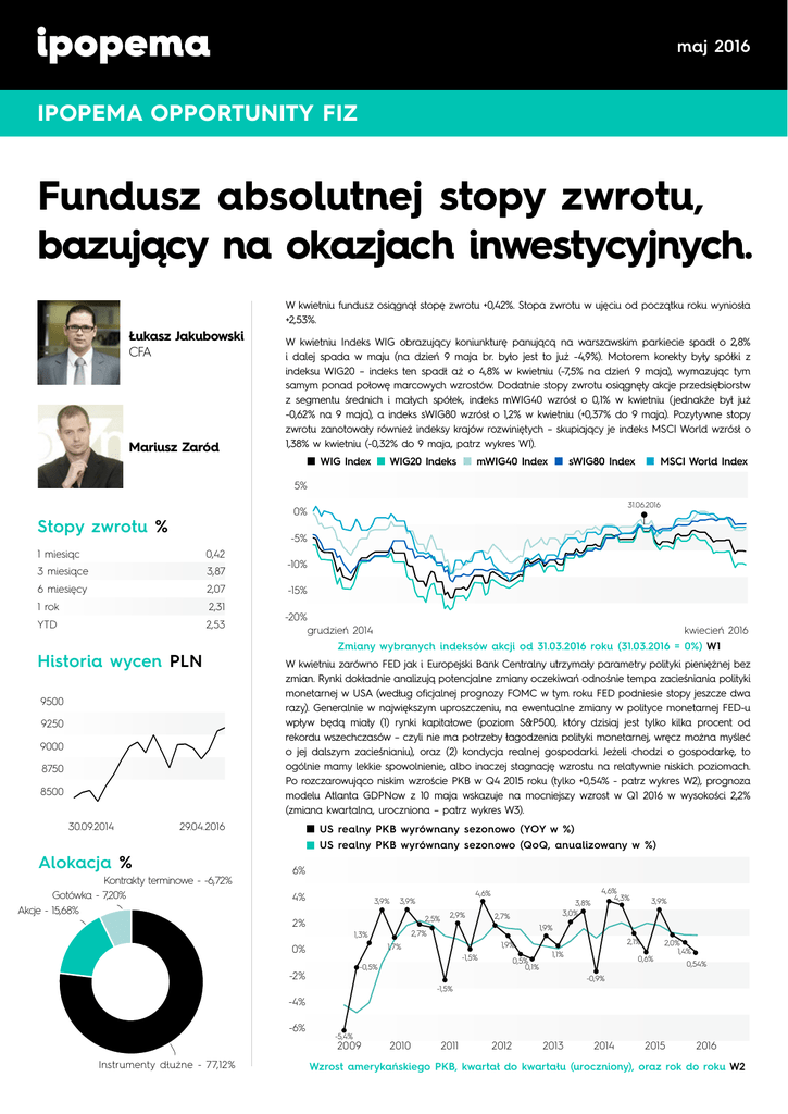 maj 2016 IPOPEMA OPPORTUNITY FIZ Fundusz absolutnej stopy zwrotu, bazujący na okazjach inwestycyjnych. W kwietniu fundusz osiągnął stopę zwrotu +0,42%. Stopa zwrotu w ujęciu od początku roku wyniosła +2,53%. Łukasz Jakubowski CFA Mariusz Zaród W kwietniu Indeks WIG obrazujący koniunkturę panującą na warszawskim parkiecie spadł o 2,8% i dalej spada w maju (na dzień 9 maja br. było jest to już -4,9%). Motorem korekty były spółki z indeksu WIG20 – indeks ten spadł aż o 4,8% w kwietniu (-7,5% na dzień 9 maja), wymazując tym samym ponad połowę marcowych wzrostów. Dodatnie stopy zwrotu osiągnęły akcje przedsiębiorstw z segmentu średnich i małych spółek, indeks mWIG40 wzrósł o 0,1% w kwietniu (jednakże był już -0,62% na 9 maja), a indeks sWIG80 wzrósł o 1,2% w kwietniu (+0,37% do 9 maja). Pozytywne stopy zwrotu zanotowały również indeksy krajów rozwiniętych – skupiający je indeks MSCI World wzrósł o 1,38% w kwietniu (-0,32% do 9 maja, patrz wykres W1). WIG Index WIG20 Indeks sWIG80 Index mWIG40 Index MSCI World Index 5% Stopy zwrotu % -5% 1 miesiąc 0,42 3 miesiące 3,87 6 miesięcy 2,07 1 rok 2,31 YTD 2,53 -10% -15% -20% grudzień 2014 kwiecień 2016 Zmiany wybranych indeksów akcji od 31.03.2016 roku (31.03.2016 = 0%) W1 Historia wycen PLN 9500 0059 9250 0529 9000 0009 8750 0578 8500 0058 30.09.2014 31.06.2016 0% W kwietniu zarówno FED jak i Europejski Bank Centralny utrzymały parametry polityki pieniężnej bez zmian. Rynki dokładnie analizują potencjalne zmiany oczekiwań odnośnie tempa zacieśniania polityki monetarnej w USA (według oficjalnej prognozy FOMC w tym roku FED podniesie stopy jeszcze dwa razy). Generalnie w największym uproszczeniu, na ewentualne zmiany w polityce monetarnej FED-u wpływ będą miały (1) rynki kapitałowe (poziom S&P500, który dzisiaj jest tylko kilka procent od rekordu wszechczasów – czyli nie ma potrzeby łagodzenia polityki monetarnej, wręcz można myśleć o jej dalszym zacieśnianiu), oraz (2) kondycja realnej gospodarki. Jeżeli chodzi o gospodarkę, to ogólnie mamy lekkie spowolnienie, albo inaczej stagnację wzrostu na relatywnie niskich poziomach. Po rozczarowująco niskim wzroście PKB w Q4 2015 roku (tylko +0,54% - patrz wykres W2), prognoza modelu Atlanta GDPNow z 10 maja wskazuje na mocniejszy wzrost w Q1 2016 w wysokości 2,2% (zmiana kwartalna, uroczniona – patrz wykres W3). 29.04.2016 US realny PKB wyrównany sezonowo (YOY w %) US realny PKB wyrównany sezonowo (QoQ, anualizowany w %) opportunity fiz alokacja Alokacja % Kontrakty terminowe - -6,72% Gotówka - 7,20% Akcje - 15,68% 6% 4% 3,9% 4,6% 3,9% 2,5% 2% 2,9% 4,6% 4,3% 3,9% 1,9% 1,9% 1,7% -1,5% -0,5% -2% 2,7% 2,7% 1,3% 0% 3,8% 3,0% 0,5% 0,1% 2,1% 1,1% 0,6% 2,0% 1,4% 0,54% -0,9% -1,5% -4% -6% -5,4% 2009 Instrumenty dłużne - 77,12% global bonds fiz alokacja 2010 2011 2012 2013 2014 2015 2016 Wzrost amerykańskiego PKB, kwartał do kwartału (uroczniony), oraz rok do roku W2 maj 2016 IPOPEMA OPPORTUNITY FIZ Waluty % Kolejnym ryzykiem dla rynków jest referendum (23 czerwca br.) odnośnie pozostania Wielkiej Brytanii w Unii Europejskiej. Aktualne sondaże wskazują, że można spodziewać się każdego rozstrzygnięcia. Średnia z sondaży wg agencji Bloomberg na koniec kwietnia wskazywała na to, że 41% Brytyjczyków jest za pozostaniem w UE, 41% jest za opuszczeniem, a aż 19% jest wciąż niezdecydowanych (patrz wykres W4). opportunity fiz waluty EUR - 5,89% USD - 28,03% Pierwszy szacunek PKB (Advance Estimate From BEA) GDP Nowcast (Q2 2016) 4,0 3,5 3,0 Q2 2014 Q4 2014 2,5 PLN - 66,08% Q4 2015 Q3 2014 Q1 2016 2,16 Q1 2015 2,0 1,5 1,67 1,0 Sektory % Informatyka 11,54 Finanse – Inne 10,39 Rynek kapitałowy 10,30 Handel detaliczny 8,96 Przemysł elektromaszynowy 7,68 Inne Usługi 7,31 Deweloperzy 7,20 Ubezpieczenia 7,11 Banki 7,10 Przemysł metalowy 6,65 Pozostałe 15,76 Q2 2015 0,5 Q3 2015 0,0 kwiecień 2014 kwiecień 2016 Prognoza wzrostu amerykańskiego PKB według modelu Atlanta FED W3 60 Za pozostaniem w UE w % Za opuszczeniem UE w % Niezdecydowani w % 50 40 30 20 Struktura geograficzna % 10 Polska 90,01 0 Niemcy 6,03 Francja 3,96 wrzesień 2015 kwiecień 2016 Sondażowe wyniki referendum w Wielkiej Brytanii w dnia 23 czerwca 2016 roku W4 W Polsce spodziewamy się kolejnej ofensywy legislacyjnej rządu oraz bacznie przyglądamy się realizacji wpływów budżetowych. Pierwsze informacje odnośnie wpływów z podatku bankowego pokazują wpływy poniżej oczekiwań, co może budzić ryzyko podniesienia stawki podatku. Zmian też można się spodziewać m.in. w sektorze: energetycznym, handlowym oraz mediowym. Z sektorowego punktu widzenia od końca marca br., najlepiej zachowywały się w kwietniu akcje z sektora deweloperskiego, spożywczego i surowcowego (WIG Deweloperzy +3,9% (+2,0% do 9 maja), WIG Spożywczy +3,2% w kwietniu (+1,1% na 9 maja) oraz WIG Surowcowy +1,3% w kwietniu (-7,2% na 9 maja). Najsłabiej zachowywały się spółki z sektora bankowego -7,9% w kwietniu (i -8,9% na 9 maja), telekomunikacyjnego -5,4% w kwietniu (i -9,72% na 9 maja) oraz paliwowego -5,1%. Na koniec kwietnia zaangażowanie w akcje (uwzględniając instrumenty pochodne) wyniosło ok. 9%. Niniejszy dokument służy wyłącznie celom informacyjnym, nie stanowi rekomendacji czy doradztwa inwestycyjnego i nie może stanowić podstawy do podjęcia decyzji inwestycyjnej. Wszelkie informacje dotyczące planów, oczekiwań, strategii, czy polityki inwestycyjnej co do przyszłości, stanowią odzwierciedlenie wiedzy i oczekiwań zarządzającego na moment sporządzenia niniejszego dokumentu, w związku z czym mogą one ulec wielokrotnej zmianie w zależności od rozwoju sytuacji na rynkach finansowych. W skrajnym przypadku może to oznaczać, że oczekiwania te mogą ulec zmianie, także zanim niniejszy dokument dotrze do jego adresata. IPOPEMA Towarzystwo Funduszy Inwestycyjnych S.A., ul. Próżna 9, 00-107 Warszawa, Sąd Rejonowy dla m. st.