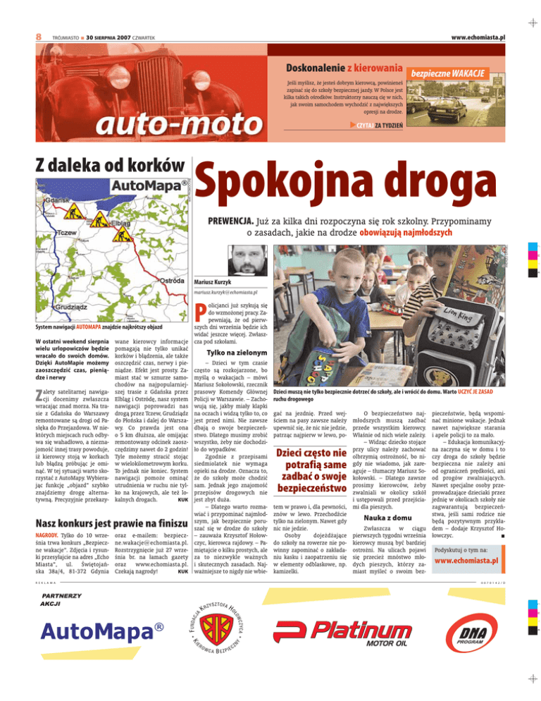 8 TRÓJMIASTO www.echomiasta.pl 30 SIERPNIA 2007 CZWARTEK Doskonalenie z kierowania bezpieczne WAKACJE Jeśli myślisz, że jesteś dobrym kierowcą, powinieneś zapisać się do szkoły bezpiecznej jazdy. W Polsce jest kilka takich ośrodków. Instruktorzy nauczą cię w nich, jak swoim samochodem wychodzić z największych opresji na drodze. CZYTAJ ZA TYDZIEŃ MAT. PROMOCYJNE Z daleka od korków Spokojna droga C M Y ANDRZEJ GRYGIEL PREWENCJA. Już za kilka dni rozpoczyna się rok szkolny. Przypominamy o zasadach, jakie na drodze obowiązują najmłodszych K Mariusz Kurzyk [email protected] P olicjanci już szykują się do wzmożonej pracy. Zapewniają, że od pierwSystem nawigacji AUTOMAPA znajdzie najkrótszy objazd szych dni września będzie ich widać jeszcze więcej. ZwłaszW ostatni weekend sierpnia wane kierowcy informacje cza pod szkołami. wielu urlopowiczów będzie pomagają nie tylko unikać Tylko na zielonym wracało do swoich domów. korków i błądzenia, ale także Dzięki AutoMapie możemy oszczędzić czas, nerwy i pie– Dzieci w tym czasie zaoszczędzić czas, pienią- niądze. Efekt jest prosty. Za- często są rozkojarzone, bo dze i nerwy miast stać w sznurze samo- myślą o wakacjach – mówi chodów na najpopularniej- Mariusz Sokołowski, rzecznik alety satelitarnej nawiga- szej trasie z Gdańska przez prasowy Komendy Głównej cji docenimy zwłaszcza Elbląg i Ostródę, nasz system Policji w Warszawie. – Zachowracając znad morza. Na tra- nawigacji poprowadzi nas wują się, jakby miały klapki sie z Gdańska do Warszawy drogą przez Tczew, Grudziądz na oczach i widzą tylko to, co remontowane są drogi od Pa- do Płońska i dalej do Warsza- jest przed nimi. Nie zawsze słęka do Przejazdowa. W nie- wy. Co prawda jest ona dbają o swoje bezpieczeńktórych miejscach ruch odby- o 5 km dłuższa, ale omijając stwo. Dlatego musimy zrobić wa się wahadłowo, a niezna- remontowany odcinek zaosz- wszystko, żeby nie dochodzijomość innej trasy powoduje, czędzimy nawet do 2 godzin! ło do wypadków. iż kierowcy stoją w korkach Tyle możemy stracić stojąc Zgodnie z przepisami lub błądzą próbując je omi- w wielokilometrowym korku. siedmiolatek nie wymaga nąć. W tej sytuacji warto sko- To jednak nie koniec. System opieki na drodze. Oznacza to, rzystać z AutoMapy. Wybiera- nawigacji pomoże ominąć że do szkoły może chodzić jąc funkcję „objazd” szybko utrudnienia w ruchu nie tyl- sam. Jednak jego znajomość znajdziemy drogę alterna- ko na krajowych, ale też lo- przepisów drogowych nie KUK jest zbyt duża. tywną. Precyzyjnie przekazy- kalnych drogach. – Dlatego warto rozmawiać i przypominać najmłodszym, jak bezpiecznie poruszać się w drodze do szkoły NAGRODY. Tylko do 10 wrze- oraz e-mailem: bezpiecz- – zauważa Krzysztof Hołowśnia trwa konkurs „Bezpiecz- [email protected]. czyc, kierowca rajdowy. – Pane wakacje”. Zdjęcia i rysun- Rozstrzygnięcie już 27 wrze- miętajcie o kilku prostych, ale ki przesyłajcie na adres „Echo śnia br. na łamach gazety za to niezwykle ważnych Miasta”, ul. Świętojań- oraz www.echomiasta.pl. i skutecznych zasadach. NajKUK ważniejsze to nigdy nie wbieska 38a/4, 81-372 Gdynia Czekają nagrody! Z Nasz konkurs jest prawie na finiszu R E K L A M A Dzieci muszą nie tylko bezpiecznie dotrzeć do szkoły, ale i wrócić do domu. Warto UCZYĆ JE ZASAD ruchu drogowego gać na jezdnię. Przed wejO bezpieczeństwo najściem na pasy zawsze należy młodszych muszą zadbać upewnić się, że nic nie jedzie, przede wszystkim kierowcy. patrząc najpierw w lewo, po- Właśnie od nich wiele zależy. – Widząc dziecko stojące przy ulicy należy zachować olbrzymią ostrożność, bo nigdy nie wiadomo, jak zareaguje – tłumaczy Mariusz Sokołowski. – Dlatego zawsze prosimy kierowców, żeby zwalniali w okolicy szkół i ustępowali przed przejściatem w prawo i, dla pewności, mi dla pieszych. znów w lewo. Przechodźcie Nauka z domu tylko na zielonym. Nawet gdy Zwłaszcza w ciągu nic nie jedzie. Osoby dojeżdżające pierwszych tygodni września do szkoły na rowerze nie po- kierowcy muszą być bardziej winny zapominać o zakłada- ostrożni. Na ulicach pojawi niu kasku i zaopatrzeniu się się przecież mnóstwo młow elementy odblaskowe, np. dych pieszych, którzy zamiast myśleć o swoim bezkamizelki. Dzieci często nie potrafią same zadbać o swoje bezpieczeństwo pieczeństwie, będą wspominać minione wakacje. Jednak nawet największe starania i apele policji to za mało. – Edukacja komunikacyjna zaczyna się w domu i to czy droga do szkoły będzie bezpieczna nie zależy ani od ograniczeń prędkości, ani od progów zwalniających. Nawet specjalne osoby przeprowadzające dzieciaki przez jednię w okolicach szkoły nie zagwarantują bezpieczeństwa, jeśli sami rodzice nie będą pozytywnym przykładem – dodaje Krzysztof Hołowczyc. Podyskutuj o tym na: www.echomiasta.pl 0 0 7 0 1 4 2 / D C M Y K