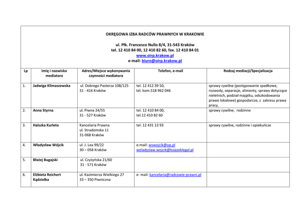 OKRĘGOWA IZBA RADCÓW PRAWNYCH W KRAKOWIE ul. Płk. Francesco Nullo 8/4, 31-543 Kraków tel. 12 410 84 00, 12 410 82 60, fax. 12 410 84 01 www.oirp.krakow.pl e-mail: [email protected] Lp Imię i nazwisko mediatora Adres/Miejsce wykonywania czynności mediatora Telefon, e-mail 1. Jadwiga Klimaszewska ul. Dobrego Pasterza 108/125 31 - 416 Kraków tel. 12 412 39 50, tel. kom.518 962 046 2. Anna Styrna ul. Piwna 24/55 31 - 527 Kraków tel. 12 410 84 00, tel.12 410 82 60 3. Halszka Kurleto Kancelaria Prawna ul. Stradomska 11 31-068 Kraków tel. 12 431 13 93 4. Władysław Wójcik ul. J. Lea 99/22 30 – 058 Kraków e-mail: [email protected] [email protected] 5. Błażej Bugajski ul. Czyżyńska 21/60 31 - 571 Kraków 6. Elżbieta Reichert Kądziołka ul. Kazimierza Wielkiego 27 33 – 350 Piwniczna e- mail: [email protected] Rodzaj mediacji/Specjalizacja sprawy cywilne (postępowanie spadkowe, rozwody, separacje, alimenty, sprawy dotyczące nieletnich, podział majątku, odszkodowania prawo lokalowe) gospodarcze, z zakresu prawa pracy, sprawy cywilne, rodzinne sprawy cywilne, rodzinne i opiekuńcze 7. Waldemar Ziętek Al. Wolności 19 33 – 300 Nowy Sącz e-mail: [email protected] 8. Otto Jachimowicz ul. Jana III Sobieskiego 7/5 31 - 136 Kraków e-mail: [email protected] 9. Małgorzata Makoś Treśka ul. Moniuszki 15/49 31 – 523 Kraków e-mail: [email protected] 10. Agnieszka ZawodnyZbroja ul. Słoneczna 3 32 -080 Zabierzów e-mail: [email protected] 11. Violetta Loos ul. T. Kościuszki 75/32 30 – 114 Kraków e-mail: [email protected] sprawy cywilne, rodzinne, gospodarcze 12. Joanna Bąk ul. Garczyńskiego 17/2 31-524 Kraków e-mail: [email protected] 13. Katarzyna Bąbaś ul. Blich 3/8 31-502 Kraków e-mail: [email protected] sprawy cywilne, rodzinne i opiekuńcze, gospodarcze, z zakresu prawa pracy oraz prawa autorskiego sprawy cywilne, rodzinne, gospodarcze oraz z zakresu prawa pracy, 14. Seweryn Głębowski ul. Kościuszki 1/34 33-380 Krynica Zdrój e-mail: [email protected] sprawy cywilne, gospodarcze oraz z zakresu prawa pracy 15. Katarzyna Mazur ul. B.Wallek- Walewskiego 17 B 30-094 Kraków e-mail: [email protected] sprawy cywilne, administracyjne w pełnym zakresie 16. Anna Bereżyńska-Karp e-mail: [email protected] sprawy cywilne, gospodarcze 17. Agnieszka Kiełbasa Kancelaria Radcy Prawnego ul. Berka Joselewicza 21 A 31-031 Kraków ul. Piłsudskiego 60 34-600 Limanowa e-mail: [email protected] sprawy rodzinne, gospodarcze oraz z zakresu prawa pracy 18. Ewa Anioł ul. Cegielniana 39 32-085 Modlnica e-mail: [email protected] sprawy cywilne, gospodarcze, z zakresu prawa pracy oraz zamówień publicznych 19. Piotr Jabłonka ul. Dietla 99/4A 31-031 Kraków e-mail: [email protected] sprawy cywilne, gospodarcze 20. Marzena Dyduch ul. Mogilska 16/8 31-516 Kraków e-mail: [email protected] 21. Urszula Layer ul. Lublańska 34/21 31-476 Kraków tel. 602 862 462, fax: 12 412 19 45 e-mail: [email protected] sprawy cywilne, gospodarcze, rodzinne, z zakresu prawa handlowego, prawa pracy, prawa ubezpieczeniowego, prawa budowlanego oraz prawa konsumenckiego, prawa autorskiego i innych pokrewnych sprawy cywilne, rodzinne i opiekuńcze, gospodarcze oraz z zakresu prawa pracy 22. Roman Lubieniecki ul. Armii Krajowej 93/63 30-150 Kraków e-mail: [email protected] sprawy cywilne, gospodarcze oraz z zakresu prawa handlowego i prawa pracy 23. Klaudiusz Głód Al. Wolności 19 33 – 300 Nowy Sącz e-mail: [email protected] sprawy cywilne, gospodarcze, oraz z zakresu prawa handlowego 24. Agnieszka Mirska ul. Dworcowa 3/61 30-559 Kraków e-mail: [email protected] sprawy cywilne, gospodarcze oraz z zakresu prawa pracy 25. Michał Olszyński ul. Brodowicza 2/2 31-518 Kraków e-mail: [email protected] sprawy rodzinne oraz z zakresu prawa pracy 26. Kamil Kosior ul. Pod Fortem 2c/57 31-302 Kraków e-mail: [email protected] sprawy cywilne, gospodarcze oraz z zakresu prawa pracy 27. Matylda Burczyńska ul. Bociana 22 e-mail: [email protected] sprawy cywilne, gospodarcze oraz z zakresu -Radym 31-231 Kraków prawa pracy 28. Anna KozłowskaWentlandt ul. Spokojna 3 32-087 Zielonki e-mail: [email protected] sprawy cywilne, gospodarcze oraz z zakresu prawa pracy 29. Anna Rybakiezy-Ralska ul. P. Ściegiennego 69/128 30-809 Kraków e-mail: [email protected] 30. Agnieszka Zielińska ul. Łepkowskiego 9/72A 31-423 Kraków e-mail: [email protected] 31. Wojciech Gliściński Rynek 11/12 34 – 400 Nowy Targ e-mail: [email protected] sprawy cywilne, gospodarcze, z zakresu prawa pracy oraz prawa spółek handlowych sprawy cywilne, gospodarcze, z zakresu prawa autorskiego oraz ochrony własności intelektualnej sprawy cywilne, gospodarcze oraz z zakresu prawa pracy 32. Joanna Helfer ul. Kamieniarska 31/11 30-364 Kraków e-mail: [email protected] sprawy cywilne, gospodarcze, rodzinne 33. Marzena Migas ul. Kokoszków Boczna 69 34-400 Nowy Targ e-mail: [email protected] sprawy cywilne, gospodarcze, rodzinne oraz z zakresu prawa handlowego oraz prawa pracy 34. Agnieszka Zaborowska ul. Rakowicka 10b/8 31-511 Kraków e-mail: [email protected] 35. Tamara Laprus-Bałuka ul. Rakowicka 10b/8 31-511 Kraków e-mail: [email protected] sprawy cywilne, gospodarcze, z zakresu prawa rodzinnego i opiekuńczego oraz zakresu prawa pracy sprawy cywilne, gospodarcze, z zakresu prawa rodzinnego i opiekuńczego oraz prawa pracy 36. Monika Florczak-Wątor ul. Na Ustroniu 3/10a 30-311 Kraków e-mail: [email protected] sprawy cywilne, gospodarcze, rodzinne oraz z zakresu prawa pracy 37. Mariusz Baran Sąspów 319 32-048 Jerzmanowice e-mail: [email protected] sprawy cywilne, rodzinne 38. Magdalena Śpiewak Fidan Rynek Dębnicki 6/3 30-319 Kraków e-mail: [email protected] sprawy gospodarcze, z zakresu prawa pracy i ubezpieczeń społecznych, prawa rodzinnego i opiekuńczego sprawy cywilne, gospodarcze, z zakresu prawa pracy i ubezpieczeń społecznych oraz prawa rodzinnego i opiekuńczego sprawy cywilne, gospodarcze oraz z zakresu prawa pracy i ubezp
