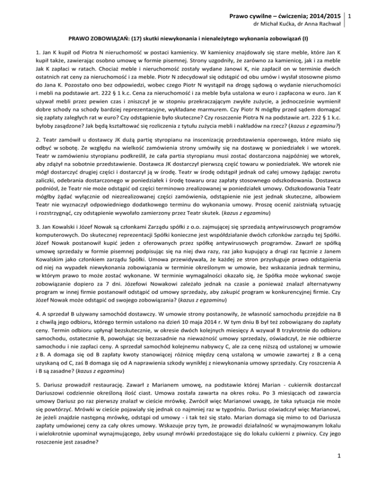 Prawo cywilne – ćwiczenia; 2014/2015 1 dr Michał Kućka, dr Anna Rachwał PRAWO ZOBOWIĄZAŃ: (17) skutki niewykonania i nienależytego wykonania zobowiązań (I) 1. Jan K kupił od Piotra N nieruchomość w postaci kamienicy. W kamienicy znajdowały się stare meble, które Jan K kupił także, zawierając osobno umowę w formie pisemnej. Strony uzgodniły, że zarówno za kamienicę, jak i za meble Jak K zapłaci w ratach. Chociaż meble i nieruchomość zostały wydane Janowi K, nie zapłacił on w terminie dwóch ostatnich rat ceny za nieruchomość i za meble. Piotr N zdecydował się odstąpić od obu umów i wysłał stosowne pismo do Jana K. Pozostało ono bez odpowiedzi, wobec czego Piotr N wystąpił na drogę sądową o wydanie nieruchomości i mebli na podstawie art. 222 § 1 k.c. Cena za nieruchomość i za meble była ustalona w euro i zapłacona w euro. Jan K używał mebli przez pewien czas i zniszczył je w stopniu przekraczającym zwykłe zużycie, a jednocześnie wymienił dobre schody na schody bardziej reprezentacyjne, wykładane marmurem. Czy Piotr N mógłby przed sądem domagać się zapłaty zaległych rat w euro? Czy odstąpienie było skuteczne? Czy roszczenie Piotra N na podstawie art. 222 § 1 k.c. byłoby zasądzone? Jak będą kształtować się rozliczenia z tytułu zużycia mebli i nakładów na rzecz? (kazus z egzaminu?) 2. Teatr zamówił u dostawcy JK dużą partię styropianu na inscenizację przedstawienia operowego, które miało się odbyć w sobotę. Ze względu na wielkość zamówienia strony umówiły się na dostawę w poniedziałek i we wtorek. Teatr w zamówieniu styropianu podkreślił, że cała partia styropianu musi zostać dostarczona najpóźniej we wtorek, aby zdążył na sobotnie przedstawienie. Dostawca JK dostarczył pierwszą część towaru w poniedziałek. We wtorek nie mógł dostarczyć drugiej części i dostarczył ją w środę. Teatr w środę odstąpił jednak od całej umowy żądając zwrotu zaliczki, odebrania dostarczonego w poniedziałek i środę towaru oraz zapłaty stosownego odszkodowania. Dostawca podniósł, że Teatr nie może odstąpić od części terminowo zrealizowanej w poniedziałek umowy. Odszkodowania Teatr mógłby żądać wyłącznie od niezrealizowanej części zamówienia, odstąpienie nie jest jednak skuteczne, albowiem Teatr nie wyznaczył odpowiedniego dodatkowego terminu do wykonania umowy. Proszę ocenić zaistniałą sytuację i rozstrzygnąć, czy odstąpienie wywołało zamierzony przez Teatr skutek. (kazus z egzaminu) 3. Jan Kowalski i Józef Nowak są członkami Zarządu spółki z o.o. zajmującej się sprzedażą antywirusowych programów komputerowych. Do skutecznej reprezentacji Spółki konieczne jest współdziałanie dwóch członków zarządu tej Spółki. Józef Nowak postanowił kupić jeden z oferowanych przez spółkę antywirusowych programów. Zawarł ze spółką umowę sprzedaży w formie pisemnej podpisując się na niej dwa razy, raz jako kupujący a drugi raz łącznie z Janem Kowalskim jako członkiem zarządu Spółki. Umowa przewidywała, że każdej ze stron przysługuje prawo odstąpienia od niej na wypadek niewykonania zobowiązania w terminie określonym w umowie, bez wskazania jednak terminu, w którym prawo to może zostać wykonane. W terminie wymagalności okazało się, że Spółka może wykonać swoje zobowiązanie dopiero za 7 dni. Józefowi Nowakowi zależało jednak na czasie a ponieważ znalazł alternatywny program w innej firmie postanowił odstąpić od umowy sprzedaży, aby zakupić program w konkurencyjnej firmie. Czy Józef Nowak może odstąpić od swojego zobowiązania? (kazus z egzaminu) 4. A sprzedał B używany samochód dostawczy. W umowie strony postanowiły, że własność samochodu przejdzie na B z chwilą jego odbioru, którego termin ustalono na dzień 10 maja 2014 r. W tym dniu B był też zobowiązany do zapłaty ceny. Termin odbioru upłynął bezskutecznie, w okresie dwóch kolejnych miesięcy A wzywał B trzykrotnie do odbioru samochodu, ostatecznie B, powołując się bezzasadnie na nieważność umowy sprzedaży, oświadczył, że nie odbierze samochodu i nie zapłaci ceny. A sprzedał samochód kolejnemu nabywcy C, ale za cenę niższą od ustalonej w umowie z B. A domaga się od B zapłaty kwoty stanowiącej różnicę między ceną ustaloną w umowie zawartej z B a ceną uzyskaną od C, zaś B domaga się od A naprawienia szkody wynikłej z niewykonania umowy sprzedaży. Czy roszczenia A i B są zasadne? (kazus z egzaminu) 5. Dariusz prowadził restaurację. Zawarł z Marianem umowę, na podstawie której Marian - cukiernik dostarczał Dariuszowi codziennie określoną ilość ciast. Umowa została zawarta na okres roku. Po 3 miesiącach od zawarcia umowy Dariusz po raz pierwszy znalazł w cieście mrówkę. Zwrócił więc Marianowi uwagę, że taka sytuacja nie może się powtórzyć. Mrówki w cieście pojawiały się jednak co najmniej raz w tygodniu. Dariusz oświadczył więc Marianowi, że jeżeli znajdzie następną mrówkę, odstąpi od umowy - i tak też się stało. Marian domaga się mimo to od Dariusza zapłaty umówionej ceny za cały okres umowy. Wskazuje przy tym, że prowadzi działalność w wynajmowanym lokalu i wielokrotnie upominał wynajmującego, żeby usunął mrówki przedostające się do lokalu cukierni z piwnicy. Czy jego roszczenie jest zasadne? 1