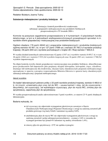 Sporządził: G. Pencuła Data sporządzenia: 2005-02-10 Osoba odpowiedzialna: Data upublicznienia: 2005-02-10 Redaktor Biuletynu Joanna Tudruj Substancje niebezpieczne i produkty biobójcze 45 Informacja z kontroli prawidłowości oznakowania substancji i preparatów niebezpiecznych oraz produktów biobójczych przeprowadzonych w IV kwartale 2004 r. Kontrole na powyższe zagadnienie przeprowadzono w 4 hurtowniach i 5 placówkach handlu detalicznego, w tym w 4 jednostkach wielkopowierzchniowych prowadzących sprzedaż m.in. wyrobów chemii gospodarczej i motoryzacyjnej oraz produktów biobójczych. Ogółem zbadano 176 partii (8042 szt.) preparatów niebezpiecznych i produktów biobójczych ogólnej wartości 43 561,1zł, w tym 127 partii (7098 szt.) wartości 35 760,3 zł wyrobów produkcji krajowej i 49 partii (944 szt.) wyrobów pochodzących z krajów UE i Rosji wartości 7 800,8 zł. W wyniku działań kontrolnych zakwestionowano 42 partie (1347 szt.) wyrobów wartości 8 693,7 zł, w tym 26 partii (1044 szt.) wartości 5 933,2zł wyrobów krajowych oraz 16 partii (303 szt.) wartości 2 760,5zł wyrobów importowanych. Na objęte kontrolą wyroby chemii gospodarczej i motoryzacyjnej oraz produkty biobójcze, sklasyfikowane przez producentów lub importerów jako preparaty skrajnie łatwopalne, łatwopalne, żrące, szkodliwe, drażniące lub niebezpieczne dla środowiska, okazano karty charakterystyki preparatu niebezpiecznego sporządzone w oparciu o przepisy rozporządzenia Ministra Zdrowia w sprawie karty charakterystyki substancji niebezpiecznej i preparatu niebezpiecznego. Jakość wyrobów Do badań laboratoryjnych pobrano próby z 22 partii wyrobów produkcji krajowej, wartości 6 466,9 zł tj. mi.innymi: uniwersalny płyn oraz żel do WC – usuwa kamień i rdzę, żel do czyszczenia i dezynfekcji, żel czyszczący, żel wybielająco–czyszczący, płyn do mycia WC, zimowy płyn do spryskiwaczy, zapachowy płyn do spryskiwaczy. W wyniku przeprowadzonych analiz zakwestionowano 5 partii wyrobów, co stanowi 23 % partii zbadanych laboratoryjnie. Badania wykazały, że: ♦ żel czyszczący nie odpowiada wymaganiom jakościowym zawartym w Karcie Charakterystyki Niebezpiecznego Preparatu Chemicznego z uwagi na zaniżoną zawartość pH produktu gotowego (wg karty 0,6±0,1 natomiast wg analizy 0,05), ♦ antybakteryjny płyn do mycia WC nie odpowiada wymaganiom jakościowym z uwagi na zaniżoną zawartość suchej substancji powierzchniowo - czynnej o 2,6% w stosunku do wymagań (powinno być ponad 4% natomiast wg analizy stwierdzono 1,4%), ♦ zimowy płyn do spryskiwaczy -21ºC nie spełnia wymogów: 1/6 Dokument pobrany ze strony ihlublin.netbip.pl dn. 2016-12-09 17:23 ♦ deklaracji na opakowaniu z powodu zbyt wysokiej temperatury krzepnięcia (wg deklaracji temperatura krzepnięcia powinna wynosić -21ºC, natomiast wg analizy stwierdzono -8şC ) oraz z powodu pozostawiania zacieków, ♦ normy zakładowej z uwagi na duży dodatek chlorku sodu (NaCl) nie wykazanego w składzie, ♦ karty charakterystyki preparatu niebezpiecznego z uwagi na znaczne zaniżenie pH, (wg karty charakterystyki 6,5 - 9, wg analizy 3,3), ♦ zapachowy płyn do spryskiwaczy -20ºC nie odpowiada wymaganiom normy z uwagi na zawyżoną temperaturę zamarzania płynu w stosunku do wartości deklarowanej na opakowaniu (wg deklaracji temperatura krystalizacji powinna wynosić -20ºC, natomiast wg analizy stwierdzono -16 şC), ♦ zapachowy płyn do spryskiwaczy -7ºC nie odpowiada wymogom jakościowym Tymczasowych Warunków Technicznych z uwagi na zawyżoną temperaturę zamarzania po uwzględnieniu tolerancji (temperatura krystalizacji powinna wynosić -7ºC ± -1şC, natomiast wg analizy stwierdzono -3şC) - wydano decyzję zakazującą oferowania lub prezentowania konsumentom w/w płynu. Pozostałe zbadane partie wyrobów spełniały wymagania jakościowe określone przez producentów w normach zakładowych, specyfikacjach technicznych lub kartach charakterystyki w zakresie wykonanych oznaczeń. Oznakowanie opakowań jednostkowych Oceną prawidłowości oznakowania opakowań jednostkowych objęto 176 partii wyrobów chemii gospodarczej i produktów biobójczych sklasyfikowanych przez producentów lub importerów jako preparaty niebezpieczne ogólnej wartości 43 561,1 zł. W wyniku oględzin opakowań jednostkowych zakwestionowano 29 partii wartości 4911,4zł z uwagi na: • brak słownego określenia rodzaju zagrożenia R51/53 (działa toksycznie na organizmy wodne, może powodować długo utrzymujące się niekorzystne zmiany w środowisku wodnym, do zamieszczonego na opakowaniu znaku graficznego, symbolu literowego N i słownego określenia kategorii zagrożenia - niebezpieczny dla środowiska, na opakowaniach wkładów wymiennych odświeżacza powietrza, • brak znaku graficznego, symbolu literowego i słownego określenia kategorii niebezpieczeństwa N (produkt niebezpieczny dla środowiska oraz brak słownego określenia rodzaju zagrożenia R51/53 Działa toksycznie na organizmy wodne, może powodować długo utrzymujące się niekorzystne zmiany w środowisku wodnym, na opakowaniach wkładów wymiennych odświeżacza powietrza), • brak znaku graficznego, symbolu literowego i słownego określenia kategorii zagrożenia Xi (produkt drażniący, N – produkt niebezpieczny dla środowiska; brak słownego określenia rodzaju zagrożenia R43 Może powodować uczulenie w kontakcie ze skorą oraz R51/53 Działa toksycznie na organizmy wodne, 2/6 Dokument pobrany ze strony ihlublin.netbip.pl dn. 2016-12-09 17:23 może powodować długo utrzymujące się niekorzystne zmiany w środowisku wodnym, na opakowaniach odświeżacza powietrza, • brak nazwy wyrobu na opakowaniach preparatu do WC, • rozbieżności pomiędzy zapisami karty charakterystyki dot. uregulowań prawnych i oznakowania, a informacjami podanymi na opakowaniach zimowego płynu do spryskiwaczy, środka do czyszczenia i pielęgnacji kok