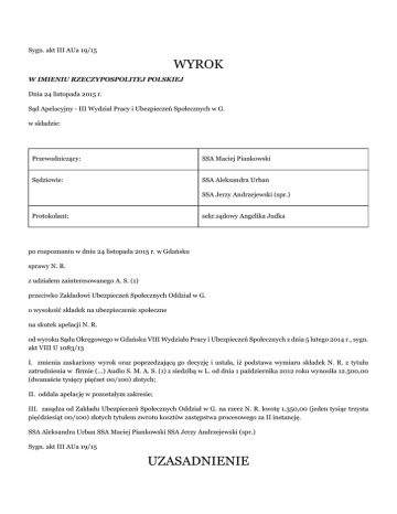 Sygn. akt III AUa 19/15 WYROK W IMIENIU RZECZYPOSPOLITEJ POLSKIEJ Dnia 24 listopada 2015 r. Sąd Apelacyjny - III Wydział Pracy i Ubezpieczeń Społecznych w G. w składzie: Przewodniczący: SSA Maciej Piankowski Sędziowie: SSA Aleksandra Urban SSA Jerzy Andrzejewski (spr.) Protokolant: sekr.sądowy Angelika Judka po rozpoznaniu w dniu 24 listopada 2015 r. w Gdańsku sprawy N. R. z udziałem zainteresowanego A. S. (1) przeciwko Zakładowi Ubezpieczeń Społecznych Oddział w G. o wysokość składek na ubezpieczenie społeczne na skutek apelacji N. R. od wyroku Sądu Okręgowego w Gdańsku VIII Wydziału Pracy i Ubezpieczeń Społecznych z dnia 5 lutego 2014 r., sygn. akt VIII U 1083/13 I. zmienia zaskarżony wyrok oraz poprzedzającą go decyzję i ustala, iż podstawa wymiaru składek N. R. z tytułu zatrudnienia w firmie (...) Audio S. M. A. S. (1) z siedzibą w L. od dnia 1 października 2012 roku wynosiła 12.500,00 (dwanaście tysięcy pięćset 00/100) złotych; II. oddala apelację w pozostałym zakresie; III. zasądza od Zakładu Ubezpieczeń Społecznych Oddział w G. na rzecz N. R. kwotę 1.350,00 (jeden tysiąc trzysta pięćdziesiąt 00/100) złotych tytułem zwrotu kosztów zastępstwa procesowego za II instancję. SSA Aleksandra Urban SSA Maciej Piankowski SSA Jerzy Andrzejewski (spr.) Sygn. akt III AUa 19/15 UZASADNIENIE Decyzją z dnia 10 kwietnia 2013 r. Zakład Ubezpieczeń Społecznych Oddział w G. ograniczył dla ubezpieczonej N. R. podstawę wymiaru składek z tytułu zatrudnienia na podstawie umowy o pracę u płatnika “ (...) Audio S. M. A. S. (1) z siedzibą w L., do kwoty odpowiadającej minimalnemu wynagrodzeniu za pracę ustalanemu na podstawie przepisów ustawy z dnia 10 października 2002 r. o minimalnym wynagrodzeniu za pracę: - do kwoty 1.500,00 zł brutto od dnia 1 października 2012 r. do 31 grudnia 2012 r. - do kwoty 1.600,00 zł brutto od dnia 1 stycznia 2013 r. Ubezpieczona N. R. odwołała się od powyższej decyzji zaskarżając ją w całości. W uzasadnieniu podała, iż nawiązany przez nią stosunek pracy był realny i ukierunkowany na długotrwałą współpracę. W odpowiedzi na odwołanie organ rentowy, podtrzymując w całości stanowisko przedstawione w zaskarżonej decyzji, wniósł o jego oddalenie oraz o wezwanie do udziału w sprawie ”V.” Audio S. M. w L.. Postanowieniem z dnia 12 sierpnia 2013 roku Sąd Okręgowy wezwał do udziału w sprawie w charakterze zainteresowanego ”V.” Audio S. M. A. S. (2) z siedzibą w L.. Wyrokiem z dnia 5 lutego 2014 r. Sąd Okręgowy w Gdańsku VIII Wydział Pracy i Ubezpieczeń Społecznych oddalił odwołanie. Powyższe rozstrzygnięcie Sąd Okręgowy wydał w oparciu o następujące ustalenia i rozważania: Kluczowym projektem realizowanym przez ”V.” Audio S. M. A. S. (2) z siedzibą w L. jest projekt (...). W związku z jego realizacją, firma złożyła projekt w Agencji Restrukturyzacji i Modernizacji Rolnictwa w ramach Programu Rozwoju Obszarów Wiejskich. W styczniu 2012 r. podpisała zaś umowę z (...)em o przyznaniu pomocy finansowej, składając w sierpniu 2012 r. wniosek o płatność. Ubezpieczona N. R., z wykształcenia fotografik, w 2000 r. ukończyła R. I. oraz zaawansowany kurs obsługi kamer specjalistycznych specjalistycznych-Diablo S. M. w 2012 r. W okresie od 15 stycznia 2010 r. do 24 lutego 2012 r. ubezpieczona prowadziła własną działalność gospodarczą związana z fotografią. W roku 2012 r. uzyskała przychód jedynie ze stosunku pracy. Dnia 28 września 2012 r. płatnik składek zawarł z ubezpieczoną N. R. umowę o pracę na czas nieokreślony na stanowisku muzykoterapeuty, trenera systemów V., fotografika, specjalisty ds. marketingu zagranicznego w wymiarze pełnego etatu. Strony ustaliły wysokość wynagrodzenia na kwotę 21.500,00 zł brutto miesięcznie. Dzień rozpoczęcia pracy określono na 1 października 2012 r. Do obowiązków ubezpieczonej należało wideofilmowanie ze szczególnym uwzględnieniem nagrywania w technice slow motions, fotografika, przetwarzanie danych (P., Premiera, A.), projektowanie stron WWW, projekty graficzne i multimedialne, telecoaching i marketing dla klientów niemiecko i anglojęzycznych, trener na seminariach i prezentacjach, instruktor w tzw. studio weekend – happeningi multimedialne z wykorzystaniem elementów terapii muzyka i dźwiękiem. Ubezpieczona przedłożyła zaświadczenie lekarskie o braku przeciwskazań do wykonywania pracy, odbyła szkolenie z zakresu BHiP Ubezpieczona została zgłoszona do obowiązkowych ubezpieczeń emerytalnego, rentowego, chorobowego i wypadkowego od dnia 1 października 2012 r. W chwili podpisywania umowy o pracę ubezpieczona była w ciąży. Ostatnie krwawienie miesięcznie wystąpiło u N. R. 14 sierpnia 2012 r. W dniu 18 września 2012 r. podczas wizyty ginekologicznej potwierdzono ciążę ubezpieczonej. Od dnia 16 listopada 2013 r. wnioskodawczyni była niezdolna do pracy z uwagi na ciążę. Przed zawarciem umowy o pracę z ubezpieczoną, zdarzało się, iż pomagała ona zainteresowanemu w prowadzonej działalności. Ubezpieczona zamieszkiwała wraz z zainteresowanym w domu obok budynku, w którym prowadzona była działalność. Firma (...) Audio S. M. w okresie od 1 października 2011 r. do 31 lipca 2013 r., poza ubezpieczoną, zatrudniała 5 pracowników z minimalnym wynagrodzeniem za pracę tzn.15000 zł za cały etat oraz 750 zł za pól etatu w roku 2012, na stanowiskach tester, koordynator projektów, redaktor, specjalista ds.marketingu, specjalista audiowizualny. Na dzień 30 października 2013 r. płatnik nie opłacił składek na ubezpieczenie społeczne za miesiąc sierpień 2013 r. oraz wrzesień 2013 r. za pracowników D. S., zatrudnionego od dnia 3 czerwca 2013 r. oraz J. G., zatrudnioną od dnia 25 czerwca 2012 r. W okresie od 1 stycznia 2012 r. do 31 grudnia 2012 r. płatnik osiągnął z prowadzonej działalności gospodarczej przychód 332361,20 zł, 