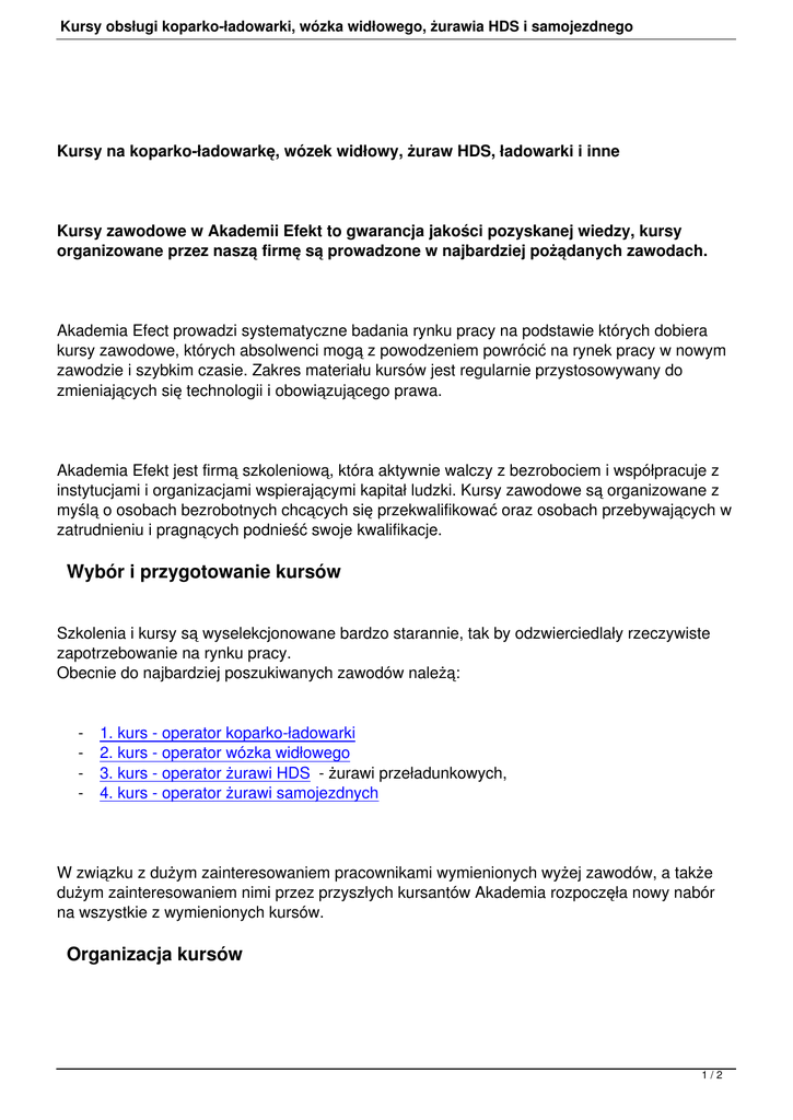 Kursy obsługi koparko-ładowarki, wózka widłowego, żurawia HDS i samojezdnego Kursy na koparko-ładowarkę, wózek widłowy, żuraw HDS, ładowarki i inne Kursy zawodowe w Akademii Efekt to gwarancja jakości pozyskanej wiedzy, kursy organizowane przez naszą firmę są prowadzone w najbardziej pożądanych zawodach. Akademia Efect prowadzi systematyczne badania rynku pracy na podstawie których dobiera kursy zawodowe, których absolwenci mogą z powodzeniem powrócić na rynek pracy w nowym zawodzie i szybkim czasie. Zakres materiału kursów jest regularnie przystosowywany do zmieniających się technologii i obowiązującego prawa. Akademia Efekt jest firmą szkoleniową, która aktywnie walczy z bezrobociem i współpracuje z instytucjami i organizacjami wspierającymi kapitał ludzki. Kursy zawodowe są organizowane z myślą o osobach bezrobotnych chcących się przekwalifikować oraz osobach przebywających w zatrudnieniu i pragnących podnieść swoje kwalifikacje. Wybór i przygotowanie kursów Szkolenia i kursy są wyselekcjonowane bardzo starannie, tak by odzwierciedlały rzeczywiste zapotrzebowanie na rynku pracy. Obecnie do najbardziej poszukiwanych zawodów należą: - 1. kurs - operator koparko-ładowarki 2. kurs - operator wózka widłowego 3. kurs - operator żurawi HDS - żurawi przeładunkowych, 4. kurs - operator żurawi samojezdnych W związku z dużym zainteresowaniem pracownikami wymienionych wyżej zawodów, a także dużym zainteresowaniem nimi przez przyszłych kursantów Akademia rozpoczęła nowy nabór na wszystkie z wymienionych kursów. Organizacja kursów 1/2 Kursy obsługi koparko-ładowarki, wózka widłowego, żurawia HDS i samojezdnego Kursy organizowane w Akademii Efekt są profesjonalnie przygotowane przez grupę ekspertówszkoleniowców z zakresu przekwalifikowań zawodowych i szkoleń organizowanych dla grup pracowników na zlecenie pracodawców. Prowadzone kursy spełniają wszystkie wymogi formalne i dydaktyczne. Sale, w których są przeprowadzane są profesjonalnie przygotowane i wyposażone w sprzęt szkoleniowy najwyższej jakości. Akademia Efect prowadzi zajęcia na symulatorze, które ułatwiają przyswojenie wiedzy praktycznej i kształtują umiejętności niezbędne w przyszłym zawodzie. Program i przebieg kursu Każdy kurs organizowany w Akademii Efekt jest podzielony na dwa etapy: - etap teoretyczny, który obejmuje zagadnienia z zakresu: - budowy i obsługi wybranej maszyny możliwości technicznych obsługiwanego sprzętu wyposażenia kabiny szkolenie BHP - etap praktyczny, który obejmuje w większości szkoleń najpierw pracę na symulatorze, dzięki czemu kursant bez zbędnego stresu ma możliwość oswojenia się z kabiną jej obsługą. Po odbyciu szkolenia na symulatorze następuje ostatni etap, czyli praca w rzeczywistych warunkach. Najczęściej tą część szkolenia przeprowadzamy na budowach, w kopalniach, magazynach itp., lub w warunkach zbliżonych do naturalnych. Wszystkich zainteresowanych przekwalifikowaniem zawodowym lub podwyższeniem swoich kwalifikacji także kursami dla grup pracowników kierujemy na adres: www.akademia-efect.pl 2/2