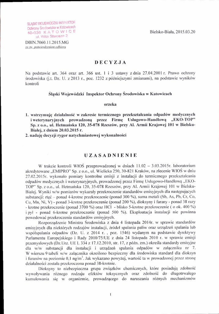 odpad6w medycznych i weterynaryjnych, prowadzonej przez Firmg Uslugowo-flandlowq ,,EKOTOP" Sp. z o.o.. ul. Hetmariska 120, 35-078 Rzesz6w, przy Al. Armii Krajowej l0l w BielskuBiatej. Wyniki w/w pomiar6w wykazaly przekroczenie standard6w emisyjnych dla nastqpu.l4cych
