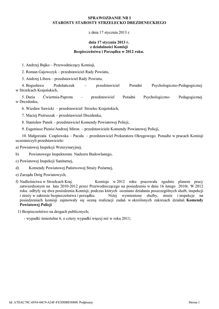 SPRAWOZDANIE NR I STAROSTY STAROSTY STRZELECKO DREZDENECKIEGO z dnia 17 stycznia 2013 r. dnia 17 stycznia 2013 r. z działalności Komisji Bezpieczeństwa i Porządku w 2012 roku. 1. Andrzej Bajko – Przewodniczący Komisji, 2. Roman Gajowczyk – przedstawiciel Rady Powiatu, 3. Andrzej Libera – przedstawiciel Rady Powiatu, 4. Bogusława Podolańczuk w Strzelcach Krajeńskich, 5. Daria w Drezdenku, Ćwiertnia-Paprota – – przedstawiciel przedstawiciel Poradni Poradni Psychologiczno-Pedagogicznej Psychologiczno- Pedagogicznej 6. Wiesław Sawicki – przedstawiciel Strzelec Krajeńskich, 7. Maciej Pietruszak – przedstawiciel Drezdenka, 8. Stanisław Panek – przedstawiciel Komendy Powiatowej Policji, 9. Eugeniusz Pienio/Andrzej Miron – przedstawiciele Komendy Powiatowej Policji, 10. Małgorzata Czaplewska – Pacała – przedstawiciel Prokuratora Okręgowego. Ponadto w pracach Komisji uczestniczyli przedstawiciele: a) Powiatowej Inspekcji Weterynaryjnej, b) Powiatowego Inspektoratu Nadzoru Budowlanego, c) Powiatowej Inspekcji Sanitarnej, d) Komendy Powiatowej Państwowej Straży Pożarnej, e) Zarządu Dróg Powiatowych, f) Nadleśnictwa w Strzelcach Kraj. Komisja w 2012 roku pracowała zgodnie planem pracy zatwierdzonym na lata 2010-2012 przez Przewodniczącego na posiedzeniu w dniu 16 lutego 2010r. W 2012 roku odbyły się dwa posiedzenia Komisji, podczas których oceniano działania poszczególnych służb, inspekcji i straży w zakresie bezpieczeństwa i porządku. Niżej wymienione służby, straże i inspekcje na posiedzeniach komisji zajmowały się oceną realizacji zadań w określonych zakresach działań: Komendy Powiatowej Policji 1) Bezpieczeństwo na drogach publicznych; - wypadki śmiertelne 6, o cztery wypadki więcej niż w roku 2011; Id: A7DAC78C-6954-44C9-A24F-FE5D0B858800. Podpisany Strona 1 - wypadki drogowe 44 z tego na terenie poszczególnych gmin: Strzelce Krajeńskich- 8, Drezdenko – 18, Dobiegniew – 11, Zwierzyn – 3 i Stare Kurowo 4. W zestawieniu do roku 2011, kiedy to wydarzyło się 33 wypadki , liczba ta wzrosła o 11 zdarzeń. W wyniku wypadków drogowych 6 osób poniosło śmierć. W roku 2011 na drogach śmierć poniosły 2 osoby. W wypadkach drogowych rannych zostało 58 osób, w tym na terenie gmin: Strzelce Krajeńskie - 14 osób, Drezdenko – 23 osoby, Dobiegniew – 12 osób, Stare Kurowo – 4 osoby, Zwierzyn – 5 osób. W porównaniu do roku 2011, kiedy obrażenia odniosło 33 osoby, liczba rannych zwiększyła się o 25 osób. Ujawniono 257 nietrzeźwych kierowców pojazdów mechanicznych, w 2012 roku zatrzymano 94 kierowców pod wpływem alkoholu. Natomiast pod wpływem środków odurzających w roku 2012 zatrzymano 1 kierowcę pojazdu mechanicznego. W skali całego powiatu najbardziej zagrożonymi gminami pod względem ilości wypadków i liczby rannych w roku 2012 są Gminy Drezdenko i Dobiegniew. W roku 2012 do jednostek Policji zgłoszono 403 kolizje drogowe, z czego na terenie Gminy: Strzelce Krajeńskie - 156, Drezdenko – 133, Dobiegniew – 57, Stare Kurowo- 29 i Zwierzyn – 28. Liczba ta zmniejszyła się o 2 kolizje (w roku 2011 zgłoszono 405 kolizji). Na terenie gminy Strzelce Krajeńskie zmniejszyła się liczba zgłoszonych kolizji z 179 w roku 2011 do 156 w roku 2012. Na otwartych akwenach wodnych odnotowano jedno utonięcie. W okresie wakacyjnym tj.: czerwiec –wrzesień Policja dokonała: - 82 kontrole w miejscowościach wypoczynkowych dzieci i młodzieży w zakresie wypoczynku, bezpiecznego - 12 spotkań w ramach sezonu letniego, - 8 skierowań do sądu rodzinnego, - ujawniono 3 osoby nieletnie pod wpływem alkoholu, - wylegitymowano 103 osoby nieletnie, - wysłano 23 powiadomienia do rodzin o przestępstwie, - wykonano 184 kontrole punktów sprzedaży alkoholu. W ramach działań profilaktycznych Policja realizowała następujące programy: - Trzeźwy poranek, - Alkohol i maskotki, - Prędkość, - Działanie pn. TRUC, jest to ukierunkowanie na ujawnianie i eliminowanie z wykorzystaniem transportu drogowego, nieprawidłowości związanych - Bus, nieprawidłowości w przewozie osób, młodzieży i dzieci, - Bezpieczne weekendy. Wnioski końcowe: Nastąpił wzrost liczby wypadków i zatrzymanych nietrzeźwych kierowców pojazdów mechanicznych. Wzrosła liczba wypadków ze skutkiem śmiertelnym o 4 osoby. Na terenie Gminy Dobiegniew wzrosła liczba kolizji drogowych o 14 zgłoszeń. Z przedstawionych analiz wynika, że w dalszym ciągu konieczne są przedsięwzięcia zmierzające do ujawnienia i zwalczania wykroczeń, które mają wpływ na bezpieczeństwo ruchu tj.: przekraczanie dozwolonej prędkości przez kierujących oraz eliminowanie nietrzeźwych uczestników ruchu drogowego. Najskuteczniejszym narzędziem znajdującym się obecnie na wyposażeniu Policji, są pojazdy z video rejestratorami i fotoradarami oraz urządzenia do sprawdzania trzeźwości kierowców na odległość „ALCOBLU” . W roku 2012 została zwiększona obsada osobowa Ruchu Drogowego z 7 funkcjonariuszy do 10. Zakupiony został samochód z wideo rejestratorem. Ukierunkowanie działań Policji na: - eliminowanie kierowców pod wpływem alkoholu lub środka odurzającego; - wyrobienie u kierujących pojazdami przeświadczenia o konieczności przestrzegania przepisów ruchu drogowego; - pełne wykorzystanie specjalistycznego sprzętu kontrolno-pomiarowego. Poprzez realizację w/w działań można wpływać na poziom bezpieczeństwa ruchu drogowego i poczucia bezpieczeństwa mieszkańców naszego powiatu. Komendy Powiatowej Państwowej Straży Pożarnej KP PSP wykonywała zadania w następujących zakresach : a) prowadzenia akcji ratowniczych, Id: A7DAC78C-6954-44C9-A24F-FE5D0B858800. Podpisany Strona 2 b) rozpoznawania zagrożeń pożarowych i innych miejscowych zagrożeń, c) nadzorowania przestrzegania przepisów przeciwpożarowych. Wymieniona działalność jest realizowana w następujących obszarach: a) obszar zagrożenia chemiczn