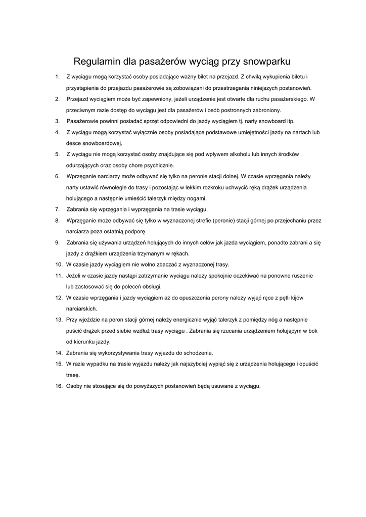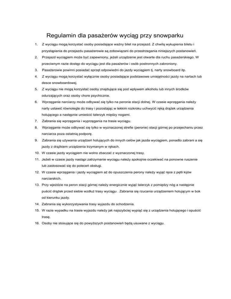 Regulamin dla pasażerów wyciąg przy snowparku 1. Z wyciągu mogą korzystać osoby posiadające ważny bilet na przejazd. Z chwilą wykupienia biletu i przystąpienia do przejazdu pasażerowie są zobowiązani do przestrzegania niniejszych postanowień. 2. Przejazd wyciągiem może być zapewniony, jeżeli urządzenie jest otwarte dla ruchu pasażerskiego. W przeciwnym razie dostęp do wyciągu jest dla pasażerów i osób postronnych zabroniony. 3. Pasażerowie powinni posiadać sprzęt odpowiedni do jazdy wyciągiem tj. narty snowboard itp. 4. Z wyciągu mogą korzystać wyłącznie osoby posiadające podstawowe umiejętności jazdy na nartach lub desce snowboardowej. 5. Z wyciągu nie mogą korzystać osoby znajdujące się pod wpływem alkoholu lub innych środków odurzających oraz osoby chore psychicznie. 6. Wprzęganie narciarzy może odbywać się tylko na peronie stacji dolnej. W czasie wprzęgania należy narty ustawić równolegle do trasy i pozostając w lekkim rozkroku uchwycić ręką drążek urządzenia holującego a następnie umieścić talerzyk między nogami. 7. Zabrania się wprzęgania i wyprzęgania na trasie wyciągu. 8. Wprzęganie może odbywać się tylko w wyznaczonej strefie (peronie) stacji górnej po przejechaniu przez narciarza poza ostatnią podporę. 9. Zabrania się używania urządzeń holujących do innych celów jak jazda wyciągiem, ponadto zabrani a się jazdy z drążkiem urządzenia trzymanym w rękach. 10. W czasie jazdy wyciągiem nie wolno zbaczać z wyznaczonej trasy. 11. Jeżeli w czasie jazdy nastąpi zatrzymanie wyciągu należy spokojnie oczekiwać na ponowne ruszenie lub zastosować się do poleceń obsługi. 12. W czasie wprzęgania i jazdy wyciągiem aż do opuszczenia perony należy wyjąć ręce z pętli kijów narciarskich. 13. Przy wjeździe na peron stacji górnej należy energicznie wyjąć talerzyk z pomiędzy nóg a następnie puścić drążek przed siebie wzdłuż trasy wyciągu . Zabrania się rzucania urządzeniem holującym w bok od kierunku jazdy. 14. Zabrania się wykorzystywania trasy wyjazdu do schodzenia. 15. W razie wypadku na trasie wyjazdu należy jak najszybciej wypiąć się z urządzenia holującego i opuścić trasę. 16. Osoby nie stosujące się do powyższych postanowień będą usuwane z wyciągu.
