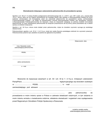 OS. Oświadczenie dotyczące ustanowienia pełnomocnika do prowadzenia sprawy Zgodnie z art. 40 § 4 i 5 ustawy Kodeks postępowania administracyjnego (Dz. U. z 2013 r. poz. 267 z późn. zm.), zwanej dalej „K.p.a.” strona, która nie ma miejsca zamieszkania lub zwykłego pobytu albo siedziby w Rzeczypospolitej Polskiej lub innym państwie członkowskim Unii Europejskiej, jeżeli nie ustanowiła pełnomocnika do prowadzenia sprawy zamieszkałego w Rzeczypospolitej Polskiej i nie działa za pośrednictwem konsula Rzeczypospolitej Polskiej, jest obowiązana wskazać w Rzeczypospolitej Polskiej pełnomocnika do doręczeń, chyba że doręczenie następuje za pomocą środków komunikacji elektronicznej. W razie niewskazania pełnomocnika do doręczeń przeznaczone dla tej strony pisma pozostawia się w aktach sprawy ze skutkiem doręczenia. Zgodnie z art. 32 K.p.a. strona może działać przez pełnomocnika, chyba że charakter czynności wymaga jej osobistego stawiennictwa. Pełnomocnikiem zgodnie z art. 33 § 1 i § 2 K.p.a. może być osoba fizyczna posiadająca zdolność do czynności prawnych. Pełnomocnictwo powinno być udzielone na piśmie lub zgłoszone do protokołu ............................................................ Miejscowość, data ......................................................... Imię i Nazwisko osoby ustanawiającej pełnomocnika ......................................................... PESEL ......................................................... ......................................................... adres zamieszkania ......................................................... e - mail Stosownie do dyspozycji zawartych w art. 32 i art. 33 § 1 i 2 K.p.a. niniejszym ustanawiam Panią/Pana ............................................................................ legitymujacą/ego się dowodem osobistym nr .................................. PESEL .............................................. e - mail ............................................. zamieszkałą/ego pod adresem ............................................................................................................. ........................................................................................................………………………………………… ……………………………………………………………….……………. jako pełnomocnika do prowadzenia w moim imieniu spraw w Polsce w zakresie świadczeń rodzinnych, w tym złożenia w moim imieniu wniosku o świadczenia rodzinne, składania oświadczeń i wyjaśnień oraz występowania przed Regionalnym Ośrodkiem Polityki Społecznej w Rzeszowie. .................................................. czytelny podpis osoby ustanawiającej pełnomocnika
