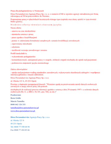 Praca dla pielęgniarek/rzy w Niemczech Diwa Personalservice Agencja Pracy Sp. z o. o. o numerze 6760 w rejestrze agencji zatrudnienia jest firmą rekrutującą od 30 lat pracowników do Niemiec. Proponujemy pracę w placówkach leczniczych różnego typu (szpitale oraz domy opieki) w tym również blisko granicy. N i e k t ó r e o f e r t y r ó w n i e ż z k u r s e m j ę z y k a. Nasza oferta: - umowa na czas nieokreślony - niemiecka umowa o pracę - praca zgodna z kwalifikacjami - pomoc w załatwianiu formalności urzędowych- uznanie kwalifikacji zawodowych - zapewniamy mieszkanie - szkolenia - możliwość rozwoju zawodowego i awansu Profil kandydatki/a: - wykształcenie pielęgniarskie - komunikatywność, umiejętność pracy w zespole, zdolność empatii niezbędna do opieki nad pacjentami - podstawowa znajomość języka niemieckiego Zakres obowiązków: - opieka nad pacjentem według standardów zawodowych, wykonywanie określonych zabiegów i współpraca interdyscyplinarna z innymi oddziałami. Diwa Personalservice Agencja Pracy Sp. z o.o. ul. Oleska 121 b, 45-231 Opole Prosimy o dopisanie następującej klauzuli: "Wyrażam zgodę na przetwarzanie moich danych osobowych zawartych w mojej ofercie pracy dla potrzeb niezbędnych do realizacji procesu rekrutacji zgodnie z ustawą z dnia 29 sierpnia 1997 r. o ochronie danych osobowych (Dz. U. z 2002 r. Nr 101, poz. 926, ze zm.)" Pozdrawiam Beste Grüße Marcin Tumulka 0048 662 126 355 [email protected] www.diwa-personalservice.pl Diwa Personalservice Agencja Pracy Sp. z o.o. ul. Oleska 121 b 45-231 Opole Tel. 0048 77 550 68 94 Fax 0048 77 454 85 66