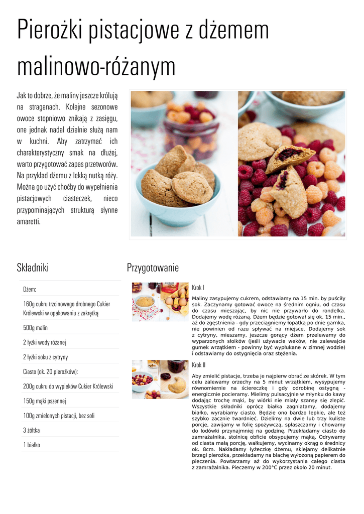 Powered by TCPDF (www.tcpdf.org) Pierożki pistacjowe z dżemem malinowo-różanym Jak to dobrze, że maliny jeszcze królują na straganach. Kolejne sezonowe owoce stopniowo znikają z zasięgu, one jednak nadal dzielnie służą nam w kuchni. Aby zatrzymać ich charakterystyczny smak na dłużej, warto przygotować zapas przetworów. Na przykład dżemu z lekką nutką róży. Można go użyć choćby do wypełnienia pistacjowych ciasteczek, nieco przypominających strukturą słynne amaretti. Składniki Dżem: 160g cukru trzcinowego drobnego Cukier Królewski w opakowaniu z zakrętką 500g malin 2 łyżki wody różanej 2 łyżki soku z cytryny Ciasto (ok. 20 pierożków): 200g cukru do wypieków Cukier Królewski 150g mąki pszennej 100g zmielonych pistacji, bez soli 3 żółtka 1 białko Przygotowanie Krok I Maliny zasypujemy cukrem, odstawiamy na 15 min. by puściły sok. Zaczynamy gotować owoce na średnim ogniu, od czasu do czasu mieszając, by nic nie przywarło do rondelka. Dodajemy wodę różaną. Dżem będzie gotował się ok. 15 min., aż do zgęstnienia - gdy przeciągniemy łopatką po dnie garnka, nie powinien od razu spływać na miejsce. Dodajemy sok z cytryny, mieszamy, jeszcze gorący dżem przelewamy do wyparzonych słoików (jeśli używacie weków, nie zalewajcie gumek wrzątkiem - powinny być wypłukane w zimnej wodzie) i odstawiamy do ostygnięcia oraz stężenia. Krok II Aby zmielić pistacje, trzeba je najpierw obrać ze skórek. W tym celu zalewamy orzechy na 5 minut wrzątkiem, wysypujemy równomiernie na ściereczkę i gdy odrobinę ostygną energicznie pocieramy. Mielimy pulsacyjnie w młynku do kawy dodając trochę mąki, by wiórki nie miały szansy się zlepić. Wszystkie składniki oprócz białka zagniatamy, dodajemy białko, wyrabiamy ciasto. Będzie ono bardzo lepkie, ale też szybko zacznie twardnieć. Dzielimy na dwie lub trzy kuliste porcje, zawijamy w folię spożywczą, spłaszczamy i chowamy do lodówki przynajmniej na godzinę. Przekładamy ciasto do zamrażalnika, stolnicę obficie obsypujemy mąką. Odrywamy od ciasta małą porcję, wałkujemy, wycinamy okrąg o średnicy ok. 8cm. Nakładamy łyżeczkę dżemu, sklejamy delikatnie brzegi pierożka, przekładamy na blachę wyłożoną papierem do pieczenia. Powtarzamy aż do wykorzystania całego ciasta z zamrażalnika. Pieczemy w 200°C przez około 20 minut.