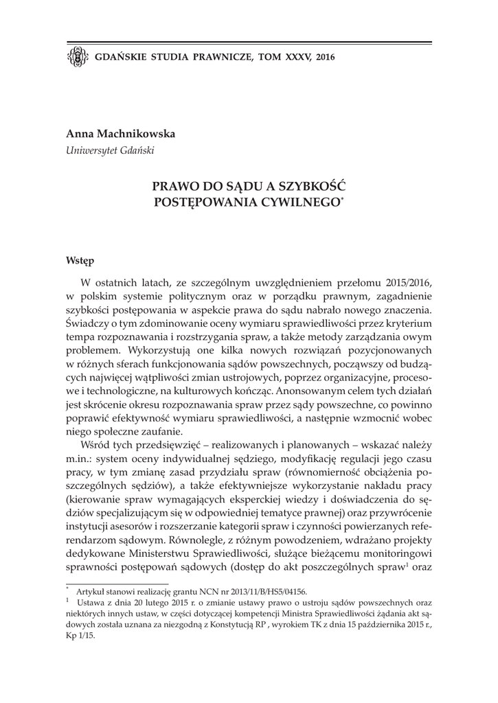 Anna Machnikowska Uniwersytet Gdański Prawo do sądu a szybkość postępowania cywilnego* Wstęp W ostatnich latach, ze szczególnym uwzględnieniem przełomu 2015/2016, w polskim systemie politycznym oraz w porządku prawnym, zagadnienie szybkości postępowania w aspekcie prawa do sądu nabrało nowego znaczenia. Świadczy o tym zdominowanie oceny wymiaru sprawiedliwości przez kryterium tempa rozpoznawania i rozstrzygania spraw, a także metody zarządzania owym problemem. Wykorzystują one kilka nowych rozwiązań pozycjonowanych w różnych sferach funkcjonowania sądów powszechnych, począwszy od budzących najwięcej wątpliwości zmian ustrojowych, poprzez organizacyjne, procesowe i technologiczne, na kulturowych kończąc. Anonsowanym celem tych działań jest skrócenie okresu rozpoznawania spraw przez sądy powszechne, co powinno poprawić efektywność wymiaru sprawiedliwości, a następnie wzmocnić wobec niego społeczne zaufanie. Wśród tych przedsięwzięć – realizowanych i planowanych – wskazać należy m.in.: system oceny indywidualnej sędziego, modyfikację regulacji jego czasu pracy, w tym zmianę zasad przydziału spraw (równomierność obciążenia poszczególnych sędziów), a także efektywniejsze wykorzystanie nakładu pracy (kierowanie spraw wymagających eksperckiej wiedzy i doświadczenia do sędziów specjalizującym się w odpowiedniej tematyce prawnej) oraz przywrócenie instytucji asesorów i rozszerzanie kategorii spraw i czynności powierzanych referendarzom sądowym. Równolegle, z różnym powodzeniem, wdrażano projekty dedykowane Ministerstwu Sprawiedliwości, służące bieżącemu monitoringowi sprawności postępowań sądowych (dostęp do akt poszczególnych spraw1 oraz * Artykuł stanowi realizację grantu NCN nr 2013/11/B/HS5/04156. Ustawa z dnia 20 lutego 2015 r. o zmianie ustawy prawo o ustroju sądów powszechnych oraz niektórych innych ustaw, w części dotyczącej kompetencji Ministra Sprawiedliwości żądania akt sądowych została uznana za niezgodną z Konstytucją RP , wyrokiem TK z dnia 15 października 2015 r., Kp 1/15. 1 282 Anna Machnikowska nowe narzędzia analizy tendencji regionalnych i ogólnokrajowych). Odnotowano także postęp w upowszechnianiu technologii informatycznych oraz innych innowacji organizacyjnych, w tym w formie elektronicznego postępowania odwoławczego i postępowania rejestrowego, jak również na etapie doręczania pism sądowych (wraz ze zniesieniem monopolu państwowego operatora). Realizując te i wiele innych działań, zdecydowano o nowelizacji prawa o ustroju sądów powszechnych, uchwaleniu nowego regulaminu urzędowania sądów w sprawach cywilnych, a następnie jego dalszej zmiany, jak również o kilkunastu nowelizacjach kodeksu postępowania cywilnego. Opracowano też kolejną strategię dla wymiaru sprawiedliwości2 oraz zaangażowano do badań nad sprawnością modelu organizacji sądownictwa przedstawicieli wielu instytucji państwowych, w tym Instytutu Wymiaru Sprawiedliwości, a także niezależnych organizacji pozarządowych. Standard prawny szybkości postępowania wspomaga też od kilkunastu lat w Polsce, a kilkudziesięciu w europejskim porządku prawnym, etyka zawodowa sędziów3. Obserwacja tak wzmożonej aktywności uprawnia jednak do stwierdzenia, że niektóre z jej podstawowych założeń oraz sposoby ich wykonywania powinny zostać poddane istotnej weryfikacji. Jest to tym bardziej uzasadnione, im bardziej nieproporcjonalne do spodziewanych efektów staje się zaangażowanie kolejnych zasobów intelektualnych, legislacyjnych i materialnych, w tym finansowych. Tymczasem potrzeba szybkiego tempa funkcjonowania wymiaru sprawiedliwości narasta4. Za opracowaniem nowej polityki na rzecz sprawnego postępowania sądowego przemawia, nieobecny wcześniej, dodatkowy, negatywny wymiar przewlekłości postępowania sądowego. Zaostrza się bowiem polemika na temat źródeł tytułowego problemu, pogłębiając podziały między środowiskiem sędziowskim a Ministerstwem Sprawiedliwości. Towarzyszą im liczne wątpliwości natury konstytucyjnej i ekonomicznej oraz powstawanie kolejnych obszarów kolizji praw i interesów. Unormowaniu sytuacji nie sprzyja fragmentaryczna identyfikacja zależności między odnoszącym się do tej kwestii stanem faktycznym, a stanem prawnym, jak również stanem świadomości społecznej. Pierwszy z nich stygmatyzowany jest danymi statystycznymi potwierdzającymi ponowne zwiększenie liczby zaległych spraw w sądach powszechnych. Drugi cechuje się intensywną jurydyzacją różnorodnych czynników oddziałujących na szybkość postępowania cywilnego. Opinię publiczną oraz programy polityczne 2 Strategia modernizacji przestrzeni sprawiedliwości w Polsce na lata 2014–2020, Warszawa 2013, opracowana przez przedstawicieli Krajowej Szkoły Sądownictwa i Prokuratury, Ministerstwa Sprawiedliwości i Prokuratury Generalnej. 3 Zbiór zasad etyki zawodowej sędziów, uchwała KRS nr 16/2003 z dnia 19 lutego 2003 r., http:// www.krs.pl; Europejska Karta o Statusie Sędziów, 1998, http://www.bip.ms.gov. 4 Szerzej P. Banasik, P. Masiukiewicz, Czynnik temporalny w sądowych procesach gospodarczych a utrata wartości przedsiębiorstw, [w:] Budowa wartości wymiaru sprawiedliwości. Wymiar prawny, zarządczy i ekonomiczny, red. P. Banasik, Gdańsk 2015, s. 276–293; R. Cooter, T. Ulen, Ekonomiczna analiza prawa, Warszawa 2009, s. 508–588. Prawo do sądu a szybkość postępowania cywilnego 283 zdominowała natomiast kultura szybkości, kształtując współczesny standard komunikacji instytucji publicznych i ich otoczenia, a także uproszczoną, negatywną ocenę sądownictwa. Ostatnia ze wskazanych okoliczności coraz silniej oddziałuje na racjonalizację aprobaty dla interwencji władzy wykonawczej w sferę władzy sądowniczej, przeprowadzanej pod hasłem rozwiązania lub ograniczenia zjawiska przewlekłości postępowań prowadzonych przed sąda