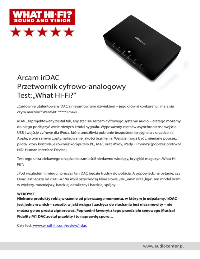 Arcam irDAC Przetwornik cyfrowo-analogowy Test: „What Hi-Fi?” „Cudownie utalentowany DAC z niesamowitym dźwiekiem – jego główni konkurencji mają się czym martwić” Werdykt: ***** (max) irDAC zaprojektowany został tak, aby stać się sercem cyfrowego systemu audio – dlatego możemy do niego podłączyć wiele różnych źródeł sygnału. Wyposażony został w asynchroniczne wejście USB i wejście cyfrowe dla iPoda, które umożliwia pobranie bezpośrednio sygnału z urządzenia Apple, a tym samym zoptymalizowanie jakości brzmienia. Wejścia mogą być zmieniane poprzez pilota, który kontroluje również komputery PC, MAC oraz iPody, iPady i iPhone’y (poprzez protokół HID: Human Interface Device). Test tego ultra-ciekawego urządzenia zamieścił niedawno wiodący, brytyjski magazyn „What HiFi?”: „Pod względem timingu i precyzji ten DAC będzie trudny do pobicia. A odpowiedź na pytanie, czy Dirac jest lepszy od rDAC-a? Na myśl przychodzą takie słowa, jak: „inna” oraz „liga”. Ten model brzmi w większy, mocniejszy, bardziej detaliczny i bardziej spójny. WERDYKT Niektóre produkty robią wrażenie od pierwszego momentu, w którym je odpalamy. irDAC jest jednym z nich – sposób, w jaki wciąga i zachęca do słuchania jest niesamowity – nie można go po prostu zignorować. Poprzedni faworyt z tego przedziału cenowego Musical Fidelity M1 DAC został przebity i to naprawdę sporo… Cały test: www.whathifi.com/review/irdac www.audiocenter.pl