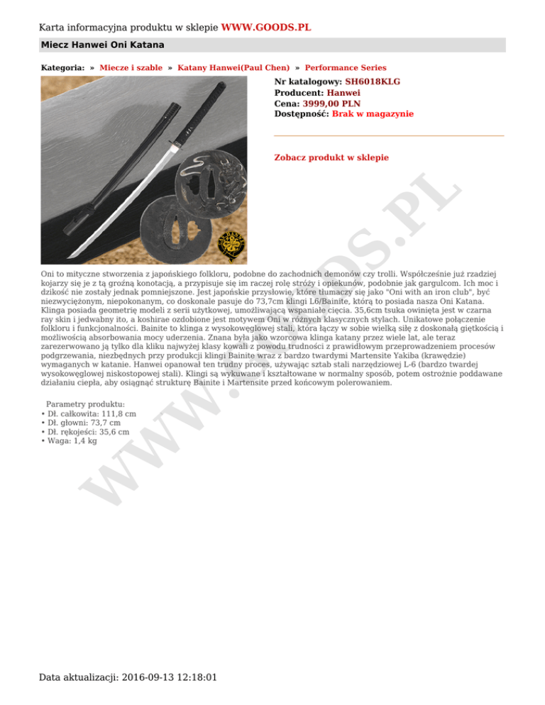Karta informacyjna produktu w sklepie WWW.GOODS.PL Miecz Hanwei Oni Katana Kategoria: » Miecze i szable » Katany Hanwei(Paul Chen) » Performance Series Nr katalogowy: SH6018KLG Producent: Hanwei Cena: 3999,00 PLN Dostępność: Brak w magazynie S. PL Zobacz produkt w sklepie W .G O O D Oni to mityczne stworzenia z japońskiego folkloru, podobne do zachodnich demonów czy trolli. Współcześnie już rzadziej kojarzy się je z tą groźną konotacją, a przypisuje się im raczej rolę stróży i opiekunów, podobnie jak gargulcom. Ich moc i dzikość nie zostały jednak pomniejszone. Jest japońskie przysłowie, które tłumaczy się jako "Oni with an iron club", być niezwyciężonym, niepokonanym, co doskonale pasuje do 73,7cm klingi L6/Bainite, którą to posiada nasza Oni Katana. Klinga posiada geometrię modeli z serii użytkowej, umożliwającą wspaniałe cięcia. 35,6cm tsuka owinięta jest w czarna ray skin i jedwabny ito, a koshirae ozdobione jest motywem Oni w różnych klasycznych stylach. Unikatowe połączenie folkloru i funkcjonalności. Bainite to klinga z wysokowęglowej stali, która łączy w sobie wielką siłę z doskonałą giętkością i możliwością absorbowania mocy uderzenia. Znana była jako wzorcowa klinga katany przez wiele lat, ale teraz zarezerwowano ją tylko dla kliku najwyżej klasy kowali z powodu trudności z prawidłowym przeprowadzeniem procesów podgrzewania, niezbędnych przy produkcji klingi Bainite wraz z bardzo twardymi Martensite Yakiba (krawędzie) wymaganych w katanie. Hanwei opanował ten trudny proces, używając sztab stali narzędziowej L-6 (bardzo twardej wysokowęglowej niskostopowej stali). Klingi są wykuwane i kształtowane w normalny sposób, potem ostrożnie poddawane działaniu ciepła, aby osiągnąć strukturę Bainite i Martensite przed końcowym polerowaniem. W W Parametry produktu: • Dł. całkowita: 111,8 cm • Dł. głowni: 73,7 cm • Dł. rękojeści: 35,6 cm • Waga: 1,4 kg Data aktualizacji: 2016-09-13 12:18:01