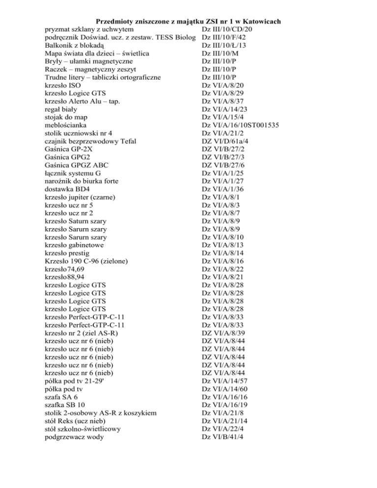 Przedmioty zniszczone z majątku ZSI nr 1 w Katowicach pryzmat szklany z uchwytem Dz III/10/CD/20 podręcznik Doświad. ucz. z zestaw. TESS Biolog Dz III/10/F/42 Balkonik z blokadą Dz III/10/Ł/13 Mapa świata dla dzieci – świetlica Dz III/10/M Bryły – ułamki magnetyczne Dz III/10/P Raczek – magnetyczny zeszyt Dz III/10/P Trudne litery – tabliczki ortograficzne Dz III/10/P krzesło ISO Dz VI/A/8/20 krzesło Logice GTS Dz VI/A/8/29 krzesło Alerto Alu – tap. Dz VI/A/8/37 regał biały Dz VI/A/14/23 stojak do map Dz VI/A/15/4 meblościanka Dz VI/A/16/10ST001535 stolik uczniowski nr 4 Dz VI/A/21/2 czajnik bezprzewodowy Tefal DZ VI/D/61a/4 Gaśnica GP-2X DZ VI/B/27/2 Gaśnica GPG2 DZ VI/B/27/3 Gaśnica GPGZ ABC DZ VI/B/27/6 łącznik systemu G Dz VI/A/1/25 narożnik do biurka forte Dz VI/A/1/27 dostawka BD4 Dz VI/A/1/36 krzesło jupiter (czarne) Dz VI/A/8/1 krzesło ucz nr 5 Dz VI/A/8/3 krzesło ucz nr 2 Dz VI/A/8/7 krzesło Saturn szary Dz VI/A/8/9 krzesło Sarurn szary Dz VI/A/8/9 krzesło Sarurn szary Dz VI/A/8/10 krzesło gabinetowe Dz VI/A/8/13 krzesło prestig Dz VI/A/8/14 Krzesło 190 C-96 (zielone) Dz VI/A/8/16 krzesło 74,69 Dz VI/A/8/22 krzesło 88,94 Dz VI/A/8/21 krzesło Logice GTS Dz VI/A/8/28 krzesło Logice GTS Dz VI/A/8/28 krzesło Logice GTS Dz VI/A/8/28 krzesło Logice GTS Dz VI/A/8/28 krzesło Perfect-GTP-C-11 Dz VI/A/8/33 krzesło Perfect-GTP-C-11 Dz VI/A/8/33 krzesło nr 2 (ziel AS-R) DZ VI/A/8/39 krzesło ucz nr 6 (nieb) DZ VI/A/8/44 krzesło ucz nr 6 (nieb) DZ VI/A/8/44 krzesło ucz nr 6 (nieb) DZ VI/A/8/44 krzesło ucz nr 6 (nieb) DZ VI/A/8/44 krzesło ucz nr 6 (nieb) DZ VI/A/8/44 półka pod tv 21-29' Dz VI/A/14/57 półka pod tv Dz VI/A/14/60 szafa SA 6 Dz VI/A/16/16 szafka SB 10 Dz VI/A/16/19 stolik 2-osobowy AS-R z koszykiem Dz VI/A/21/8 stół Reks (ucz nieb) Dz VI/A/21/14 Dz VI/A/22/4 stół szkolno-świetlicowy podgrzewacz wody Dz VI/B/41/4