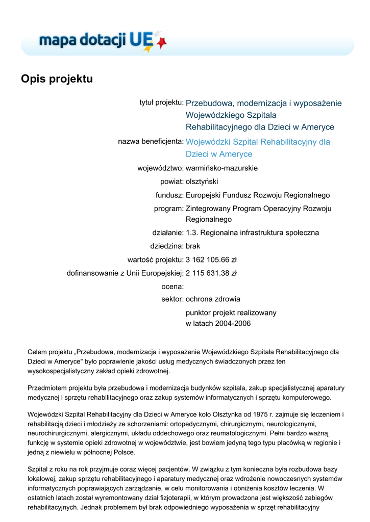 Opis projektu tytuł projektu: Przebudowa, modernizacja i wyposażenie Wojewódzkiego Szpitala Rehabilitacyjnego dla Dzieci w Ameryce nazwa beneficjenta: Wojewódzki Szpital Rehabilitacyjny dla Dzieci w Ameryce województwo: warmińsko-mazurskie powiat: olsztyński fundusz: Europejski Fundusz Rozwoju Regionalnego program: Zintegrowany Program Operacyjny Rozwoju Regionalnego działanie: 1.3. Regionalna infrastruktura społeczna dziedzina: brak wartość projektu: 3 162 105.66 zł dofinansowanie z Unii Europejskiej: 2 115 631.38 zł ocena: sektor: ochrona zdrowia punktor projekt realizowany w latach 2004-2006 Celem projektu „Przebudowa, modernizacja i wyposażenie Wojewódzkiego Szpitala Rehabilitacyjnego dla Dzieci w Ameryce" było poprawienie jakości usług medycznych świadczonych przez ten wysokospecjalistyczny zakład opieki zdrowotnej. Przedmiotem projektu była przebudowa i modernizacja budynków szpitala, zakup specjalistycznej aparatury medycznej i sprzętu rehabilitacyjnego oraz zakup systemów informatycznych i sprzętu komputerowego. Wojewódzki Szpital Rehabilitacyjny dla Dzieci w Ameryce koło Olsztynka od 1975 r. zajmuje się leczeniem i rehabilitacją dzieci i młodzieży ze schorzeniami: ortopedycznymi, chirurgicznymi, neurologicznymi, neurochirurgicznymi, alergicznymi, układu oddechowego oraz reumatologicznymi. Pełni bardzo ważną funkcję w systemie opieki zdrowotnej w województwie, jest bowiem jedyną tego typu placówką w regionie i jedną z niewielu w północnej Polsce. Szpital z roku na rok przyjmuje coraz więcej pacjentów. W związku z tym konieczna była rozbudowa bazy lokalowej, zakup sprzętu rehabilitacyjnego i aparatury medycznej oraz wdrożenie nowoczesnych systemów informatycznych poprawiających zarządzanie, w celu monitorowania i obniżenia kosztów leczenia. W ostatnich latach został wyremontowany dział fizjoterapii, w którym prowadzona jest większość zabiegów rehabilitacyjnych. Jednak problemem był brak odpowiedniego wyposażenia w sprzęt rehabilitacyjny szczególnie do fizykoterapii i kinezyterapii. W celu zmniejszenia kosztów leczenia i zwiększenia dostępności usług medycznych oferowanych przez szpital koniecznym było przygotowanie właściwej bazy pod alergologię „jednego dnia" i pracownie terapeutyczne. Problemem w szpitalu było również monitorowanie kosztów leczenia i funkcjonowania całej placówki, dlatego zdecydowano się na wdrożenie nowoczesnych systemów informatycznych wspomagających zarządzanie oraz organizację odpowiedniej sieci komputerowej i zakup sprzętu. W ramach projektu m.in. osiągnięto poprawę jakości i dostępności świadczonych dotychczas usług, poprawiono zarządzanie kosztami, płynnością finansową i sferą medyczną, w zaplanowanym zakresie dostosowano budynek główny i infrastrukturę szpitala do wymogów określonych w aktualnych przepisach prawa, przygotowano właściwą bazę pod leczenie pacjentów w formie specjalistycznego działu opieki „jednego dnia", uzyskano dodatkową powierzchnię 640,7 m² w wyniku przebudowy poddasza nieużytkowego i zaadaptowano ją na salę gimnastyczną i pomieszczenia rehabilitacyjno-terapeutyczne, wybudowano podjazd dla karetek i niepełnosprawnych oraz ciągi komunikacyjne dla osób niepełnosprawnych do terenów rehabilitacyjnych, a także zakupiono nowoczesny sprzętu medyczny, terapeutyczny i komputerowy wraz z oprogramowaniem.