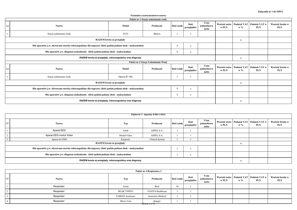 Załącznik nr 1 do SIWZ Formularz asortymentowo-cenowy Pakiet nr 1 Stacja uzdatniania wody Lp Nazwa Model Producent Ilość sztuk Ilość przeglądów 1. Stacja uzdatniania wody ECO Blanca 1 1 Cena jednostkowa netto Wartość netto w PLN RAZEM kwota za przeglądy Podatek VAT Podatek VAT w w% PLN Wartość brutto w PLN x Dla aparatów j.w. oferowana stawka roboczogodziny dla naprawy (ilość godzin podana obok - maksymalna) 9 x Dla aparatów j.w. diagnoza uszkodzenia (ilość godzin podana obok - maksymalna) 9 x RAZEM kwota za przeglądy, roboczogodziny oraz diagnozy x Pakiet nr 2 Stacja Uzdatniania Wody Lp Nazwa Model 1. Stacja uzdatniania wody Option R7 40L Producent Ilość sztuk Ilość przeglądów 1 1 Cena jednostkowa netto Wartość netto w PLN RAZEM kwota za przeglądy Podatek VAT Podatek VAT w w% PLN Wartość brutto w PLN x Dla aparatów j.w. oferowana stawka roboczogodziny dla naprawy (ilość godzin podana obok - maksymalna) 9 x Dla aparatów j.w. diagnoza uszkodzenia (ilość godzin podana obok - maksymalna) 9 x RAZEM kwota za przeglądy, roboczogodziny oraz diagnozy x Pakiet nr 3 Aparaty EMG i EEG LP. Nazwa Typ Producent Ilość sztuk Ilość przeglądów 1. Aparat EEG Astek ASPEL S.A. 1 1 2. Aparat EEG moduł Video Moduł Video ASPEL S.A. 1 1 3. Aparat do EMG Keypoint Clinical System 1 1 Dla aparatów j.w. oferowana stawka roboczogodziny dla naprawy (ilość godzin podana obok - maksymalna) 1 x Dla aparatów j.w. diagnoza uszkodzenia (ilość godzin podana obok - maksymalna) 1 x Cena jednostkowa netto Wartość netto w PLN RAZEM kwota za przeglądy Podatek VAT Podatek VAT w w% PLN Wartość brutto w PLN x RAZEM kwota za przeglądy, roboczogodziny oraz diagnozy x Pakiet nr 4 Respiratory I LP. Nazwa Typ Producent Ilość sztuk Ilość przeglądów 1. Respirator Avian Bird 18 1 2. Respirator BEAR 750PSV VIASYS Healthcare 1 1 3. Respirator FABIAN Acutronic Acutronic-Medical 1 1 4. Respirator Micro Vent draeger 1 1 Strona 1 z 15 Cena jednostkowa netto Wartość netto w PLN Podatek VAT Podatek VAT w w% PLN Wartość brutto w PLN 5. Respirator 6. Respirator-zestaw NCPAP TRANS.NEWPACK PNEUPAC 2 1 INFANT FLOW ADVANCE VIASYS 1 1 RAZEM kwota za przeglądy x Dla aparatów j.w. oferowana stawka roboczogodziny dla naprawy (ilość godzin podana obok - maksymalna) 12 x Dla aparatów j.w. diagnoza uszkodzenia (ilość godzin podana obok - maksymalna) 13 x RAZEM kwota za przeglądy, roboczogodziny oraz diagnozy x Pakiet nr 5 Respiratory II LP. Nazwa Typ 0 Ilość sztuk Ilość przeglądów 1 Respirator BENNETT 840 BENNETT 13 1 2 Respirator BENNETT740 BENNETT 2 1 3 Respirator NPB 840 Nellcor Puritan Bennet 5 1 RAZEM kwota za przeglądy 20 x Dla aparatów j.w. diagnoza uszkodzenia (ilość godzin podana obok - maksymalna) 20 x RAZEM kwota za przeglądy, roboczogodziny oraz diagnozy Typ 1. Łóżko PMS-H-75 #ADR! Ilość sztuk Ilość przeglądów NOVAK 3 1 1 1 3. Łóżko porodowe AVE FAMED ŻYWIECKA FABRYKA SPRZĘTU Borcad 2 1 4. Łóżko specjalistyczne Łóżko specjalistyczne ____________ 2 1 5. Łóżko szpitalne 890+7271+7271+974 Merivaara/Finlandia 5 1 6. Łóżko szpitalne ADATTO Merivaara/Finlandia 16 1 7. Łóżko szpitalne AvantGuard 1200 Hill-Rom 26 1 8. Łóżko szpitalne AVANTGUARD 1200 W7 Hill-Rom 1 1 9. Łóżko szpitalne AVANTGUARD 1600 ABILITY Hill-Rom 3 1 10. Łóżko szpitalne AVANTGUARD 1600 ABILITY LI 160A2 sca Hill-Rom 9 1 11. Łóżko szpitalne łóżko intensywnej terapii Linet 4 1 12. Łóżko szpitalne Łóżko specjalistyczne Merivaara/Finlandia 27 1 13. Łóżko szpitalne Łóżko z materacem dla noworodków ____________ 5 1 14. Łóżko szpitalne Total Care Hill-Rom 3 1 2. Łóżko do pionizacji Podatek VAT Podatek VAT w w% PLN x Pakiet nr 6 Łóżka Nazwa Wartość netto w PLN x Dla aparatów j.w. oferowana stawka roboczogodziny dla naprawy (ilość godzin podana obok - maksymalna) LP. Cena jednostkowa netto LP04.0 Strona 2 z 15 Wartość brutto w PLN 15. Łóżko szpitalne VIVO, noworodkowe STOLTER Sp.zo.o. 5 1 RAZEM kwota za przeglądy x Dla aparatów j.w. oferowana stawka roboczogodziny dla naprawy (ilość godzin podana obok - maksymalna) 4 x Dla aparatów j.w. diagnoza uszkodzenia (ilość godzin podana obok - maksymalna) 2 x RAZEM kwota za przeglądy, roboczogodziny oraz diagnozy x Pakiet nr 7 Aparaty do znieczulenia II LP. Nazwa 1 Aparat do znieczulenia ogólnego Typ Producent Ilość sztuk Ilość przeglądów Blease Sirius 990 Spacelabs Healthcare 9 1 Cena jednostkowa netto Wartość netto w PLN RAZEM kwota za przeglądy Podatek VAT Podatek VAT w w% PLN Wartość brutto w PLN x Dla aparatów j.w. oferowana stawka roboczogodziny dla naprawy (ilość godzin podana obok - maksymalna) 25 x Dla aparatów j.w. diagnoza uszkodzenia (ilość godzin podana obok - maksymalna) 20 x RAZEM kwota za przeglądy, roboczogodziny oraz diagnozy x Pakiet nr 8 Alkomaty LP. Nazwa Typ Producent Ilość sztuk Ilość przeglądów 1. Alkomat IV CM USA, Intoximeters, Inc(dostawca:TransCom International ) 3 2 Dla aparatów j.w. oferowana stawka roboczogodziny dla naprawy (ilość godzin podana obok - maksymalna) 3 x Dla aparatów j.w. diagnoza uszkodzenia (ilość godzin podana obok - maksymalna) 1 x Cena jednostkowa netto Wartość netto w PLN RAZEM kwota za przeglądy Podatek VAT Podatek VAT w w% PLN Wartość brutto w PLN x RAZEM kwota za przeglądy, roboczogodziny oraz diagnozy x Pakiet nr 9 Inkubatory LP. Nazwa Typ Producent Ilość sztuk Ilość przeglądów 1. Inkubator 371 THERMO FISCHER SCIENTIFIC/ NIEMCY 1 1 2. Inkubator GIRAFFE GE DATEX OHMEDA 2 1 3. Inkubator ID 37SI DiaHem-POL Sp. z o.o. 1 1 4. Inkubator ID-375 INCUBAT DiaMed 1 1 3 1 1 1 1 1 5. Stanowisko do resuscytacji noworodka SRN-10 Unimed Zakład Urządzen Medycznych 6. Stanowisko do resuscytacji noworodka SRN-10M Unimed Zakład Urządzen Medycznych 7. Resuscytator Resuscytator dla dzieci Strona 3 z 15 Cena jednostkowa netto Wartość netto w PLN Podatek VAT Podatek VAT w w% PLN Wartość brutto w PLN RAZEM kw