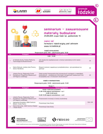 seminarium - zaawansowane materiały budowlane 23.09.2015 expo-łódź (al. politechniki 4) zapisz się! formularz rejestracyjny pod adresem www.rsi.lodzkie.pl Lp. CZĘŚĆ WYKŁADOWA Rozpoczęcie godz. 9:30 – zakończenie godz. 10.30 Temat wystąpienia 9.30 – 10.30 Prelegent Czas 1 dr Elżbieta Syrda, Polska Platforma Technologiczna Budownictwa Jak skutecznie współpracować w branży budowlanej na linii nauka – biznes? 20 2 Marta Walczak, Łódzka Izba Przemysłowo-Handlowa Eksport motorem napędowym przedsiebiorstwa – jak sprzedawać za granicą? 20 3 Jolanta Pacura, Regionalny Punkt Kontaktowy Programów Badawczych UE Regionu Łódzkiego Gdzie szukać finansowania dla innowacyjnych rozwiązań w materiałach budowlanych – podstawowe informacje o programach badawczych Unii Europejskiej oraz o funduszach strukturalnych 20 CZĘŚC II WARSZATOWA Rozpoczęcie godz. 10.30 – zakończenie godz. 15.30 Grupa 1: Lp. Prelegent Temat wystąpienia 10.30-11.00 kawa powitalna 11.00-13.00 zajęcia warsztatowe – cz.1 13.00-13.30 lunch 13.30-15.30 zajęcia warsztatowe – cz.2 1 Jolanta Pacura, Regionalny Punkt Kontaktowy Programów Badawczych UE Regionu Łódzkiego Finansowanie innowacji w branży budowlanej 2 Agnieszka Kowalska, ASM-Centrum Badań i Analiz Rynku Prezentacja Case Study 3 Marek Skrzyński, ASM-Centrum Badań i Analiz Rynku Prezentacja Case Study Projekt współfinansowany przez Unię Europejską z Europejskiego Funduszu Rozwoju Regionalnego oraz budżetu Samorządu Województwa Łódzkiego. Fundusze Europejskie dla rozwoju regionu łódzkiego. Czas 120+120 seminarium - zaawansowane materiały budowlane 23.09.2015 expo-łódź (al. politechniki 4) zapisz się! formularz rejestracyjny pod adresem www.rsi.lodzkie.pl Grupa 2: Lp. 1 2 3 Prelegent Vladimir Gumilar Construction Claster of Slovenia Grzegorz Jegier Klaster Innowacji Budowlanych dr Elżbieta Syrda Polska Platforma Technologiczna Budownictwa Temat wystąpienia 10.30-11.00 kawa powitalna 11.00-13.00 zajęcia warsztatowe – cz.1 13.00-13.30 lunch 13.30-15.30 zajęcia warsztatowe – cz.2 Czas Klaster jako narzędzie rozwoju branży budowlanej Prezentacja Case Study 120+120 Prezentacja Case Study Grupa 3: Lp. 1 2 3 Prelegent Temat wystąpienia 10.30-11.00 kawa powitalna 11.00-13.00 zajęcia warsztatowe – cz.1 13.00-13.30 lunch 13.30-15.30 zajęcia warsztatowe – cz.2 dr Paweł Kowalski - Uniwersytet Łódzki Tworzenie strategii eksportowej Jakub Wójcik, IZODOM 2000 Prezentacja Case Study Marta Walczak Prezentacja Case Study Łódzka Izba Przemysłowo-Handlowa Czas 120+120 Grupa 4: Lp. 1 2 3 Prelegent Bogumił Sieczkowski Kancelaraia Adwokacka “OBLIGO” Sieczkowski i Spółka Marcin Błędowski Kancelaria Adwokacka „OBLIGO” Sieczkowski i Spółka Bogumił Sieczkowski Kancelaraia Adwokacka „OBLIGO” Sieczkowski i Spółka Temat wystąpienia 10.30-11.00 kawa powitalna 11.00-13.00 zajęcia warsztatowe – cz.1 13.00-13.30 lunch 13.30-15.30 zajęcia warsztatowe – cz.2 Czas Zabezpieczanie transakcji handlowych w branży budowlanej Prezentacja Case Study Prezentacja Case Study Projekt współfinansowany przez Unię Europejską z Europejskiego Funduszu Rozwoju Regionalnego oraz budżetu Samorządu Województwa Łódzkiego. Fundusze Europejskie dla rozwoju regionu łódzkiego. 120+120