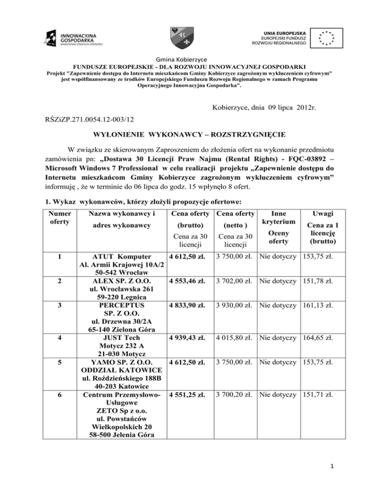 Gmina Kobierzyce FUNDUSZE EUROPEJSKIE - DLA ROZWOJU INNOWACYJNEJ GOSPODARKI Projekt "Zapewnienie dostępu do Internetu mieszkańcom Gminy Kobierzyce zagrożonym wykluczeniem cyfrowym" jest współfinansowany ze środków Europejskiego Funduszu Rozwoju Regionalnego w ramach Programu Operacyjnego Innowacyjna Gospodarka". Kobierzyce, dnia 09 lipca 2012r. RŚZiZP.271.0054.12-003/12 WYŁONIENIE WYKONAWCY – ROZSTRZYGNIĘCIE W związku ze skierowanym Zaproszeniem do złożenia ofert na wykonanie przedmiotu zamówienia pn: „Dostawa 30 Licencji Praw Najmu (Rental Rights) - FQC-03892 – Microsoft Windows 7 Professional w celu realizacji projektu „Zapewnienie dostępu do Internetu mieszkańcom Gminy Kobierzyce zagrożonym wykluczeniem cyfrowym” informuję , że w terminie do 06 lipca do godz. 15 wpłynęło 8 ofert. 1. Wykaz wykonawców, którzy złożyli propozycje ofertowe: Numer oferty 1 2 3 4 5 6 Nazwa wykonawcy i adres wykonawcy ATUT Komputer Al. Armii Krajowej 10A/2 50-542 Wrocław ALEX SP. Z O.O. ul. Wrocławska 261 59-220 Legnica PERCEPTUS SP. Z O.O. ul. Drzewna 30/2A 65-140 Zielona Góra JUST Tech Motycz 232 A 21-030 Motycz YAMO SP. Z O.O. ODDZIAŁ KATOWICE ul. Roździeńskiego 188B 40-203 Katowice Centrum PrzemysłowoUsługowe ZETO Sp z o.o. ul. Powstańców Wielkopolskich 20 58-500 Jelenia Góra Cena oferty Cena oferty (brutto) (netto ) Inne kryterium Cena za 30 licencji Cena za 30 licencji Oceny oferty Uwagi Cena za 1 licencję (brutto) 4 612,50 zł. 3 750,00 zł. Nie dotyczy 153,75 zł. 4 553,46 zł. 3 702,00 zł. Nie dotyczy 151,78 zł. 4 833,90 zł. 3 930,00 zł. Nie dotyczy 161,13 zł. 4 939,43 zł. 4 015,80 zł. Nie dotyczy 164,65 zł. 4 612,50 zł. 3 750,00 zł. Nie dotyczy 153,75 zł. 4 551,25 zł. 3 700,20 zł. Nie dotyczy 151,71 zł. 1 Gmina Kobierzyce FUNDUSZE EUROPEJSKIE - DLA ROZWOJU INNOWACYJNEJ GOSPODARKI Projekt "Zapewnienie dostępu do Internetu mieszkańcom Gminy Kobierzyce zagrożonym wykluczeniem cyfrowym" jest współfinansowany ze środków Europejskiego Funduszu Rozwoju Regionalnego w ramach Programu Operacyjnego Innowacyjna Gospodarka". 7 8 SENETIC Sp. K. ul. Kościuszki 227 40-600 Katowice APEX SYSTEM SP. Z O.O. ul. Zielna 39 00-108 Warszawa 4 944,60 zł. 4 020,00 zł. Nie dotyczy 164,82 zł. 4 538,70 zł. 3 690,00 zł. Nie dotyczy 151,29 zł. 2. Sposób wyliczenia ceny zgodnie ze wzorem zapisanym w pkt. IV Zaproszenia do złożenia oferty : Oferta nr 1. On = ( 4538,70 zł. : 4 612,50 zł. ) x 100 pkt = 98,4 pkt. Oferta nr 2. On = (4 538,70 zł. : 4 553,46 zł. ) x 100 pkt = 99,67 pkt. Oferta nr 3. On = (4 538,70 zł. : 4 833,90 zł. ) x 100 pkt = 93,89 pkt. Oferta nr 4. On = (4 538,70 zł. : 4 939,43 zł.) x 100 pkt = 91,88 pkt. Oferta nr 5. On = (4 538,70 zł. : 4 612,50 zł.) x 100 pkt = 98,4 pkt. Oferta nr 6. On = (4 538,70 zł.: 4 551,25 zł.) x 100 pkt = 99,72 pkt. Oferta nr 7. On = (4 538,70 zł. : 4 944,60 zł.) x 100 pkt = 91,79 pkt. Oferta nr 8 On = (4 538,70 zł.: 4 538,70 zł.) x 100 pkt = 100,00 pkt. Wybrano ofertę najkorzystniejszą t.j. ofertę nr 8 – firmy APEX SYSTEM SP. Z O.O. z siedzibą : ul. Zielna 39, 00-108 Warszawa 3. Uzasadnienie wyboru oferty. W wyniku zaproszenia do złożenia oferty w terminie wymaganym wpłynęło 8 ważnych prawidłowo złożonych ofert. Została wybrana oferta nr 8 zgodnie z kryterium wyboru oferty: cena (waga kryterium 100%), z najwyższą ilością punktów a tym samym z najniższą ceną. Ocena ofert została dokonana zgodnie z zapisami Zaproszenia do złożenia oferty wg. wzoru dotyczącego oceny kryteriów. Z wyłonionym wykonawcą Zamawiający podpisze umowę. Dziękuję wszystkim za złożenie oferty. Monika Penczak ....................................................................... Podpis osoby sporządzającej zamówienie 2