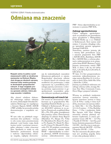 uprawa 24 RZEPAK OZIMY. Poletka doświadczalne Odmiana ma znaczenie PRP – firma odpowiedzialna za nawożenie w systemie PRP SOL. Zabiegi agrotechniczne Rzepak ozimy to jedna z podstawowych roślin w strukturze zasiewów na Dolnym Śląsku. Jest drugą po zbożach uprawą, stanowi więc ważną pozycję w dochodach gospodarstw rolnych. Z tego względu producentom szczególnie zależy na uprawie odmian, które plonują wysoko i stabilnie. nej do indywidualnych warunków klimatyczno-glebowych w rejonie. Bezpośrednia obserwacja odmian w różnych fazach ich rozwoju oraz możliwość ich porównania, a także zapoznanie się z prawidłową technologią uprawy, nawożenia i ochrony, powinny zaprocentować w gospodarstwach uczestników pokazów dobrymi wynikami produkcji. Aby ułatwić rolnikom dokonanie właściwego wyboru odmiany do siewu, Dolnośląski Ośrodek Doradztwa Rolniczego we współpracy z firmami Rapool, BASF, ADOB i PRP od kilku lat prowadzi poletka demonstracyjne z rzepakiem ozimym. Demostracje od trzech lat W tym roku na poletkach zorganizowano dwa spotkania ‒ wiosną w celu oceny stanu przezimowania plantacji i pod koniec maja, kiedy można ocenić i porównać poszczególne odmiany, a także oszacować plon. Spotkania te miały na celu ułatwienie producentom decyzji o wyborze odpowiedniej odmiany rzepaku, najlepiej dostosowa- Od trzech lat demonstracje zlokalizowane są w gospodarstwie Małopolskiej Hodowli Roślin sp. z o.o. Oddział w Kobierzycach. W sezonie 2014/2015 założono je na polach w Żurawicach, na glebach klasy III a, IVa, IVb, gdzie przedplonem była pszenica ozima. Demonstracje obejmują 12 odmian firmy Rapool (Marathon F1, Sherpa F1, Visby F1, Mendelson F1, Thure F1, Aurora F1, Popular F1, Shrek F1, Mentor F1, Garou F1, Mendel F1, Mercedes F1). W projekcie uczestniczą, oprócz właściciela odmian także BASF ‒ odpowiedzialny za ochronę plantacji, ADOB dostarczający nawozy mikroelementowe oraz 07/2015 twój doradca ROLNICZY RYNEK Całość zabiegów agrotechnicznych na poletkach jest prowadzona przez specjalistów z Małopolskiej Hodowli Roślin sp. z o.o. Oddział w Kobierzycach. Siew nasion miał miejsce 3 września ubiegłego roku, po uprzedniej uprawie agregatem Smaragd 9/600 KA. Nawożenie, zarówno jesienią, jak i wiosną było prowadzone m.in. z użyciem preparatów firm PRP i ADOB (SOL, Basfoliary, ADOB Bor i ADOB Mn), a ochrona plantacji z wykorzystaniem m.in. preparatów firmy BASF (Butisan, Caryx). Jesienią zastosowano nawóz PRP SOL w ilości 2 dt/ ha, 0,9 dt/ha P2O5, 1,56 dt/ha K2O, 0,46 dt/ha S, 0,86 dt/ha N. W fazie 4-6 liści przeprowadzono nawożenie mikroelementowe stosując nawozy Basfoliar 12-4-6+S+amino w ilości 5l/ha, Adob Mn 1l/ha i Adob Bor 1,5l/ha. Jesienią na poletkach wykonano też zabiegi ochrony roślin, stosując Butisan Star Max, Command, Caryx, Decis Mega i preparat Labrador. Wiosną na poletkach trzykrotnie wysiewano nawozy mineralne ‒ łącznie nawożono azotem w ilości 2,33 dt N/ha i siarką w ilości 0,27 dt/ha, stosowano też nawozy dolistne Adob Mo – 0,1 l/ha, Basfoliar 12-4-6+S+amino ‒ 5 l/ha, Basfoliar Extra ‒ 5 l/ha i trzykrotnie Adob Bor (łącznie 4,02 l/ha). Zabiegi wiosennej ochrony plantacji wykonano trzykrotnie, w marcu preparatem Caryx 240 SC – 1,0 l/ha i Nurelle D 550 EC – 0,6 l/ha, pod koniec kwietnia preparatem Proteus 110 OD – 0,6 l/ha oraz w maju preparatem Marvik 240 EW – 0,2 l/ha i Propulse 250 SE – 1 l/ha. Nie bez znaczenia dla jakości plantacji jest przebieg pogody, który w tym roku pokazuje tabela 1. uprawa 25 Tabela 1. Przebieg pogody na poletkach doświadczalnych Temperatura Opady styczeń luty marzec kwiecień do 15 maja 2,6 2,6 2,0 5,8 9,5 13,4 17,8 12,6 15,0 10,7 18,2 25,3 26,6 - 1,1 -2,7 -9,1 - 6,1 - 6,3 -3,3 -1,2 2,9 90,6 49,2 13,4 17,6 38,0 9,4 23,0 16,0 7,4 17 20 13 19 18 8 12 9 7 wrzesień październik średnia dobowa 15,8 11,2 6,8 maksymalna 27,2 23,7 minimalna 2,0 mm dni listopad grudzień Tabela 2. Planowanie wybranych odmian rzepaku ozimego według badań COBORU Poletka w Kobierzycach 2014 dt/ha ZDOO na Dolnym Śląsku 2014 dt/ha COBORU 2012-2014 dt/ha Sherpa 5,32 6,28 49,8 (110% wzorca) Marathon 5,25 5,69 51,4 (110% wzorca) Mercedes 5,63 6,28 51,6 (112% wzorca) Visby 5,51 6,16 51,4 (111% wzorca) Odmiana Sądząc po stanie plantacji w maju, można przypuszczać, że plony będą wysokie i dobrej jakości, podobnie jak w poprzednim roku, kiedy wszystkie odmiany plonowały na bardzo wysokim poziomie, a średni plon z całości demonstracji wyniósł 5,28 t/ha. Wartości tegorocznych plonów zostaną zamieszczone po zbiorach na stronie internetowej www.dodr.pl. Popularne mieszańce W kolekcji prezentowane są odmiany mieszańcowe, coraz bardziej popularne wśród producentów. Odmiany te są tworzone poprzez skrzyżowanie form rodzicielskich, przy wykorzystaniu zjawiska heterozji, które przejawia się dużym plonem nasion, wigorem i bujnością roślin w pierwszym pokoleniu. Rośliny szybko wschodzą i bujnie rosną, nawet w niekorzystnych warunkach pogodowych. Szybki rozwój systemu korzeniowego powoduje dobre wykorzystanie składników pokarmowych i intensywniejszy wzrost roślin, które skutecznie konkurują z chwastami. Odmiany te są w większym stopniu zimotrwałe i mrozoodporne, dzięki czemu wiosną szybciej rozpoczynają wegetację i lepiej regenerują uszkodzenia mrozowe. Lepsze od populacyjnych W ostatnich latach, w doświadczeniach PDOiR, odmiany mieszańcowe plonowały średnio od kilku do kilkunastu procent (6-13%) lepiej od odmian populacyjnych. Natomiast w warunkach opóźnionego i późnego siewu, redukcja plonu była średnio do ok. 20% mniejsza. Również pod względem wartości technologicznej, odmiany heterozyjne wyróżniają się korzystnie ‒ zaolejenie nasion jest wyższe nawet o kilkanaście procent w porównaniu do odmian populacyjnych. Odmiany w Żurawicach Wśród rzepaków prezentowanych na naszych poletkach są odmiany wysi