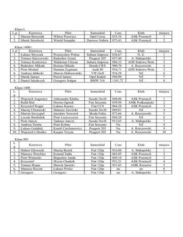 Klasa L L.p Kierowca 1. Marian Bożyniak 2. Marek Strzelecki Pilot Wiktor Pisowicz Witold Sznajder Samochód Opel Corsa Daewoo Nubira Czas 835,54 875,43 Klub ASK Przemyśl ASK Przemyśl miejsce 1 2 Klasa 1400+ L.p Kierowca 1. Łukasz Stryczek 2. Tomasz Starczewski 3. Tomasz Kozłowicz 4. Radosław Mikuła 5. Piotr Moskal 6. Andrzej Jabłecki 7. Marek Janusz 8. Daniel Jakubczyk Pilot Przemysław Pielon Radosław Gonet Waldemar Chrzan Bożena Mikuła Damian Zygmunt Marcin Dobrowolski Paweł Janusz Grzegorz Sołgan Samochód Subaru Impreza Peugeot 205 Subaru Impreza Honda CRX Audi 80 VW Golf Opel Kadett BMW 316 Czas 836,67 857,40 888,32 900,70 916,71 934,28 949,90 1101,72 Klub N. Z. A. Małopolski ADS Stalowa Wola A. Rzeszowski ADS Stalowa Wola NZ NZ NZ miejsce 1 2 3 4 5 6 7 8 Pilot Samochód Czas Klub miejsce Aleksander Klatka Dorota Ogórek Łukasz Kurasz Mateusz Zawirski Jarosław Noworol Piotr Leszczyszyn Tadeusz Janczy Piotr Koban Kamil Ciechanowicz Kacper Trzyna Suzuki Swift Fiat Seicento Fiat CCS Suzuki Swift Skoda Fabia Fiat Seicento Suzuki Swift Fiat Seicento Peugeot 205 Peugeot 205 ASK Przemyśl AMK Podkarpacki ASK Przemyśl NZ A. Rzeszowski NZ A. Małopolski NZ A. Rzeszowski A. Rzeszowski 1 2 3 4 5 6 7 8 9 10 Pilot Samochód Czas Klub miejsce Fiat 126p Fiat 126p Fiat 126p Fiat 126p Fiat 126p Fiat 126p Fiat 126p 816,86 865,05 869,10 921,21 951,83 nu nu A. Małopolski ASK Przemyśl ASK Przemyśl ASK Przemyśl AMK Rzeszów nz A. Małopolski 1 2 3 4 5 6 7 Klasa 1400 L. Kierowca p. 1. Wojciech Augustyn 2. Rafał Biel 3. Krzysztof Kogut 4. Maciej Chruścicki 5. Marcin Szczygieł 6. Leszek Bardzińsk 7. Piotr Janczy 8. Andrzej Tereba 9. Łukasz Gołąbek 10. Wojciech Cebeńko Klasa 903 L. Kierowca p. 1. Hubert Głowacki 2. Mateusz Worcbiec 3. Piotr Winiarski 4. Krzysztof 5. Tomasz Rząsa 6. Mateusz Rscioń 7. Grzegorz Maciej Bożek Konrad Tadla Bogusław Janda JEcyta Chudzik Sławek Sarecki Łukasz Piwko Grzegorz 848,06 859,94 864,38 869,01 873,66 884,20 915,65 Nu Nu Nu