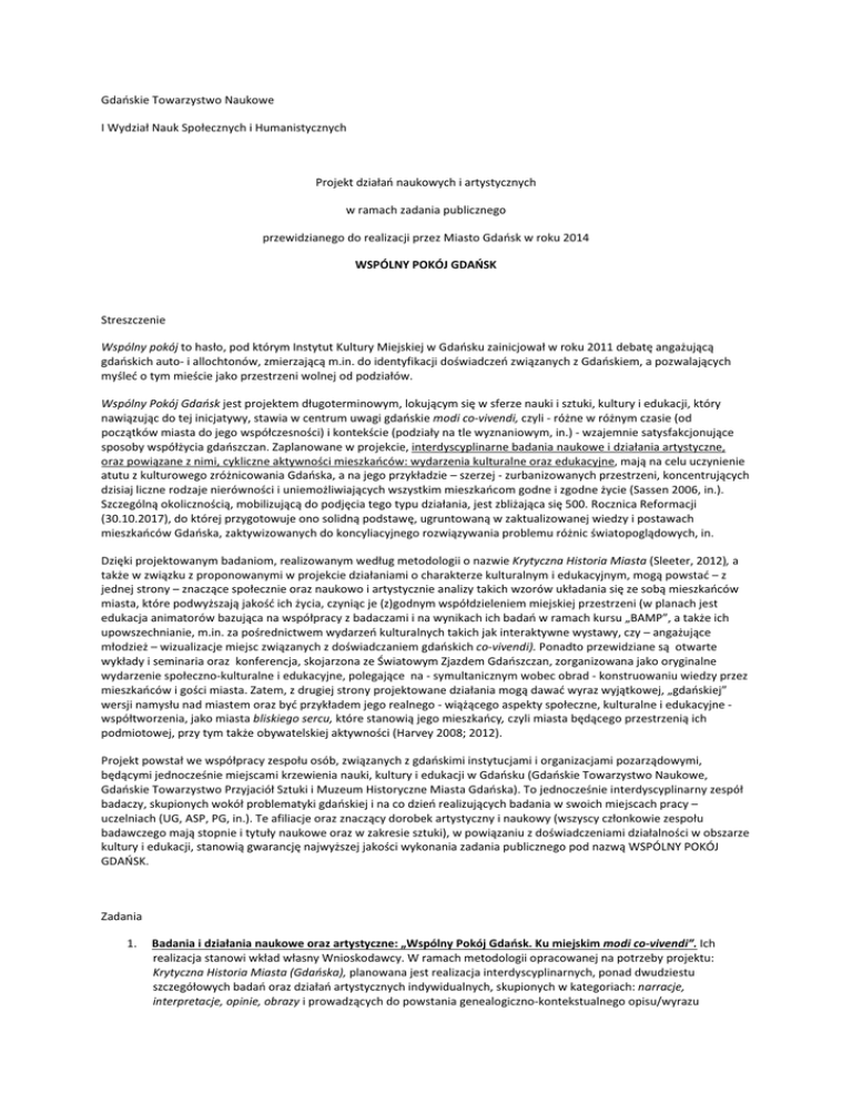 Gdańskie Towarzystwo Naukowe I Wydział Nauk Społecznych i Humanistycznych Projekt działań naukowych i artystycznych w ramach zadania publicznego przewidzianego do realizacji przez Miasto Gdańsk w roku 2014 WSPÓLNY POKÓJ GDAŃSK Streszczenie Wspólny pokój to hasło, pod którym Instytut Kultury Miejskiej w Gdańsku zainicjował w roku 2011 debatę angażującą gdańskich auto- i allochtonów, zmierzającą m.in. do identyfikacji doświadczeń związanych z Gdańskiem, a pozwalających myśleć o tym mieście jako przestrzeni wolnej od podziałów. Wspólny Pokój Gdańsk jest projektem długoterminowym, lokującym się w sferze nauki i sztuki, kultury i edukacji, który nawiązując do tej inicjatywy, stawia w centrum uwagi gdańskie modi co-vivendi, czyli - różne w różnym czasie (od początków miasta do jego współczesności) i kontekście (podziały na tle wyznaniowym, in.) - wzajemnie satysfakcjonujące sposoby współżycia gdańszczan. Zaplanowane w projekcie, interdyscyplinarne badania naukowe i działania artystyczne, oraz powiązane z nimi, cykliczne aktywności mieszkańców: wydarzenia kulturalne oraz edukacyjne, mają na celu uczynienie atutu z kulturowego zróżnicowania Gdańska, a na jego przykładzie – szerzej - zurbanizowanych przestrzeni, koncentrujących dzisiaj liczne rodzaje nierówności i uniemożliwiających wszystkim mieszkańcom godne i zgodne życie (Sassen 2006, in.). Szczególną okolicznością, mobilizującą do podjęcia tego typu działania, jest zbliżająca się 500. Rocznica Reformacji (30.10.2017), do której przygotowuje ono solidną podstawę, ugruntowaną w zaktualizowanej wiedzy i postawach mieszkańców Gdańska, zaktywizowanych do koncyliacyjnego rozwiązywania problemu różnic światopoglądowych, in. Dzięki projektowanym badaniom, realizowanym według metodologii o nazwie Krytyczna Historia Miasta (Sleeter, 2012), a także w związku z proponowanymi w projekcie działaniami o charakterze kulturalnym i edukacyjnym, mogą powstać – z jednej strony – znaczące społecznie oraz naukowo i artystycznie analizy takich wzorów układania się ze sobą mieszkańców miasta, które podwyższają jakość ich życia, czyniąc je (z)godnym współdzieleniem miejskiej przestrzeni (w planach jest edukacja animatorów bazująca na współpracy z badaczami i na wynikach ich badań w ramach kursu „BAMP”, a także ich upowszechnianie, m.in. za pośrednictwem wydarzeń kulturalnych takich jak interaktywne wystawy, czy – angażujące młodzież – wizualizacje miejsc związanych z doświadczaniem gdańskich co-vivendi). Ponadto przewidziane są otwarte wykłady i seminaria oraz konferencja, skojarzona ze Światowym Zjazdem Gdańszczan, zorganizowana jako oryginalne wydarzenie społeczno-kulturalne i edukacyjne, polegające na - symultanicznym wobec obrad - konstruowaniu wiedzy przez mieszkańców i gości miasta. Zatem, z drugiej strony projektowane działania mogą dawać wyraz wyjątkowej, „gdańskiej” wersji namysłu nad miastem oraz być przykładem jego realnego - wiążącego aspekty społeczne, kulturalne i edukacyjne współtworzenia, jako miasta bliskiego sercu, które stanowią jego mieszkańcy, czyli miasta będącego przestrzenią ich podmiotowej, przy tym także obywatelskiej aktywności (Harvey 2008; 2012). Projekt powstał we współpracy zespołu osób, związanych z gdańskimi instytucjami i organizacjami pozarządowymi, będącymi jednocześnie miejscami krzewienia nauki, kultury i edukacji w Gdańsku (Gdańskie Towarzystwo Naukowe, Gdańskie Towarzystwo Przyjaciół Sztuki i Muzeum Historyczne Miasta Gdańska). To jednocześnie interdyscyplinarny zespół badaczy, skupionych wokół problematyki gdańskiej i na co dzień realizujących badania w swoich miejscach pracy – uczelniach (UG, ASP, PG, in.). Te afiliacje oraz znaczący dorobek artystyczny i naukowy (wszyscy członkowie zespołu badawczego mają stopnie i tytuły naukowe oraz w zakresie sztuki), w powiązaniu z doświadczeniami działalności w obszarze kultury i edukacji, stanowią gwarancję najwyższej jakości wykonania zadania publicznego pod nazwą WSPÓLNY POKÓJ GDAŃSK. Zadania 1. Badania i działania naukowe oraz artystyczne: „Wspólny Pokój Gdańsk. Ku miejskim modi co-vivendi”. Ich realizacja stanowi wkład własny Wnioskodawcy. W ramach metodologii opracowanej na potrzeby projektu: Krytyczna Historia Miasta (Gdańska), planowana jest realizacja interdyscyplinarnych, ponad dwudziestu szczegółowych badań oraz działań artystycznych indywidualnych, skupionych w kategoriach: narracje, interpretacje, opinie, obrazy i prowadzących do powstania genealogiczno-kontekstualnego opisu/wyrazu 2. 3. 4. 5. 6. artystycznego – gdańskich, a następnie skonceptualizowanych w perspektywie współczesnego miasta – miejskich modi co-vivendi, jako sposobów wzajemnie satysfakcjonującego współżycia mieszkańców Gdańska/współczesnego miasta. Realizatorzy tych badań naukowych i działań artystycznych, to osoby ze środowiska GTN i GTPS, ale z afiliacjami – m.in. - Uniwersytetu Gdańskiego, Akademii Sztuk Pięknych w Gdańsku oraz Muzeum Historycznego Miasta Gdańska. Działania badawcze – naukowe i artystyczne – planowane są w formule otwartej, interaktywnej, angażującej mieszkańców Gdańska w charakterze uczestników-współbadaczy, dyskutantów, ekspertów. Opisana dalej konferencja oraz otwarte seminaria będą możliwe dzięki pracy stworzonego na potrzeby tego projektu Zespołu Badawczego. Szczegółowy opis zamierzeń badawczych stanowi załącznik do Wniosku. Konferencja: „Wspólny Pokój Gdańsk. Tworzymy go razem” – działanie zaplanowane jako towarzyszące Światowemu Dniu Gdańszczan, 14 lipca 2014 roku. Nietypowa konferencja, na której mówcy – badacze (artyści i naukowcy) prezentujący swoje badania (w formule ex-ante, „na wejściu”), w zakresie zaadaptowanej do lokalnych potrzeb metody: Krytyczna His