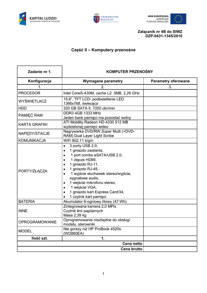 Załącznik nr 4B do SIWZ DZP-0431-1345/2010 Część II – Komputery przenośne KOMPUTER PRZENOŚNY Zadanie nr 1. Konfiguracja Wymagane parametry Parametry oferowane 1. 2. 3. PROCESOR WYŚWIETLACZ HDD PAMIĘĆ RAM KARTA GRAFIKI NAPĘDY/STACJE KOMUNIKACJA PORTY/ZŁĄCZA BATERIA INNE OPROGRAMOWANIE MODEL Ilość szt. Intel Corei5-430M, cache L2: 3MB, 2,26 GHz 15,6”, TFT LCD- podświetlenie LED 1366x768, świecąca 320 GB SATA II, 7200 obr/min DDR3 4GB 1333 MHz Jeden bank pamięci ma pozostać wolny ATI Mobility Radeon HD 4330 512 MB wydzielonej pamięci wideo Nagrywarka DVD/RW Super Multi (+DVDRAM) Dual Layer Light Scribe WiFi 802.11 b/g/n 3 porty USB 2.0, 1 gniazdo zasilania, 1 port combo eSATA/USB 2.0, 1 złącze HDMI, 1 gniazdo RJ-11, 1 gniazdo RJ-45, 1 wyjście słuchawek stereo/wyjście, sygnałowe audio, 1 wejście mikrofonu stereo, 1 wejście VGA, 1 gniazdo kart Express Card/34, 1 czytnik kart pamięci Akumulator 6-ogniowy litowy (47 Wh) Zintegrowana kamera 2,0 MPix Czytnik linii papilarnych Masa 2,39 kg Oprogramowanie niezbędne do obsługi modelu, sterowniki Nie gorszy niż HP ProBook 4520s (WD860EA) 1. Cena netto Cena brutto 1 KOMPUTER PRZENOŚNY Zadanie nr 2 Konfiguracja Wymagane parametry Parametry oferowane 1. 2. Intel® Core™ i3-330M (3M Cache, 2.13 GHz) 15,6" LED HD (1 366 x 768) 16:9 błyszcząca 500 GB ( SATA 5400 obr/min) DDR3, 4 GB (max. pojemnosc 8 GB) nVidia® 330M 1024 MB Karta HD Audio Wbudowane głośniki 1,5 W– szt.2 Wbudowany mikrofon DVD Super Multi Dual Layer 10/100/1000 Mbps Gigabit Ethernet WLAN 802.11b/g/n Bluetooth ( v2.1 + EDR) VGA (RGB) 15-pin D-Sub Line-out , Czytnik kart pamięci 3 w 1 (SD, SDHC, MMC), 4 x USB 2.0 , HDMI, ExpressCard 34, E-SATA, Wejście mikrofonu Li-ion, 6-ogniw, akumulator (czas pracy) 3,5 h 3. PROCESOR WYŚWIETLACZ HDD PAMIĘĆ RAM KARTA GRAFIKI DŹWIĘK NAPĘDY/STACJE KOMUNIKACJA PORTY/ZŁĄCZA BATERIA URZĄDZENIE WSKAZUJĄCE INNE TORBA OPROGRAMOWANIE MODEL Ilość szt. Touch Pad Waga 2,6 kg Zasilacz sieciowy Kensington Lock Wbudowana kamera 1,3 Mpix TARGUS 15-16" TBC002EU Oprogramowanie niezbędne do obsługi modelu, sterowniki Nie gorszy niż Samsung R580-JS0 APL 3 Wartość netto (szt. 3) Wartość brutto ( szt.3) 2 3